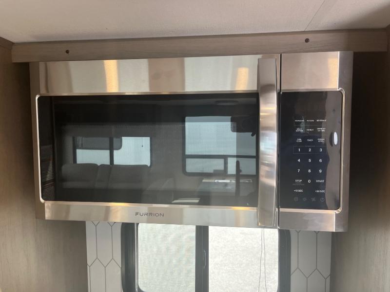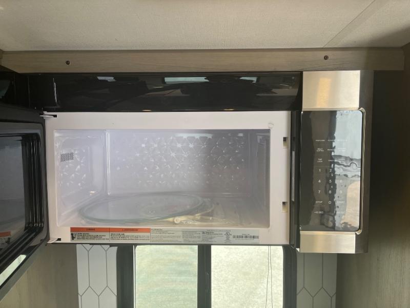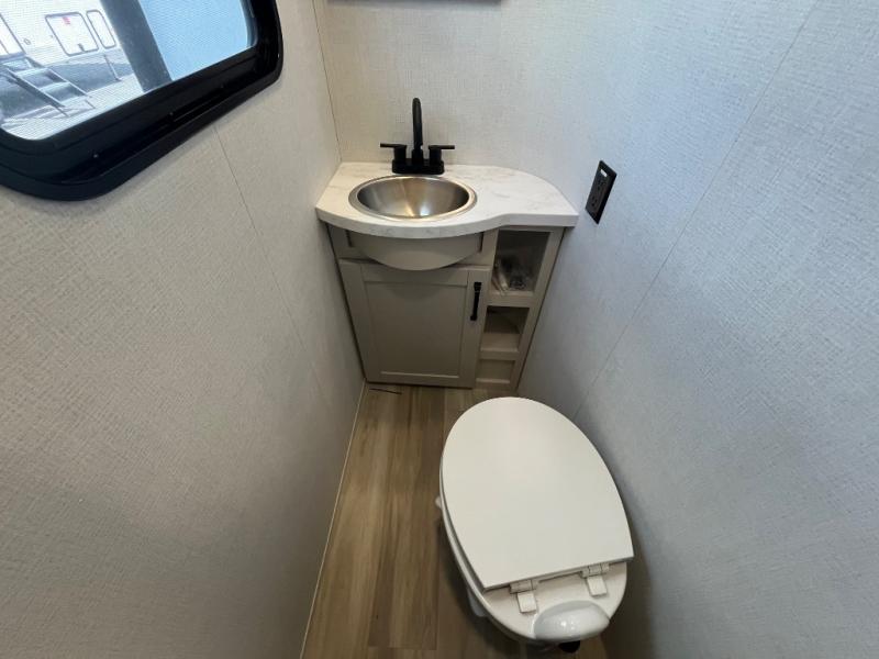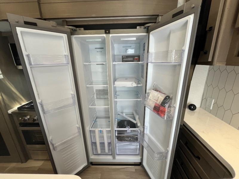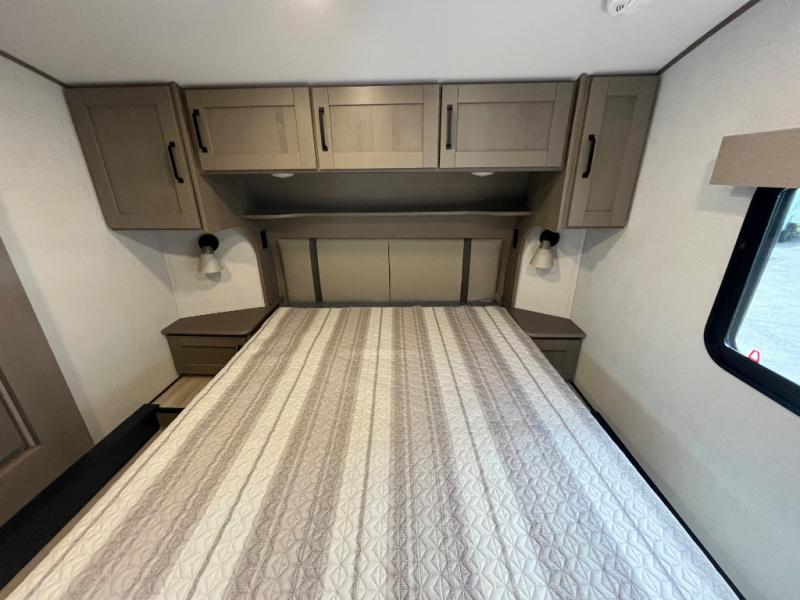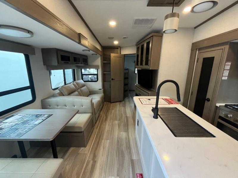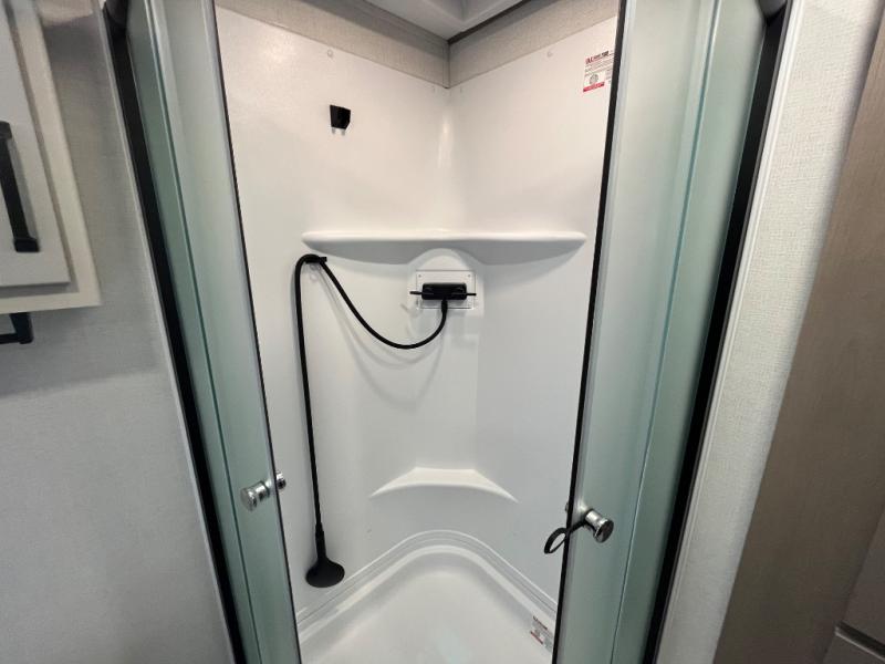 Are you looking to travel with your family and friends and want enough space for everyone to be comfortable? Step inside using the Step Above wit lift assist entry steps, to find a private bunkhouse in the rear of this fifth wheel which offers a slide out flip bunk above a tri-fold sofa, a 44" bunk bed with window and storage below, plus its very own private half bathroom. The theater seating or tri-fold sofa option is a great place to unwind at night in front of the entertainment center with a 40" LED HDTV and fireplace below it. There is a booth dinette or you can a swivel dinette option to dine at, and the kitchen island will provide more counter space to prep meals. You will find full amenities including a 16 cu. ft. 12V refrigerator and a hutch. This fifth wheel also includes a double entry bathroom with a radius shower, and you can wake up refreshed each morning after sleeping on your own queen bed.