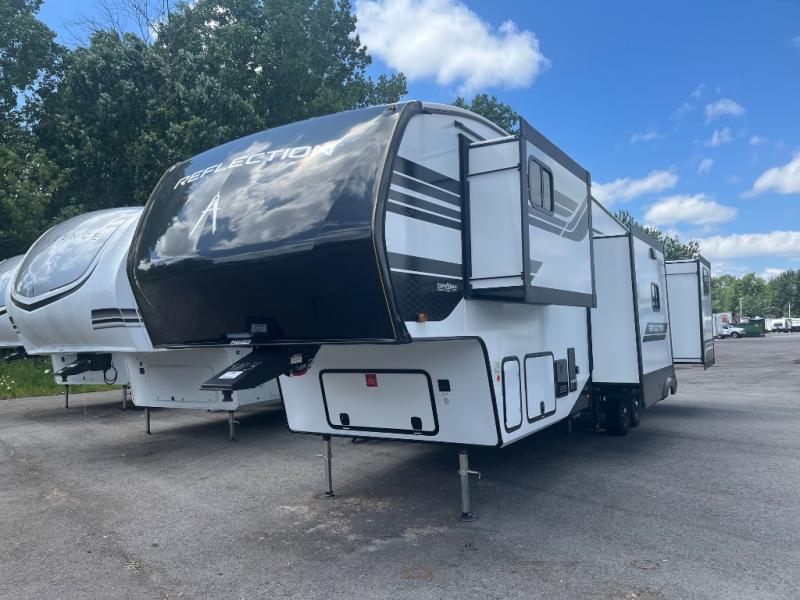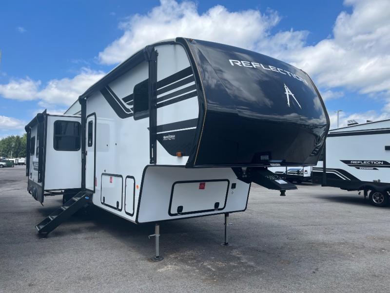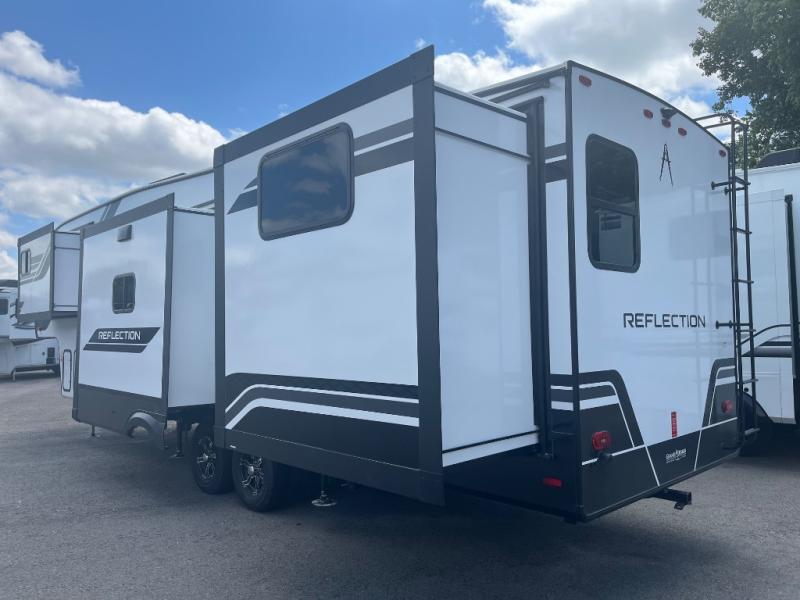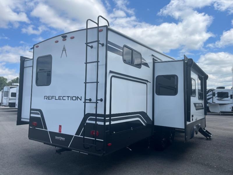 With any Reflection fifth wheel by Grand Design, you will have a solar panel for off-grid camping and a 60 amp charge controller and inverter prep, a Universal All-In-One docking station, unobstructed pass-through storage, and Goodyear Endurance tires. Each is constructed of gel coat exterior sidewalls, residential 5" truss rafters, walk-on roof decking, a fiberglass and radiant foil roof and front cap insulation plus laminated aluminum framed side walls, roof and end walls in slide rooms. Head inside to enjoy residential hardwood cabinet doors, premium Congoleum flooring, a spacious shower with a glass door, and many more comforts!