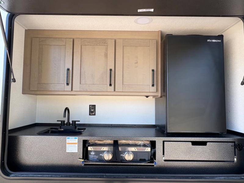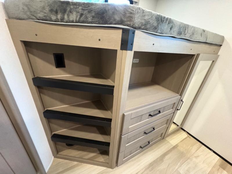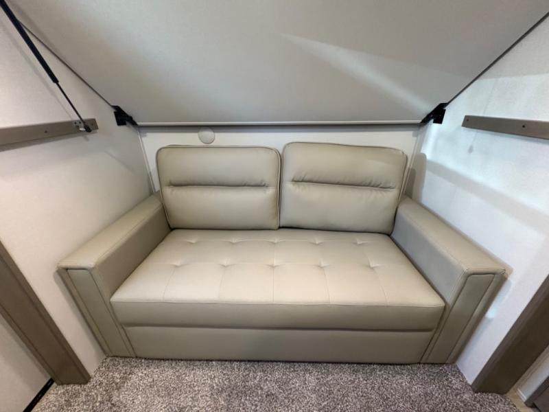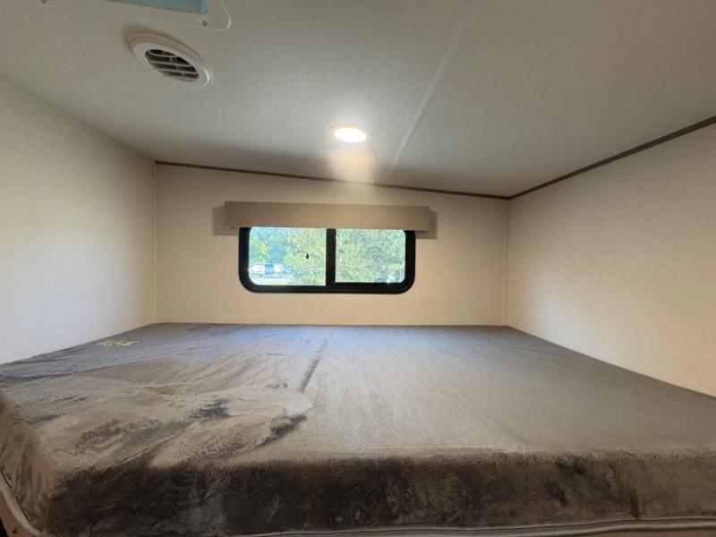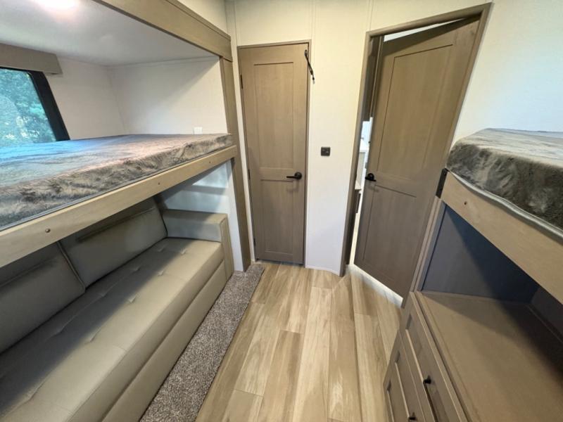 Private Bunkhouse: Located at the rear, the bunkhouse features a slide-out flip bunk above a tri-fold sofa, a 44" bunk bed with a window and storage below, and its own private half bathroom. This setup provides a comfortable and private space for children or guests.