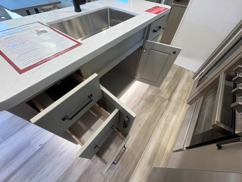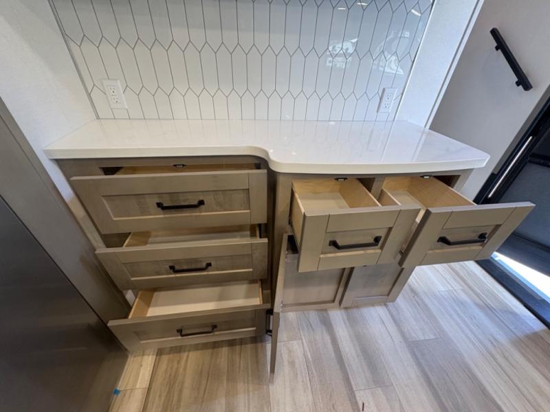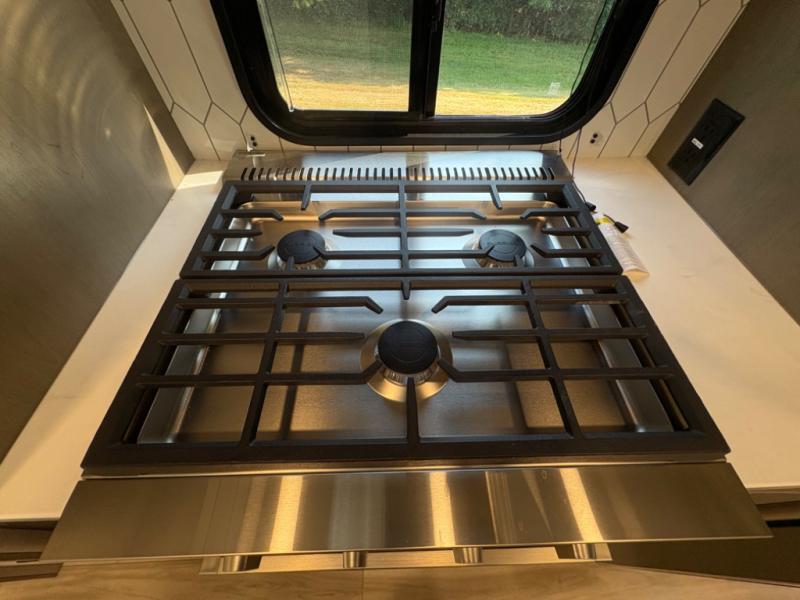 Kitchen and Living Area: The central area includes a kitchen island, a 16 cu. ft. 12V refrigerator, a three-burner cooktop, and a spacious living area with theater seating and a 40" LED TV with a fireplace, creating a perfect space for relaxation and entertainment.