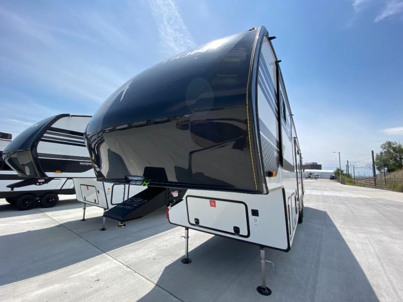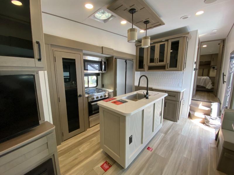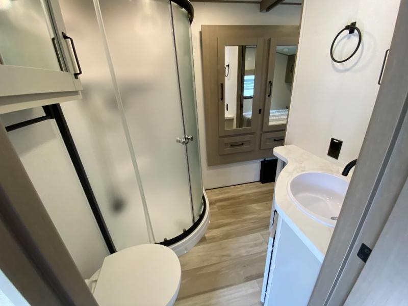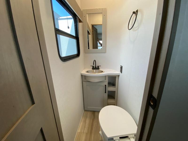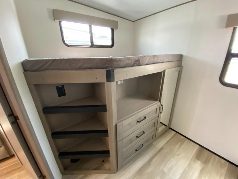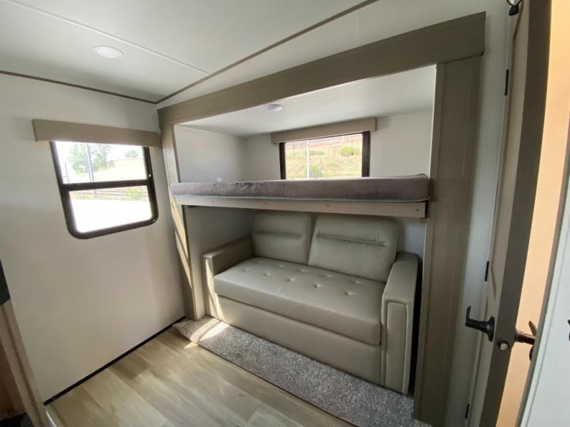 Are you looking to travel with your family and friends and want enough space for everyone to be comfortable? Step inside using the Step Above wit lift assist entry steps, to find a private bunkhouse in the rear of this fifth wheel which offers a slide out flip bunk above a tri-fold sofa, a 44" bunk bed with window and storage below, plus its very own private half bathroom. The theater seating or tri-fold sofa option is a great place to unwind at night in front of the entertainment center with a 40" LED HDTV and fireplace below it. There is a booth dinette or you can a swivel dinette option to dine at, and the kitchen island will provide more counter space to prep meals. You will find full amenities including a 16 cu. ft. 12V refrigerator and a hutch. This fifth wheel also includes a double entry bathroom with a radius shower, and you can wake up refreshed each morning after sleeping on your own queen bed.