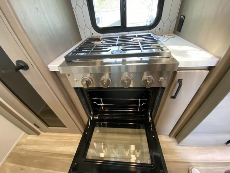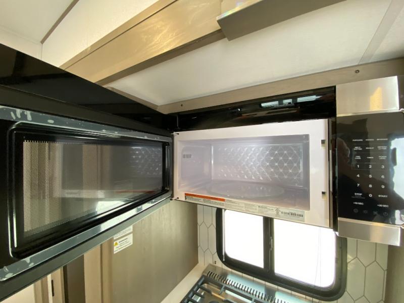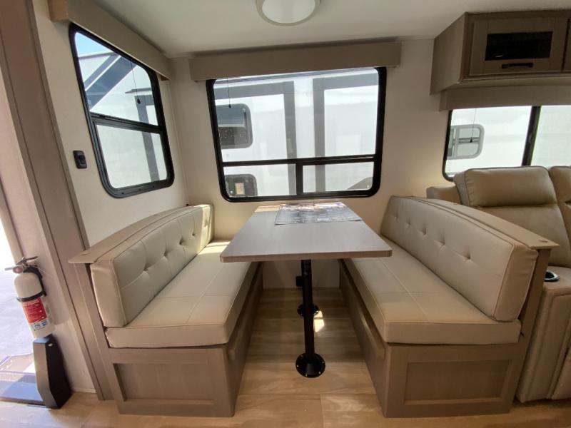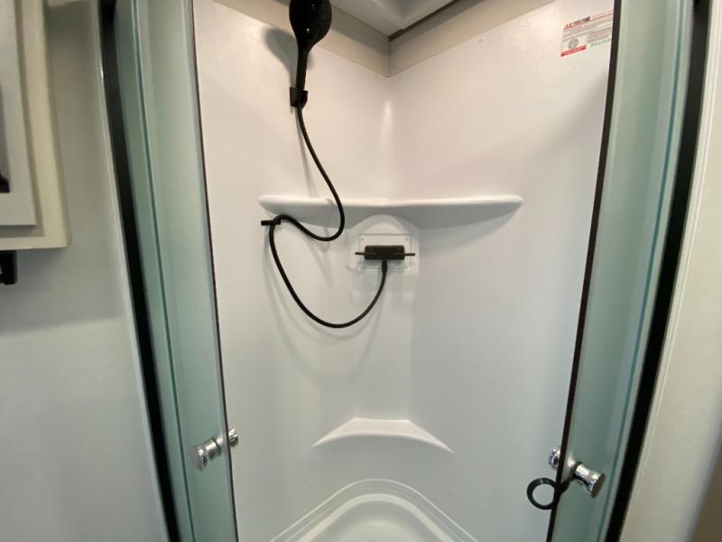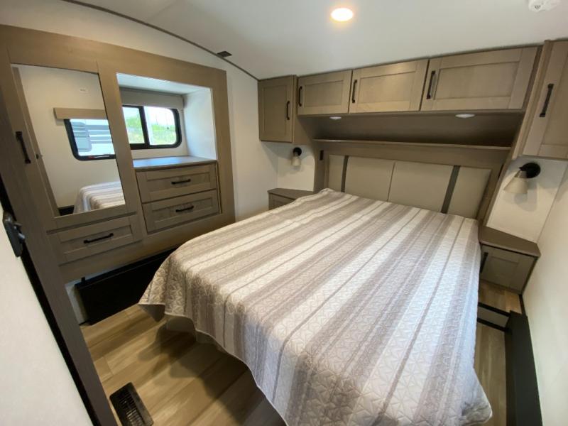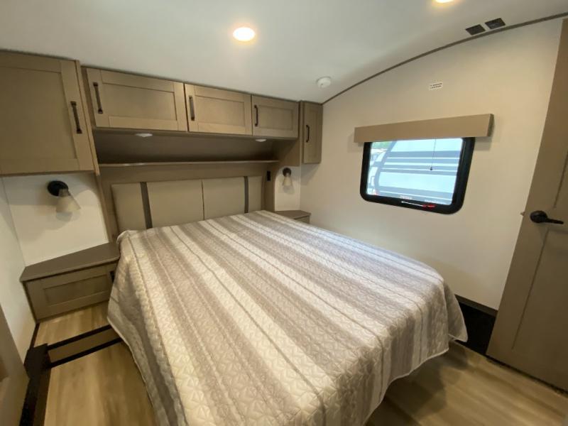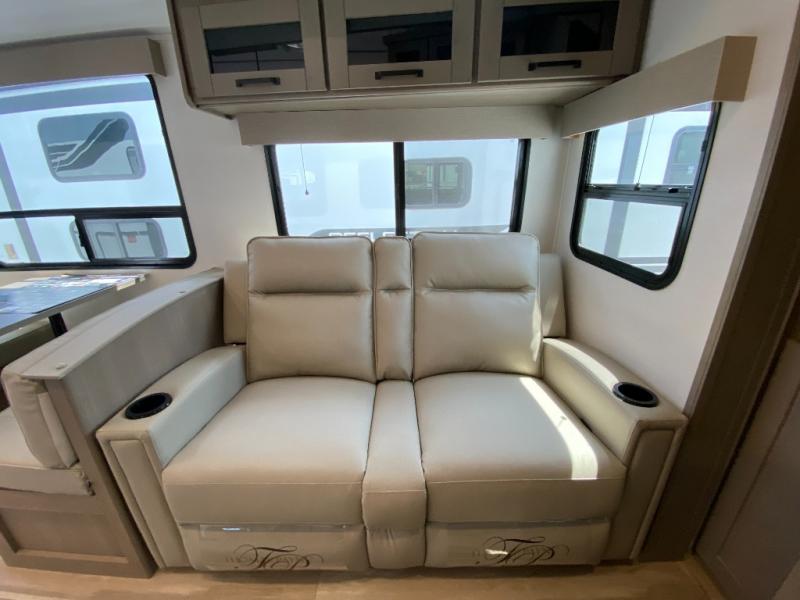 Are you looking to travel with your family and friends and want enough space for everyone to be comfortable? Step inside using the Step Above wit lift assist entry steps, to find a private bunkhouse in the rear of this fifth wheel which offers a slide out flip bunk above a tri-fold sofa, a 44" bunk bed with window and storage below, plus its very own private half bathroom. The theater seating or tri-fold sofa option is a great place to unwind at night in front of the entertainment center with a 40" LED HDTV and fireplace below it. There is a booth dinette or you can a swivel dinette option to dine at, and the kitchen island will provide more counter space to prep meals. You will find full amenities including a 16 cu. ft. 12V refrigerator and a hutch. This fifth wheel also includes a double entry bathroom with a radius shower, and you can wake up refreshed each morning after sleeping on your own queen bed.