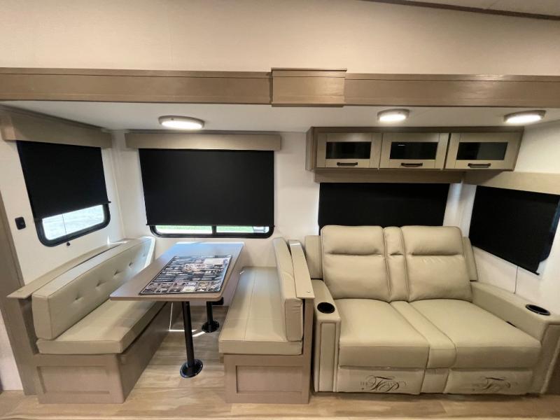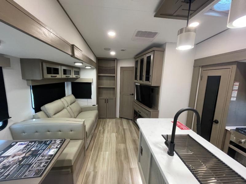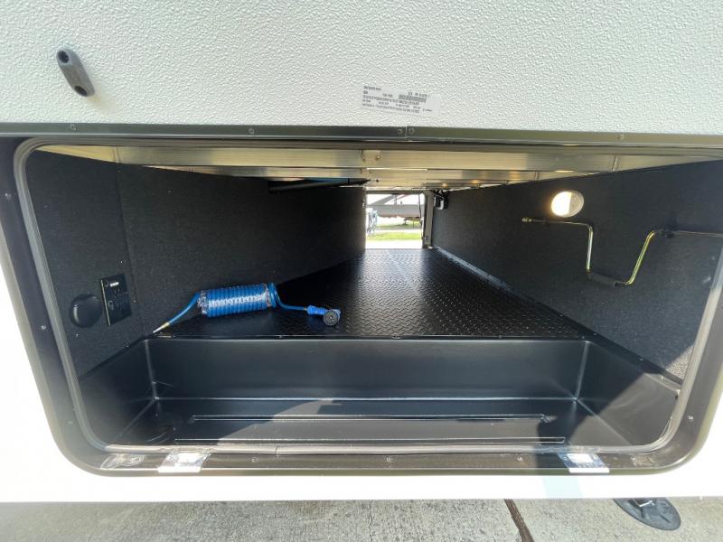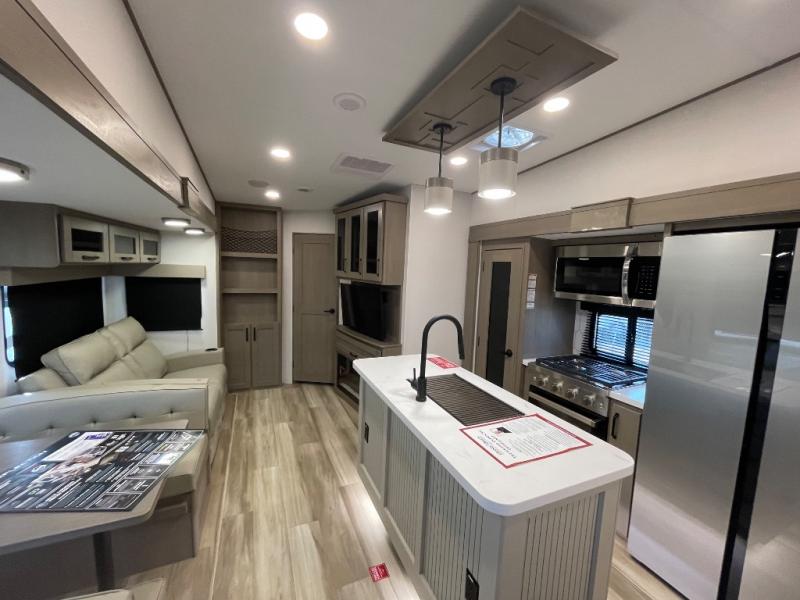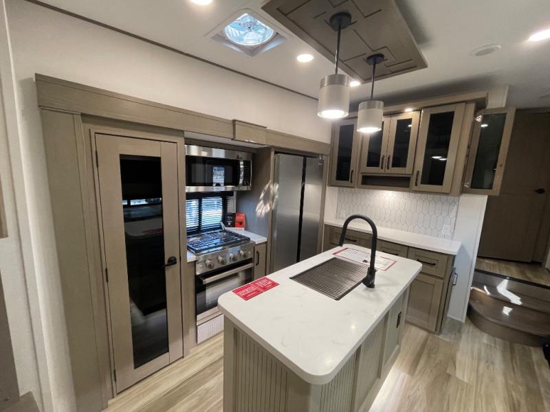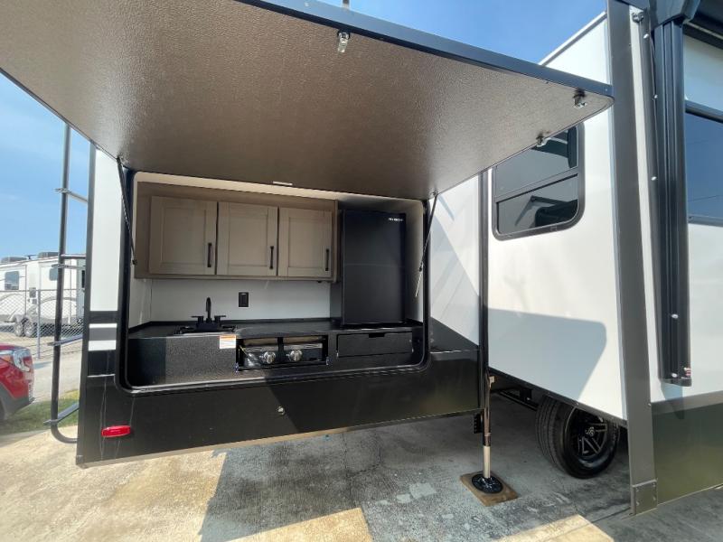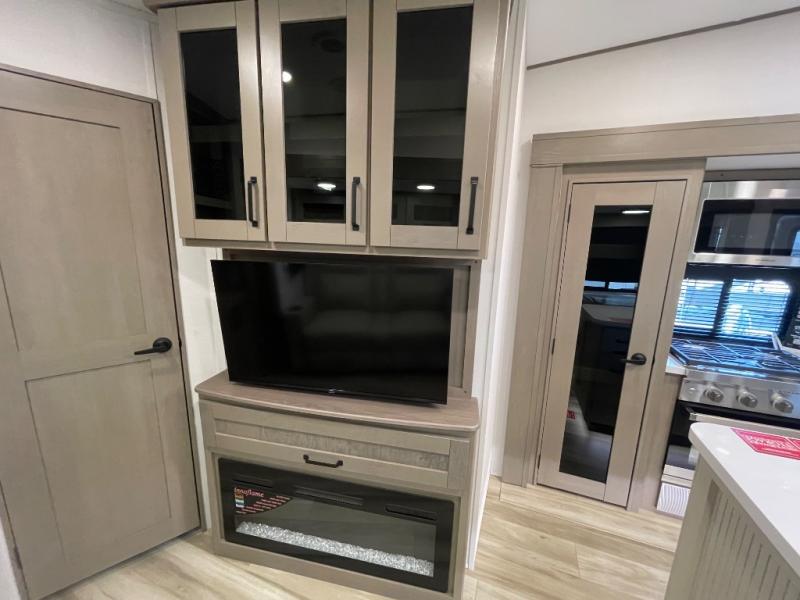 Are you looking to travel with your family and friends and want enough space for everyone to be comfortable? Step inside using the Step Above wit lift assist entry steps, to find a private bunkhouse in the rear of this fifth wheel which offers a slide out flip bunk above a tri-fold sofa, a 44" bunk bed with window and storage below, plus its very own private half bathroom. The theater seating or tri-fold sofa option is a great place to unwind at night in front of the entertainment center with a 40" LED HDTV and fireplace below it. There is a booth dinette or you can a swivel dinette option to dine at, and the kitchen island will provide more counter space to prep meals. You will find full amenities including a 16 cu. ft. 12V refrigerator and a hutch. This fifth wheel also includes a double entry bathroom with a radius shower, and you can wake up refreshed each morning after sleeping on your own queen bed.