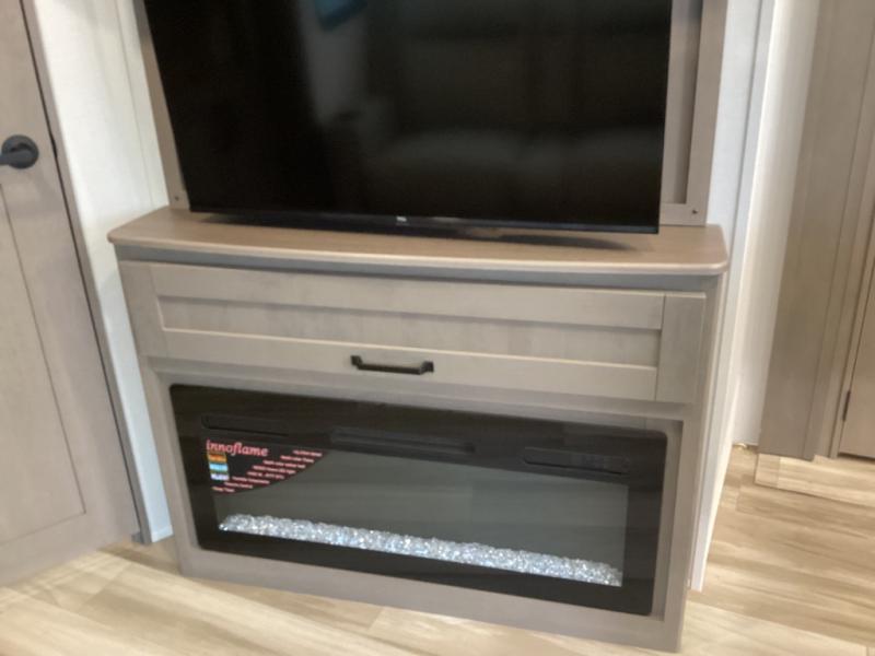 Theater seating or tri-fold sofa, electric fireplace, and entertainment center create a cozy space to relax after exploring. -
