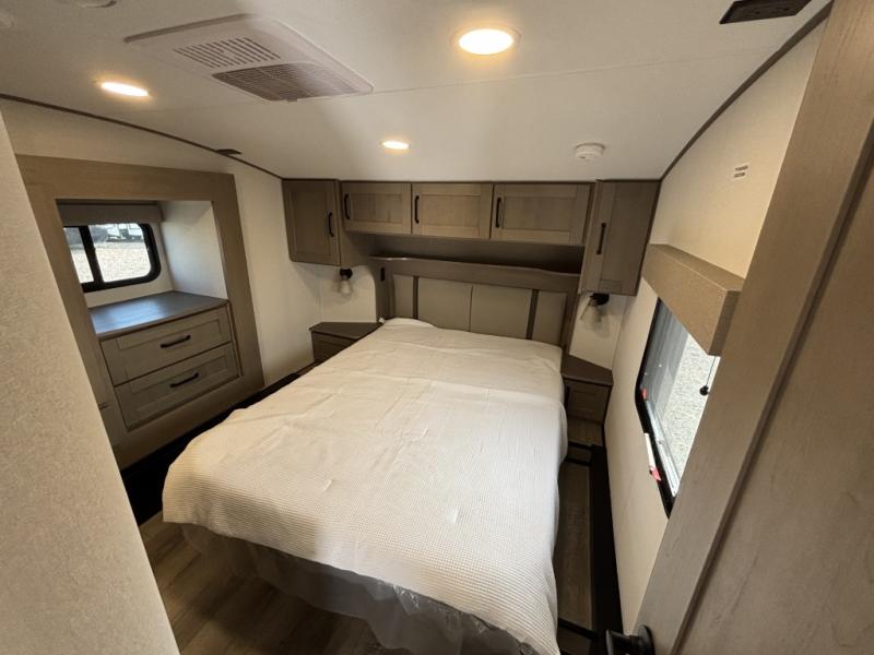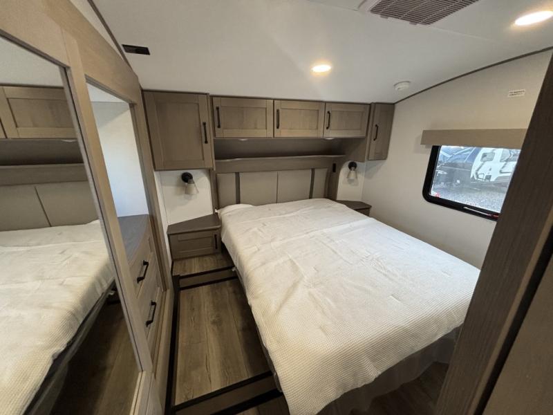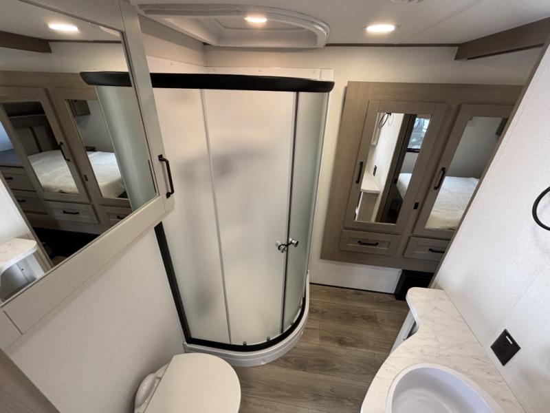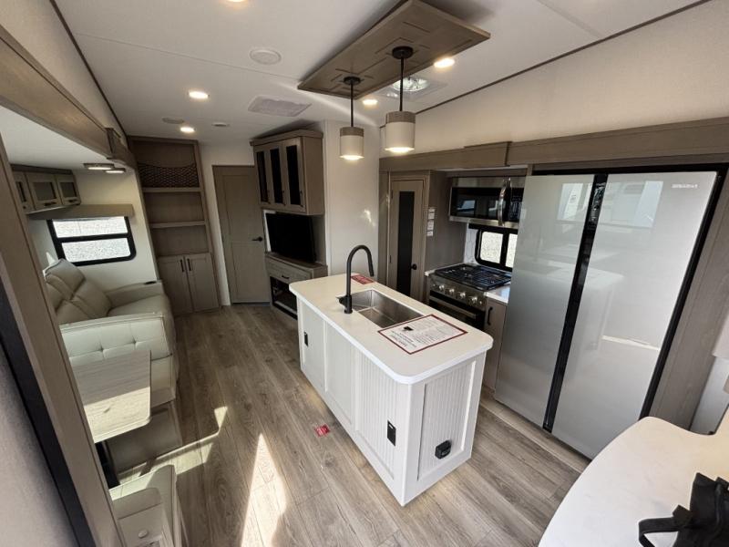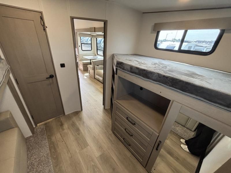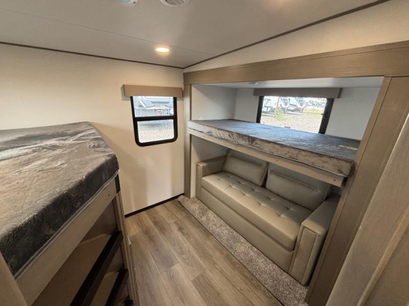 Are you looking to travel with your family and friends and want enough space for everyone to be comfortable? Step inside using the Step Above wit lift assist entry steps, to find a private bunkhouse in the rear of this fifth wheel which offers a slide out flip bunk above a tri-fold sofa, a 44" bunk bed with window and storage below, plus its very own private half bathroom. The theater seating or tri-fold sofa option is a great place to unwind at night in front of the entertainment center with a 40" LED HDTV and fireplace below it. There is a booth dinette or you can a swivel dinette option to dine at, and the kitchen island will provide more counter space to prep meals. You will find full amenities including a 16 cu. ft. 12V refrigerator and a hutch. This fifth wheel also includes a double entry bathroom with a radius shower, and you can wake up refreshed each morning after sleeping on your own queen bed.