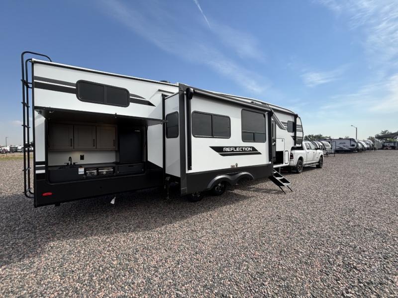 With any Reflection fifth wheel by Grand Design, you will have a solar panel for off-grid camping and a 60 amp charge controller and inverter prep, a Universal All-In-One docking station, unobstructed pass-through storage, and Goodyear Endurance tires. Each is constructed of gel coat exterior sidewalls, residential 5" truss rafters, walk-on roof decking, a fiberglass and radiant foil roof and front cap insulation plus laminated aluminum framed side walls, roof and end walls in slide rooms. Head inside to enjoy residential hardwood cabinet doors, premium Congoleum flooring, a spacious shower with a glass door, and many more comforts!