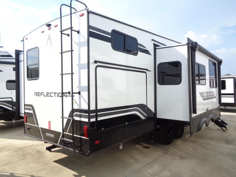 With any Reflection fifth wheel by Grand Design, you will have a solar panel for off-grid camping and a 60 amp charge controller and inverter prep, a Universal All-In-One docking station, unobstructed pass-through storage, and Goodyear Endurance tires. Each is constructed of gel coat exterior sidewalls, residential 5" truss rafters, walk-on roof decking, a fiberglass and radiant foil roof and front cap insulation plus laminated aluminum framed side walls, roof and end walls in slide rooms. Head inside to enjoy residential hardwood cabinet doors, premium Congoleum flooring, a spacious shower with a glass door, and many more comforts!