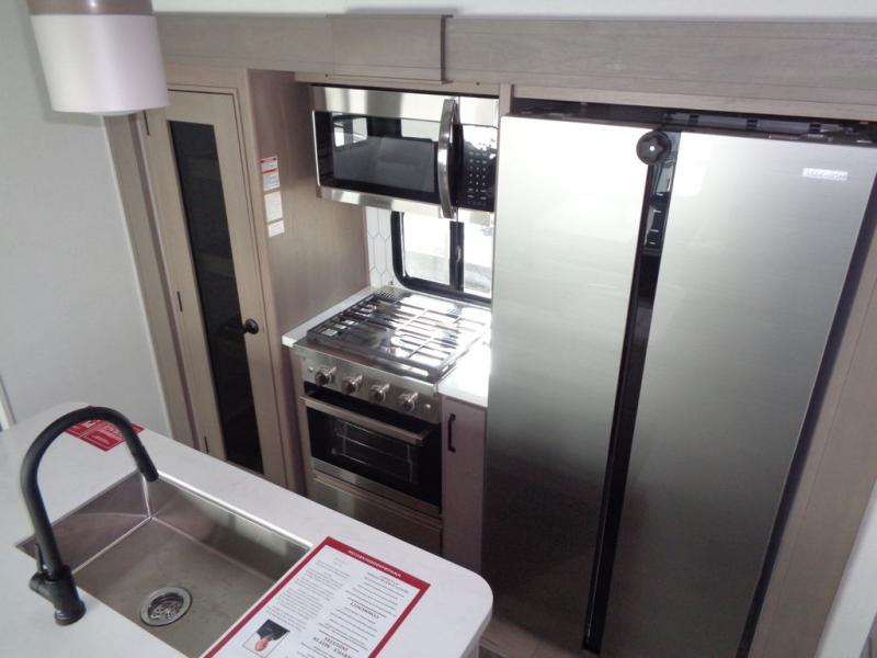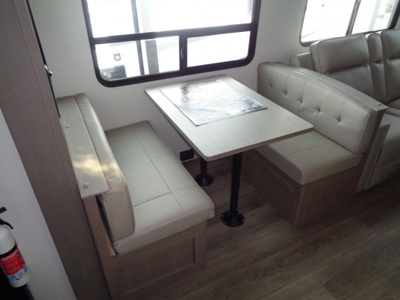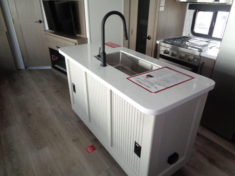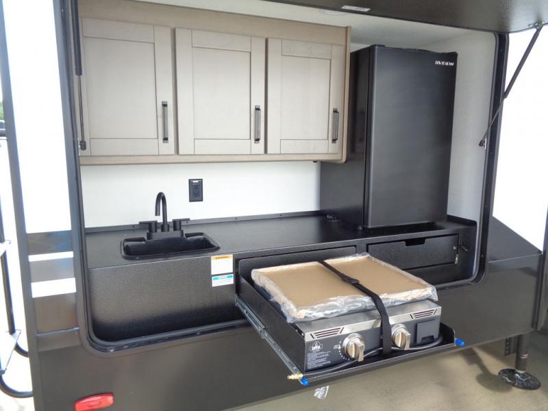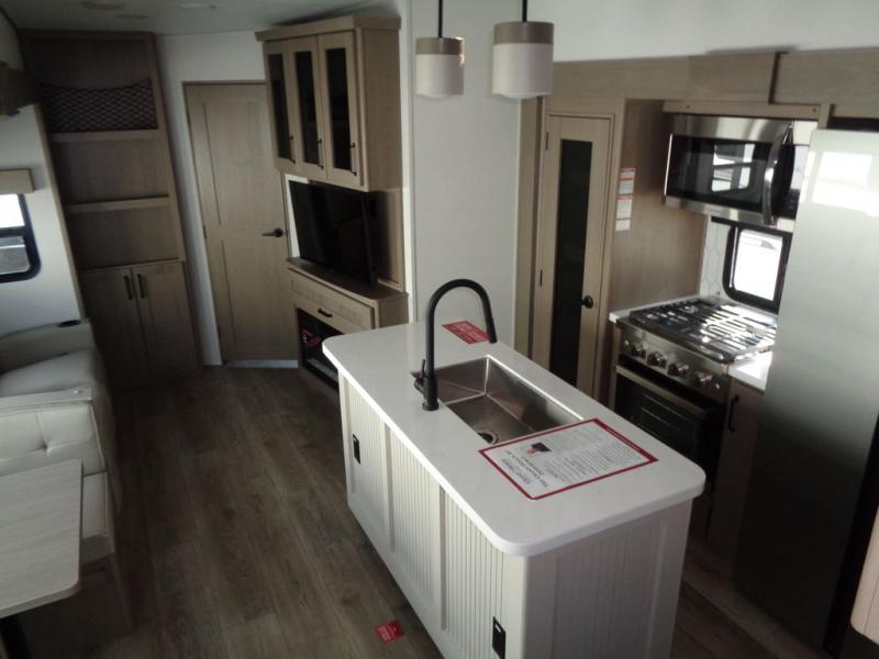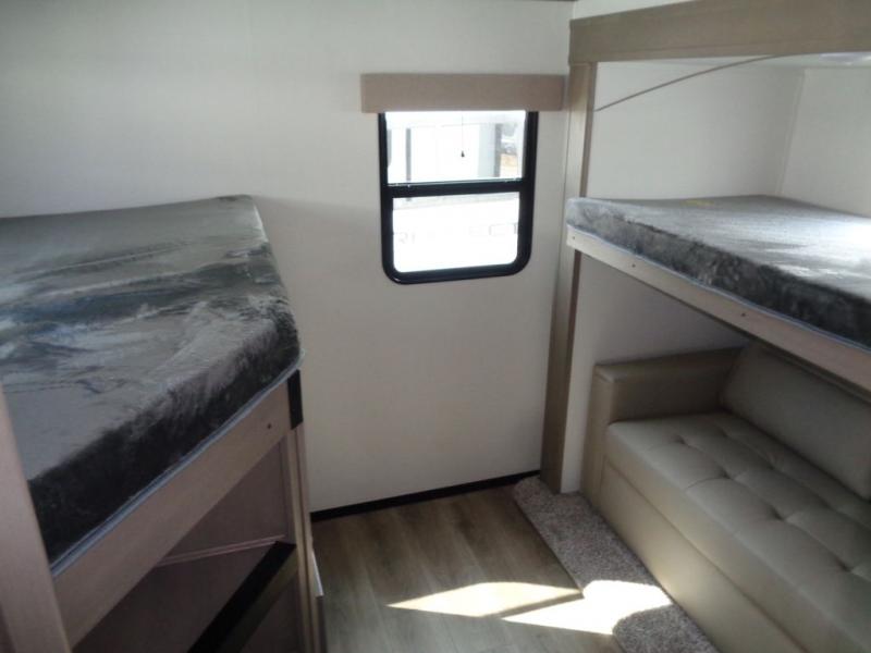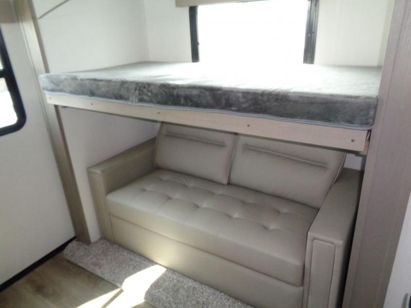 Are you looking to travel with your family and friends and want enough space for everyone to be comfortable? Step inside using the Step Above wit lift assist entry steps, to find a private bunkhouse in the rear of this fifth wheel which offers a slide out flip bunk above a tri-fold sofa, a 44" bunk bed with window and storage below, plus its very own private half bathroom. The theater seating or tri-fold sofa option is a great place to unwind at night in front of the entertainment center with a 40" LED HDTV and fireplace below it. There is a booth dinette or you can a swivel dinette option to dine at, and the kitchen island will provide more counter space to prep meals. You will find full amenities including a 16 cu. ft. 12V refrigerator and a hutch. This fifth wheel also includes a double entry bathroom with a radius shower, and you can wake up refreshed each morning after sleeping on your own queen bed.