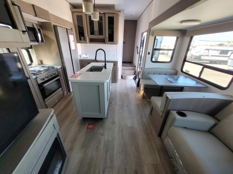 Are you looking to travel with your family and friends and want enough space for everyone to be comfortable? Step inside using the Step Above wit lift assist entry steps, to find a private bunkhouse in the rear of this fifth wheel which offers a slide out flip bunk above a tri-fold sofa, a 44" bunk bed with window and storage below, plus its very own private half bathroom. The theater seating or tri-fold sofa option is a great place to unwind at night in front of the entertainment center with a 40" LED HDTV and fireplace below it. There is a booth dinette or you can a swivel dinette option to dine at, and the kitchen island will provide more counter space to prep meals. You will find full amenities including a 16 cu. ft. 12V refrigerator and a hutch. This fifth wheel also includes a double entry bathroom with a radius shower, and you can wake up refreshed each morning after sleeping on your own queen bed.