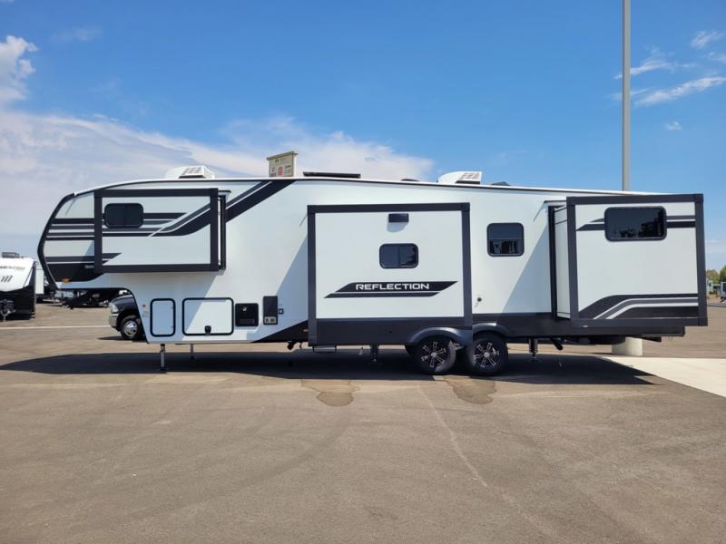 With any Reflection fifth wheel by Grand Design, you will have a solar panel for off-grid camping and a 60 amp charge controller and inverter prep, a Universal All-In-One docking station, unobstructed pass-through storage, and Goodyear Endurance tires. Each is constructed of gel coat exterior sidewalls, residential 5" truss rafters, walk-on roof decking, a fiberglass and radiant foil roof and front cap insulation plus laminated aluminum framed side walls, roof and end walls in slide rooms. Head inside to enjoy residential hardwood cabinet doors, premium Congoleum flooring, a spacious shower with a glass door, and many more comforts!