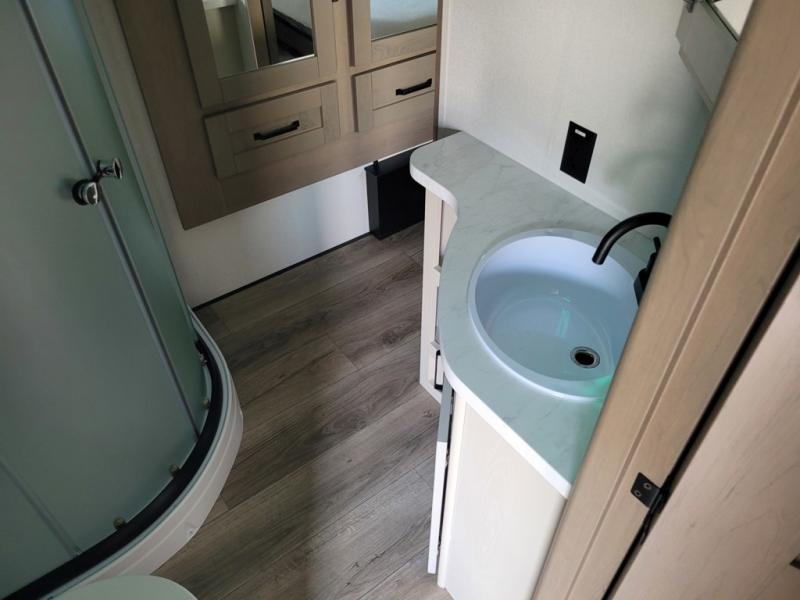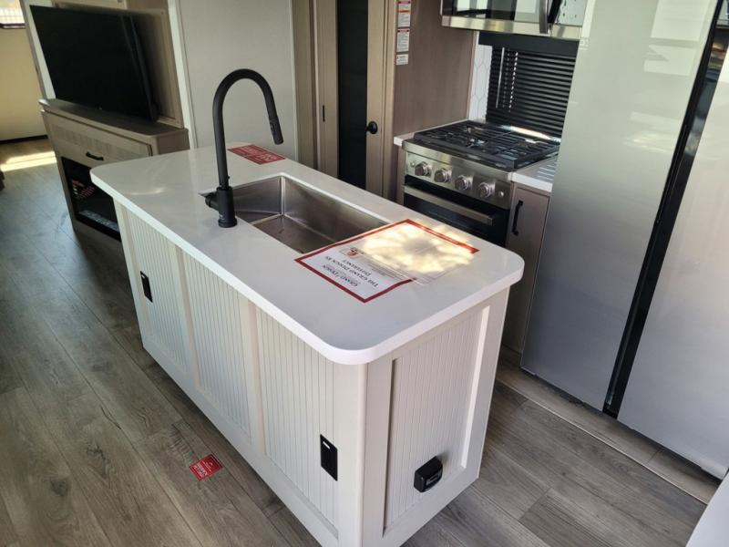 Are you looking to travel with your family and friends and want enough space for everyone to be comfortable? Step inside using the Step Above wit lift assist entry steps, to find a private bunkhouse in the rear of this fifth wheel which offers a slide out flip bunk above a tri-fold sofa, a 44" bunk bed with window and storage below, plus its very own private half bathroom. The theater seating or tri-fold sofa option is a great place to unwind at night in front of the entertainment center with a 40" LED HDTV and fireplace below it. There is a booth dinette or you can a swivel dinette option to dine at, and the kitchen island will provide more counter space to prep meals. You will find full amenities including a 16 cu. ft. 12V refrigerator and a hutch. This fifth wheel also includes a double entry bathroom with a radius shower, and you can wake up refreshed each morning after sleeping on your own queen bed.