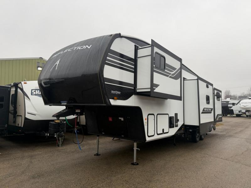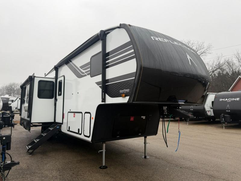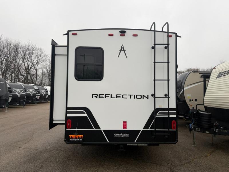 With any Reflection fifth wheel by Grand Design, you will have a solar panel for off-grid camping and a 60 amp charge controller and inverter prep, a Universal All-In-One docking station, unobstructed pass-through storage, and Goodyear Endurance tires. Each is constructed of gel coat exterior sidewalls, residential 5" truss rafters, walk-on roof decking, a fiberglass and radiant foil roof and front cap insulation plus laminated aluminum framed side walls, roof and end walls in slide rooms. Head inside to enjoy residential hardwood cabinet doors, premium Congoleum flooring, a spacious shower with a glass door, and many more comforts!