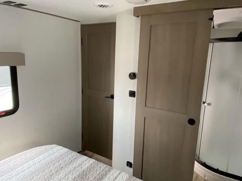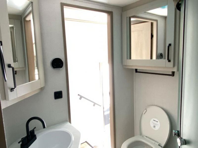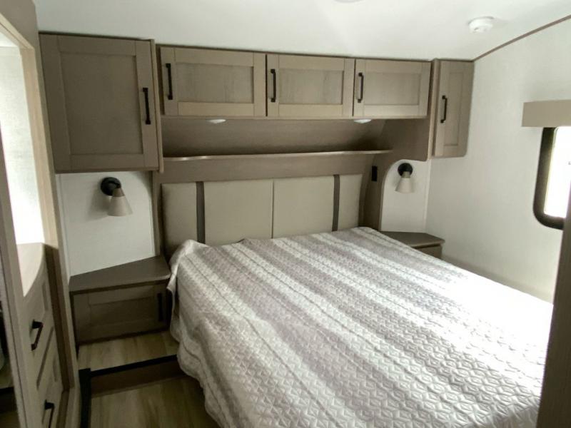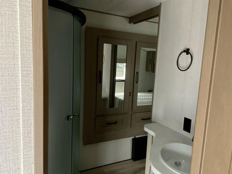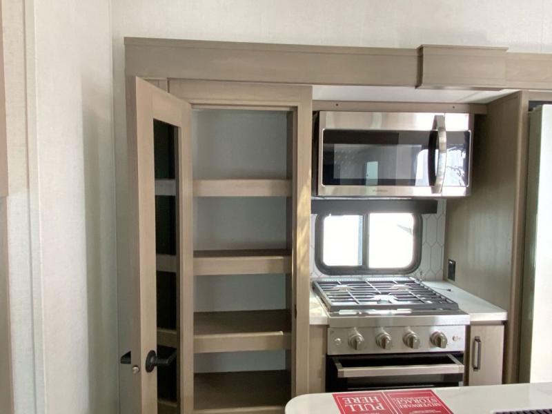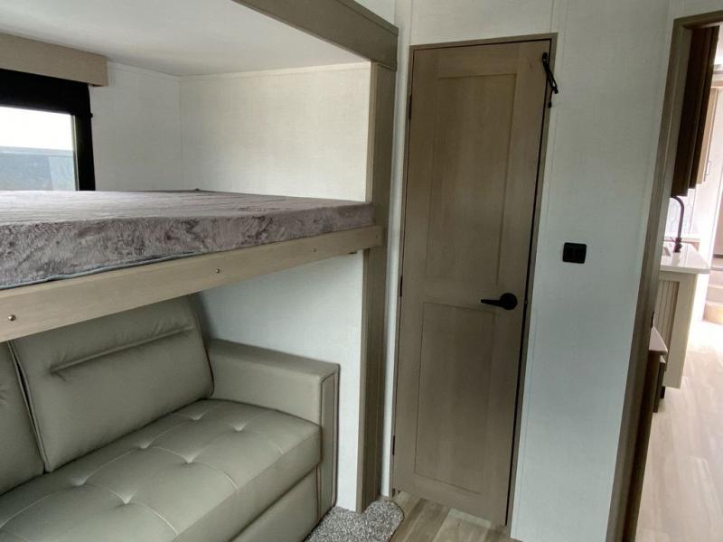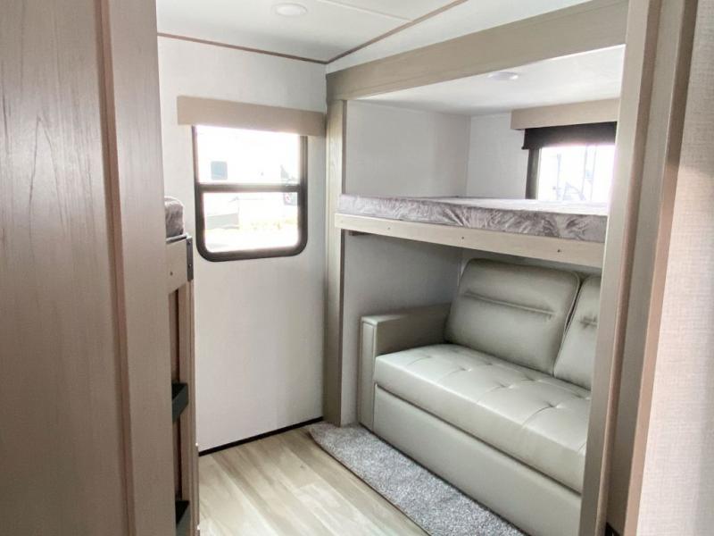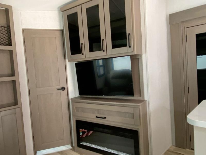 Are you looking to travel with your family and friends and want enough space for everyone to be comfortable? Step inside using the Step Above wit lift assist entry steps, to find a private bunkhouse in the rear of this fifth wheel which offers a slide out flip bunk above a tri-fold sofa, a 44" bunk bed with window and storage below, plus its very own private half bathroom. The theater seating or tri-fold sofa option is a great place to unwind at night in front of the entertainment center with a 40" LED HDTV and fireplace below it. There is a booth dinette or you can a swivel dinette option to dine at, and the kitchen island will provide more counter space to prep meals. You will find full amenities including a 16 cu. ft. 12V refrigerator and a hutch. This fifth wheel also includes a double entry bathroom with a radius shower, and you can wake up refreshed each morning after sleeping on your own queen bed.