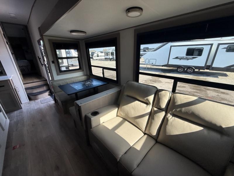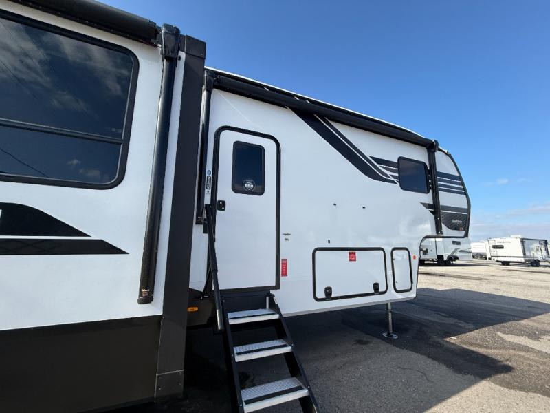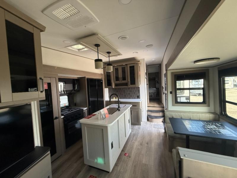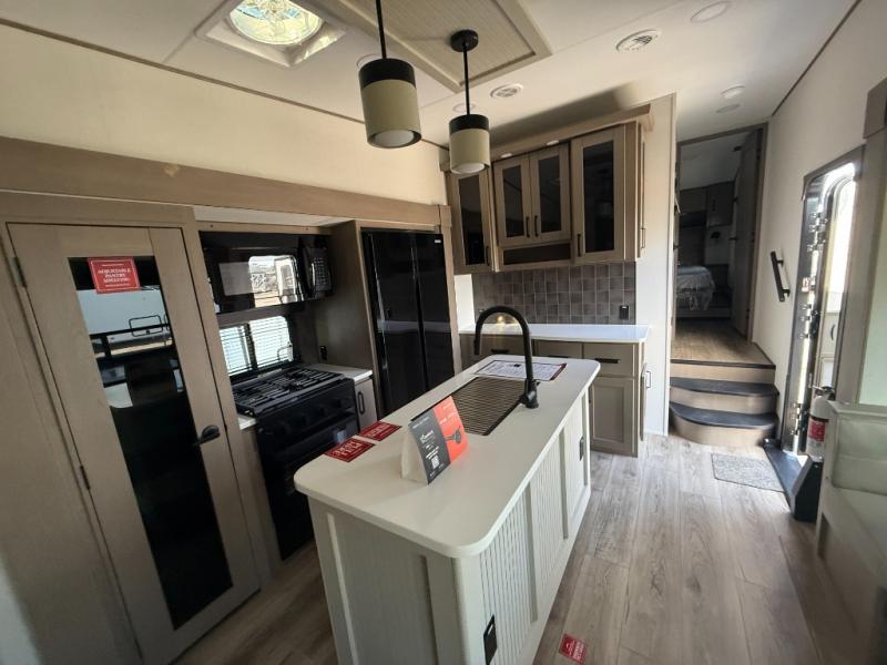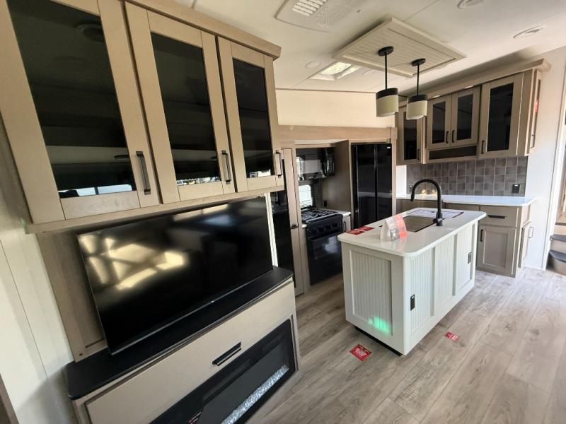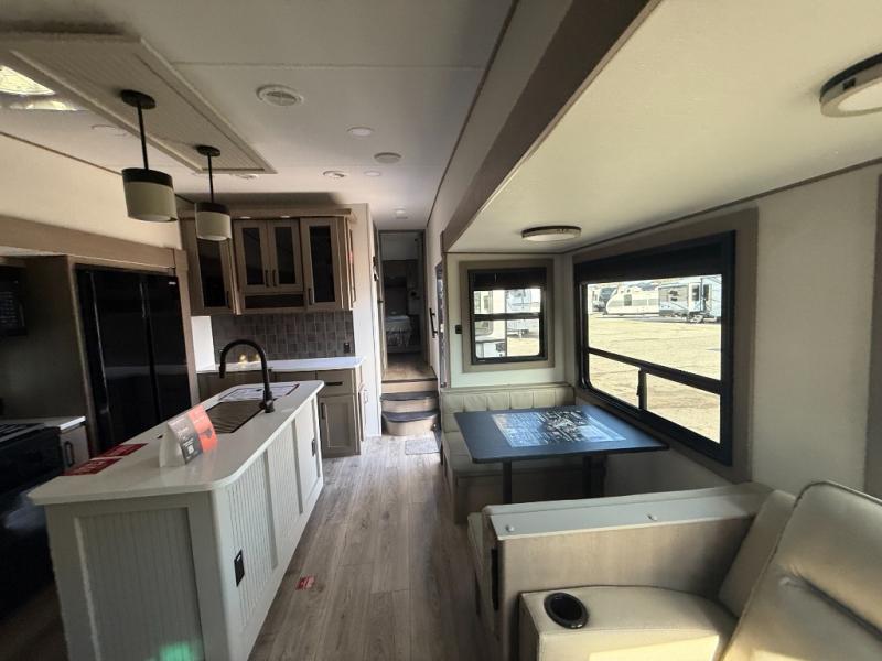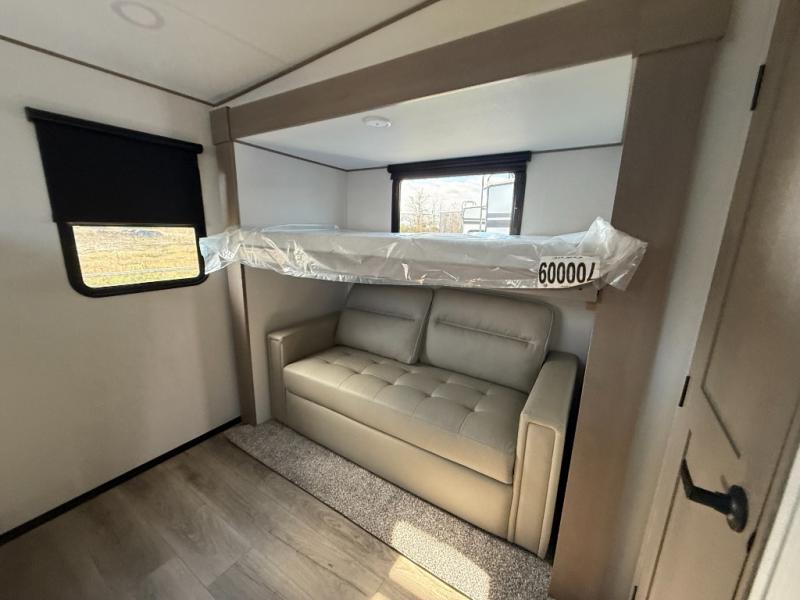 Are you looking to travel with your family and friends and want enough space for everyone to be comfortable? Step inside using the Step Above wit lift assist entry steps, to find a private bunkhouse in the rear of this fifth wheel which offers a slide out flip bunk above a tri-fold sofa, a 44" bunk bed with window and storage below, plus its very own private half bathroom. The theater seating or tri-fold sofa option is a great place to unwind at night in front of the entertainment center with a 40" LED HDTV and fireplace below it. There is a booth dinette or you can a swivel dinette option to dine at, and the kitchen island will provide more counter space to prep meals. You will find full amenities including a 16 cu. ft. 12V refrigerator and a hutch. This fifth wheel also includes a double entry bathroom with a radius shower, and you can wake up refreshed each morning after sleeping on your own queen bed.