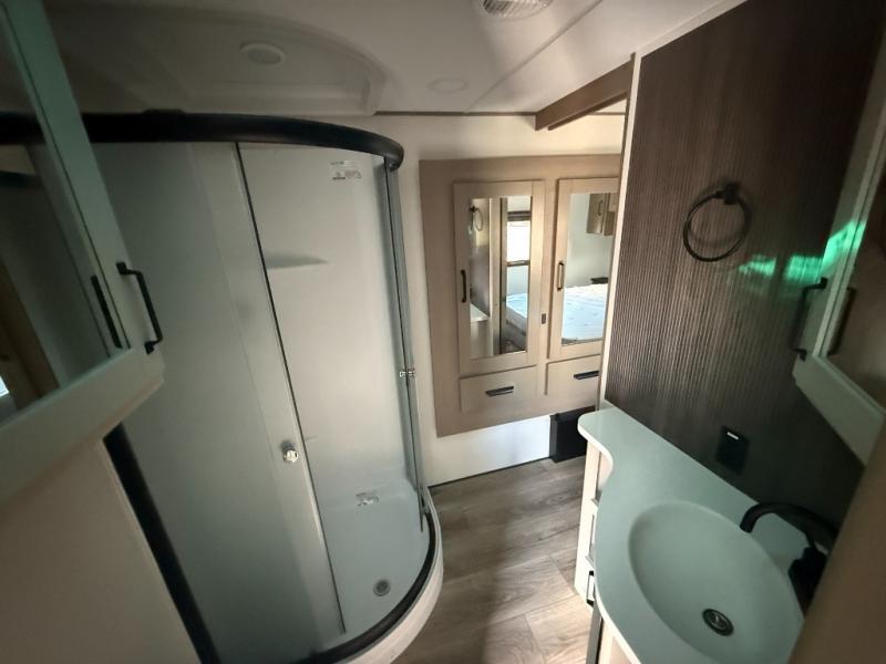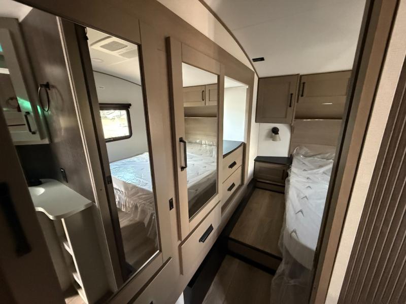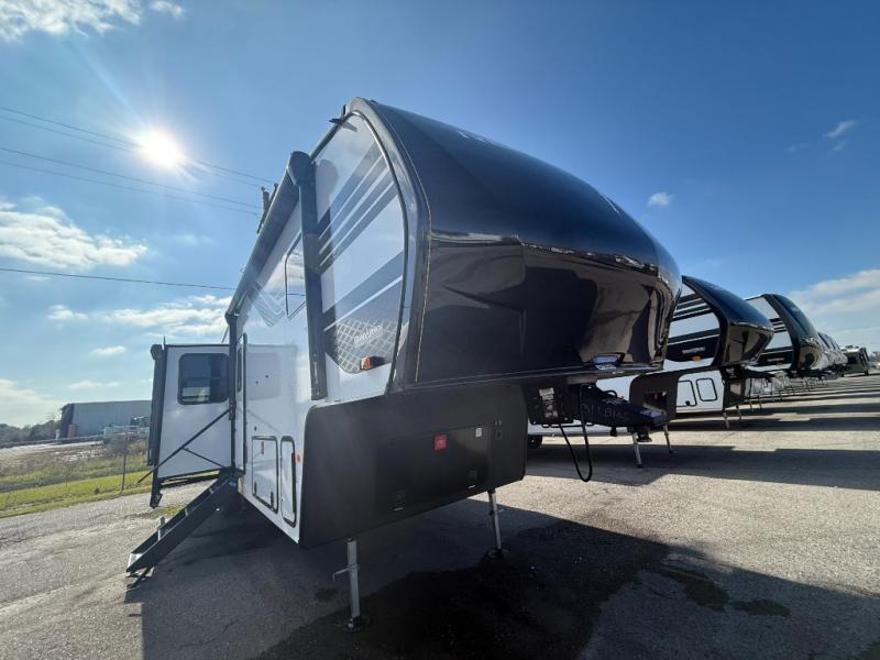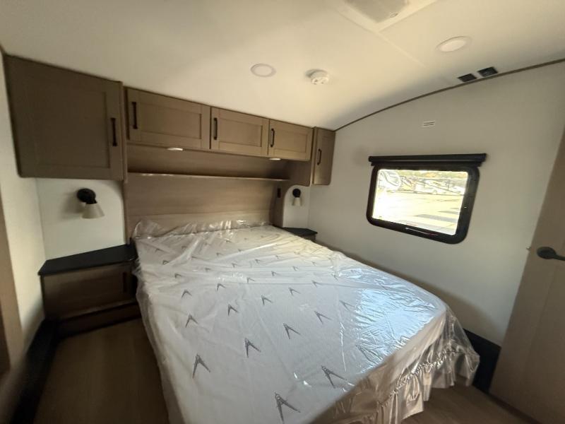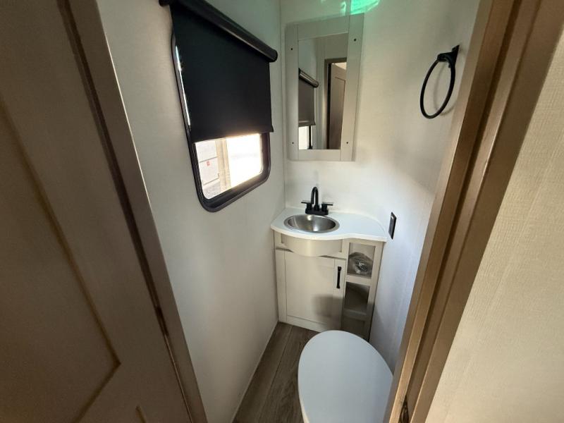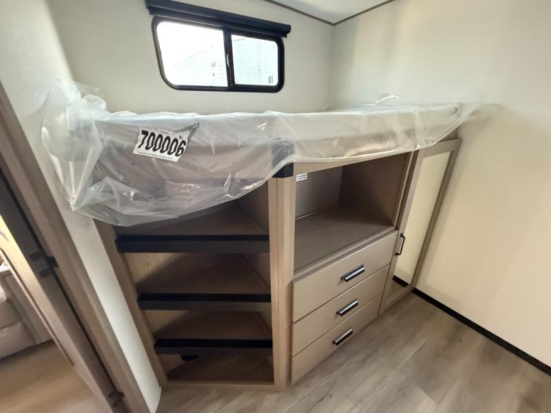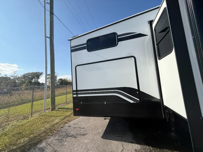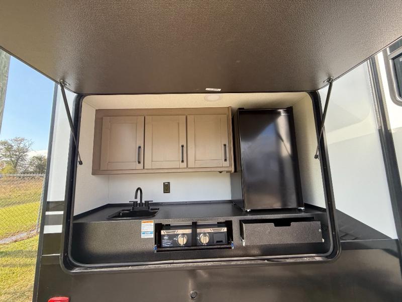 Are you looking to travel with your family and friends and want enough space for everyone to be comfortable? Step inside using the Step Above wit lift assist entry steps, to find a private bunkhouse in the rear of this fifth wheel which offers a slide out flip bunk above a tri-fold sofa, a 44" bunk bed with window and storage below, plus its very own private half bathroom. The theater seating or tri-fold sofa option is a great place to unwind at night in front of the entertainment center with a 40" LED HDTV and fireplace below it. There is a booth dinette or you can a swivel dinette option to dine at, and the kitchen island will provide more counter space to prep meals. You will find full amenities including a 16 cu. ft. 12V refrigerator and a hutch. This fifth wheel also includes a double entry bathroom with a radius shower, and you can wake up refreshed each morning after sleeping on your own queen bed.