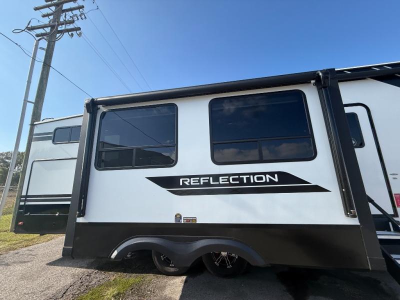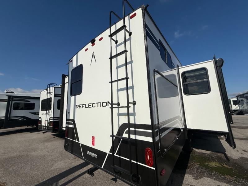 With any Reflection fifth wheel by Grand Design, you will have a solar panel for off-grid camping and a 60 amp charge controller and inverter prep, a Universal All-In-One docking station, unobstructed pass-through storage, and Goodyear Endurance tires. Each is constructed of gel coat exterior sidewalls, residential 5" truss rafters, walk-on roof decking, a fiberglass and radiant foil roof and front cap insulation plus laminated aluminum framed side walls, roof and end walls in slide rooms. Head inside to enjoy residential hardwood cabinet doors, premium Congoleum flooring, a spacious shower with a glass door, and many more comforts!