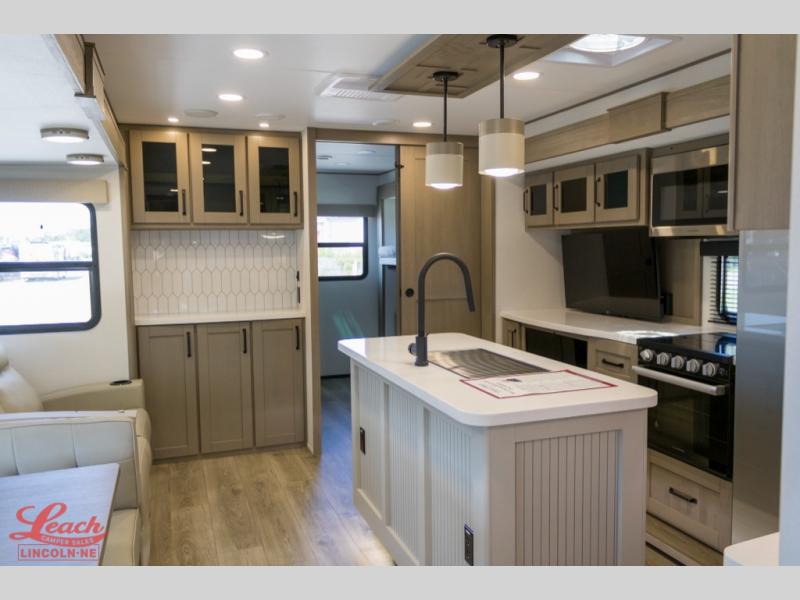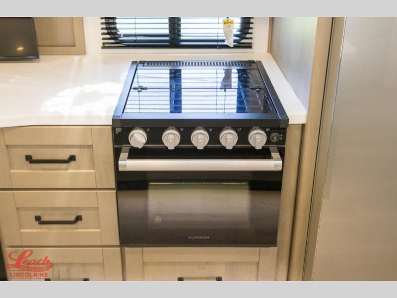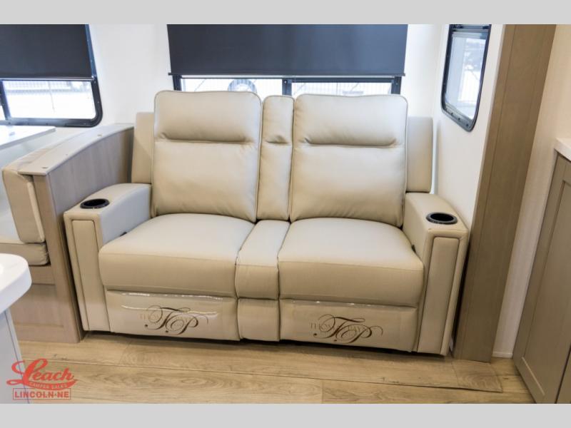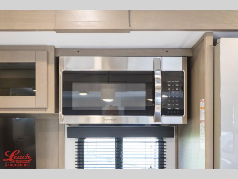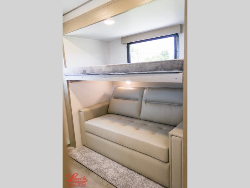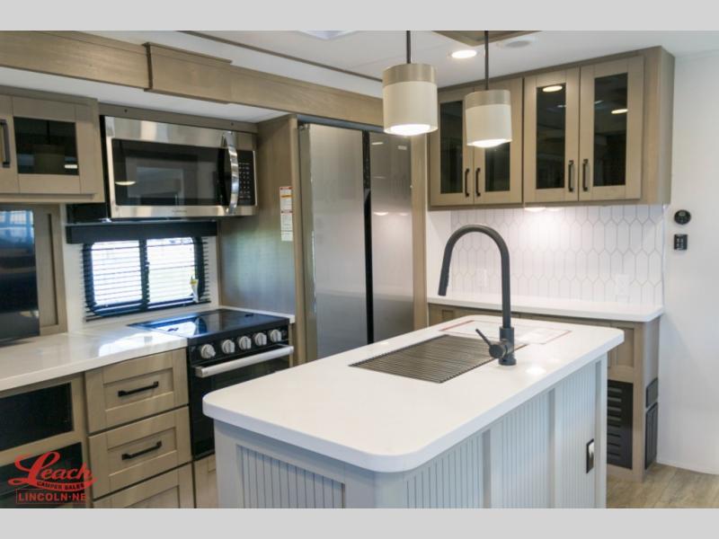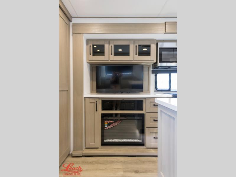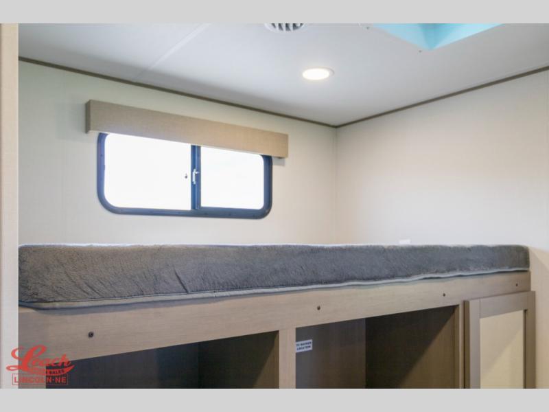 Finding the perfect trailer for a larger group is simple, take a look at this one for your next RV! The rear bunkhouse might be the first reason you fall in love because of the slide out with a flip bunk above a tri-fold sofa, the second bunk bed with a window on the opposite side and storage below, and the large rear window for great views. The outside kitchen might be another reason allowing you to enjoy the outdoors while providing meals for everyone, and/or the inside gourmet kitchen with a 16 cu. ft. refrigerator, an island, and two hutches. Everyone can gather together and relax on the theater seating with cupholders and the booth dinette or optional swivel dinette, or watch the 40" LED HDTV with fireplace below. The full bathroom includes a space savings sliding door and linen storage, and the bedroom gives you a front walk-around queen bed with storage for your clothes on each side, plus there is an additional wardrobe with drawers for your clothes!