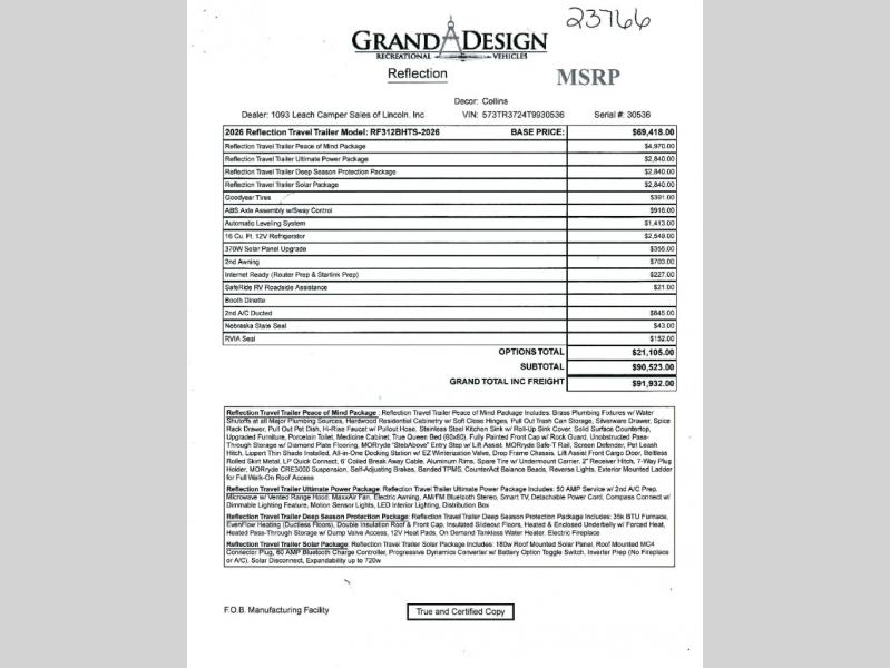 New 2026 Grand Design Reflection 312BHTS Travel Trailer