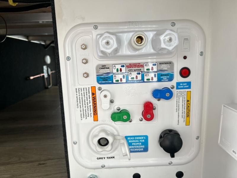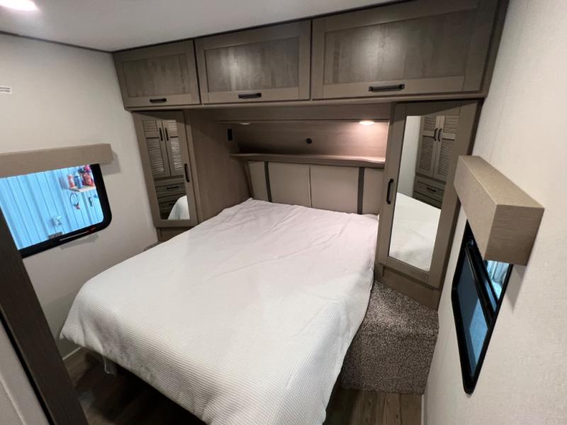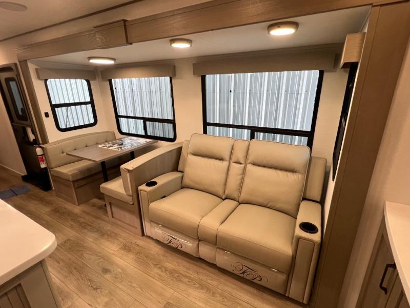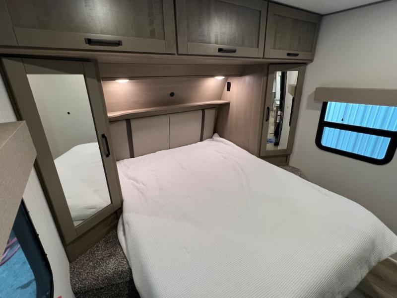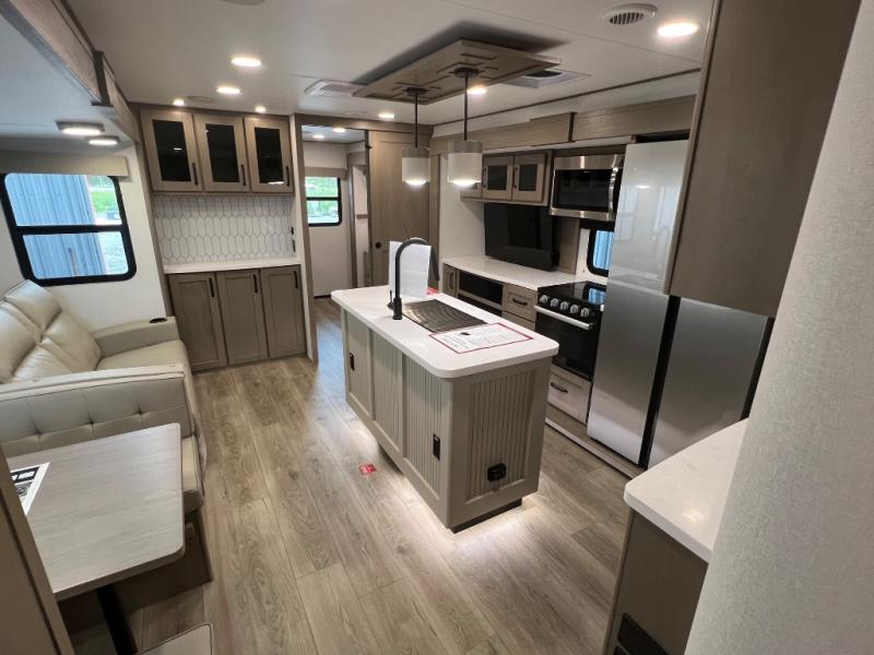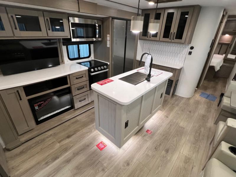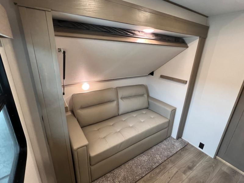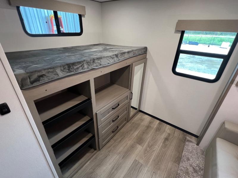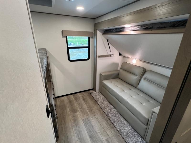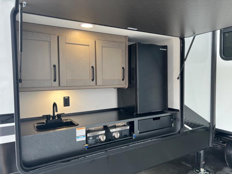 Finding the perfect trailer for a larger group is simple, take a look at this one for your next RV! The rear bunkhouse might be the first reason you fall in love because of the slide out with a flip bunk above a tri-fold sofa, the second bunk bed with a window on the opposite side and storage below, and the large rear window for great views. The outside kitchen might be another reason allowing you to enjoy the outdoors while providing meals for everyone, and/or the inside gourmet kitchen with a 16 cu. ft. refrigerator, an island, and two hutches. Everyone can gather together and relax on the theater seating with cupholders and the booth dinette or optional swivel dinette, or watch the 40" LED HDTV with fireplace below. The full bathroom includes a space savings sliding door and linen storage, and the bedroom gives you a front walk-around queen bed with storage for your clothes on each side, plus there is an additional wardrobe with drawers for your clothes!