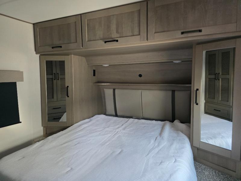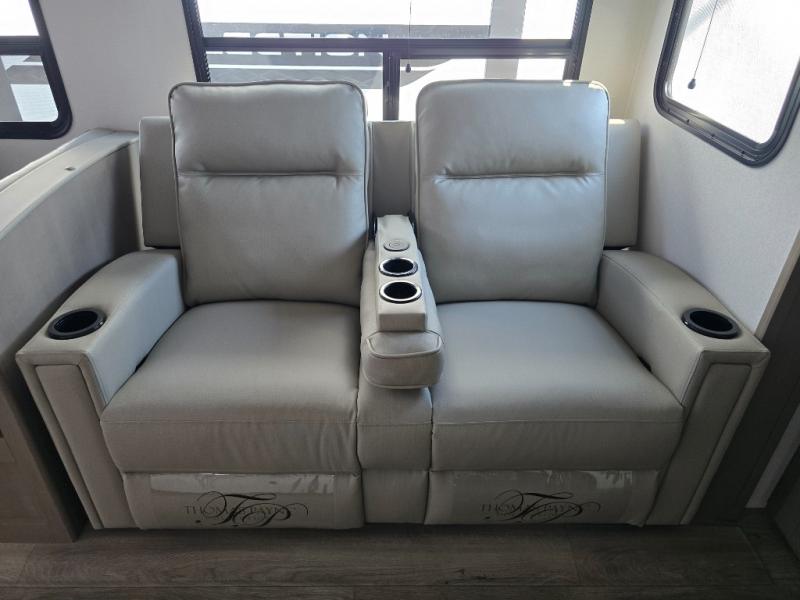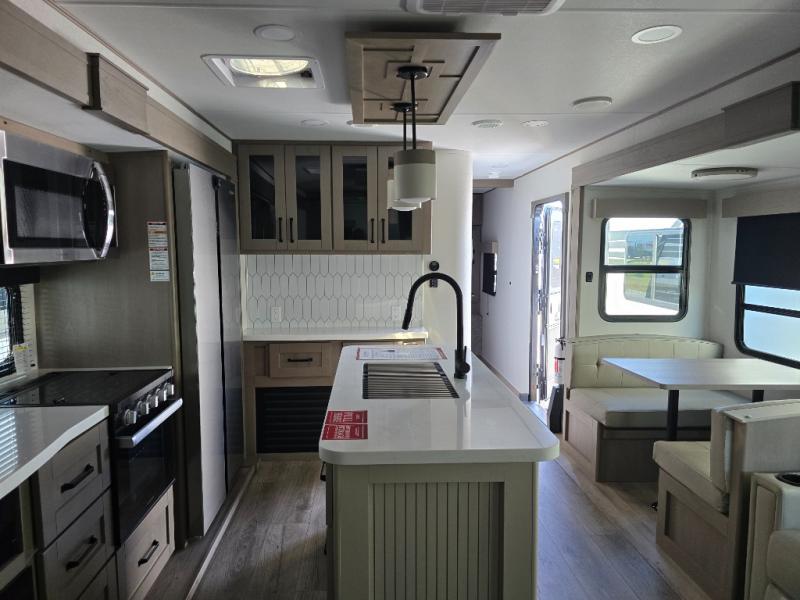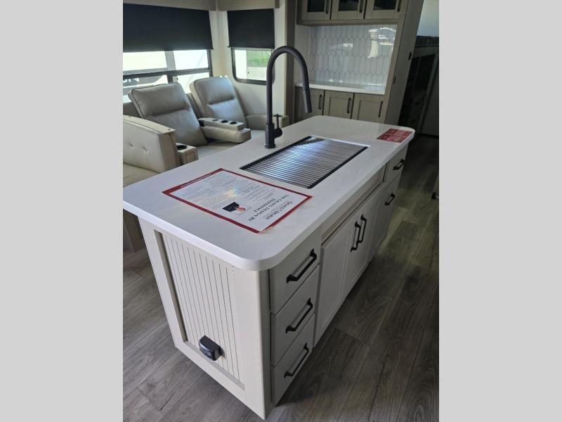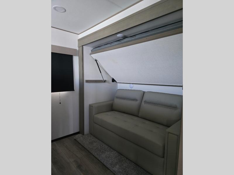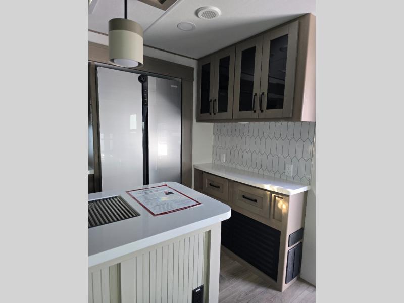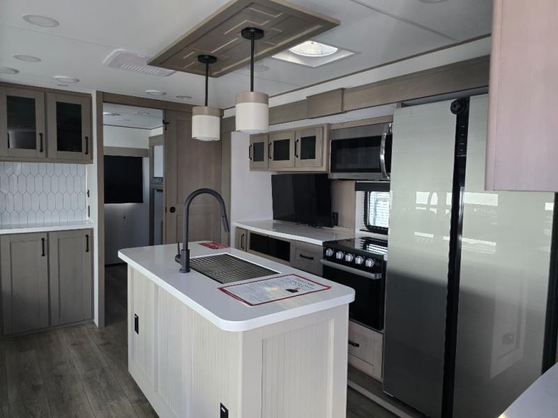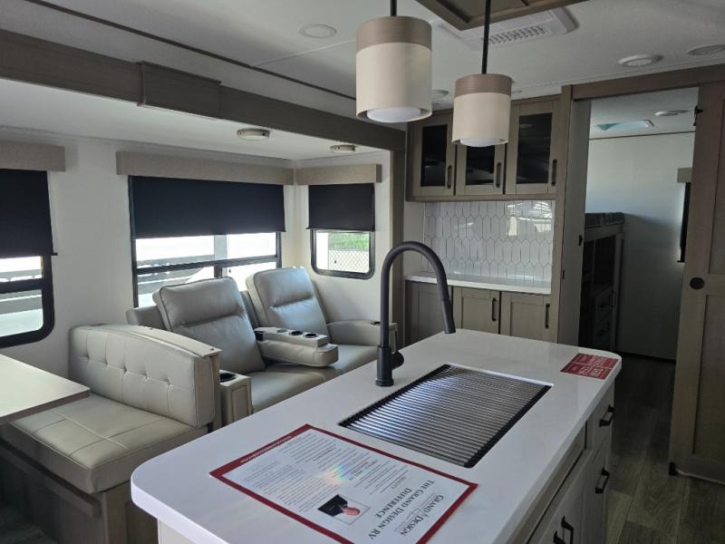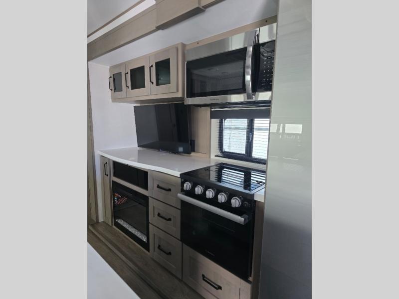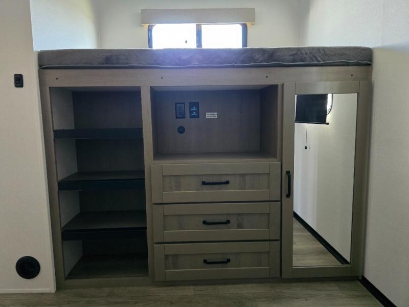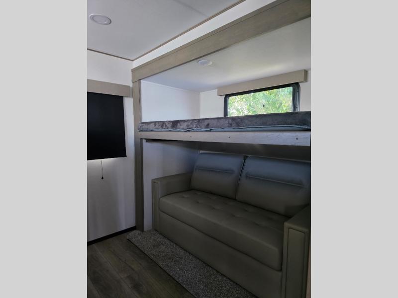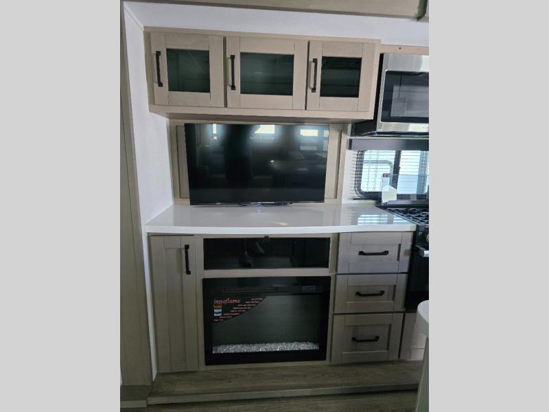 Finding the perfect trailer for a larger group is simple, take a look at this one for your next RV! The rear bunkhouse might be the first reason you fall in love because of the slide out with a flip bunk above a tri-fold sofa, the second bunk bed with a window on the opposite side and storage below, and the large rear window for great views. The outside kitchen might be another reason allowing you to enjoy the outdoors while providing meals for everyone, and/or the inside gourmet kitchen with a 16 cu. ft. refrigerator, an island, and two hutches. Everyone can gather together and relax on the theater seating with cupholders and the booth dinette or optional swivel dinette, or watch the 40" LED HDTV with fireplace below. The full bathroom includes a space savings sliding door and linen storage, and the bedroom gives you a front walk-around queen bed with storage for your clothes on each side, plus there is an additional wardrobe with drawers for your clothes!
