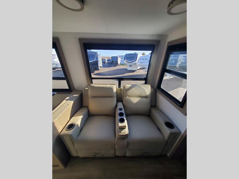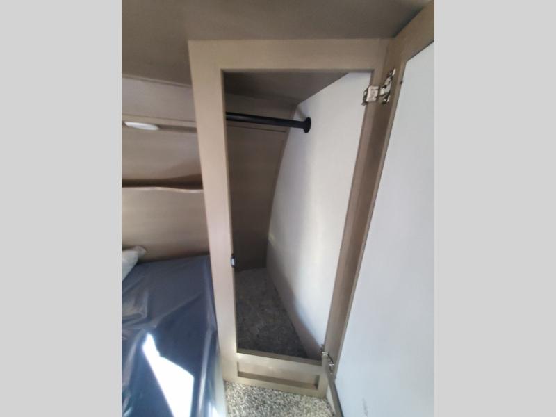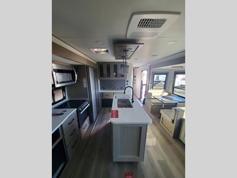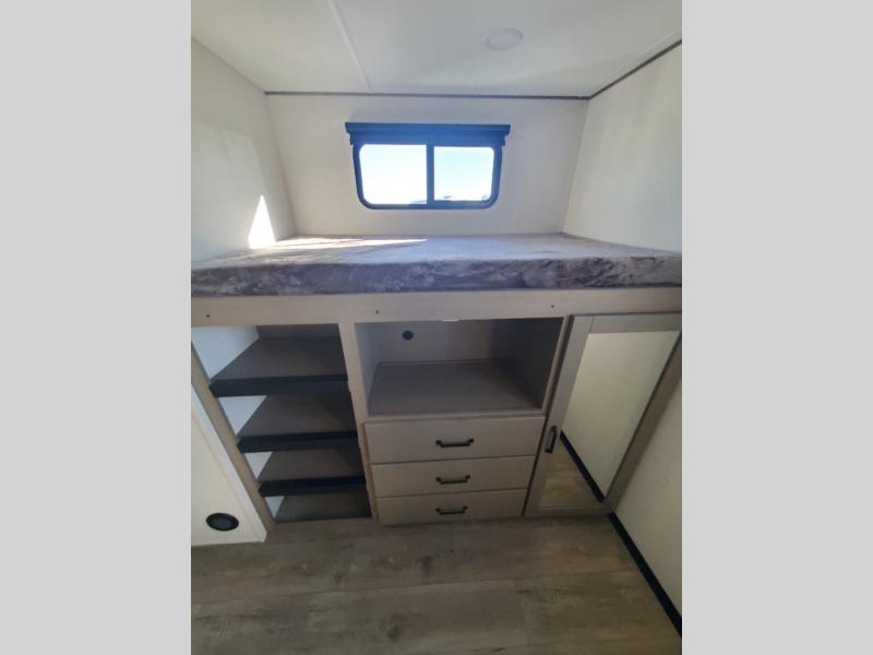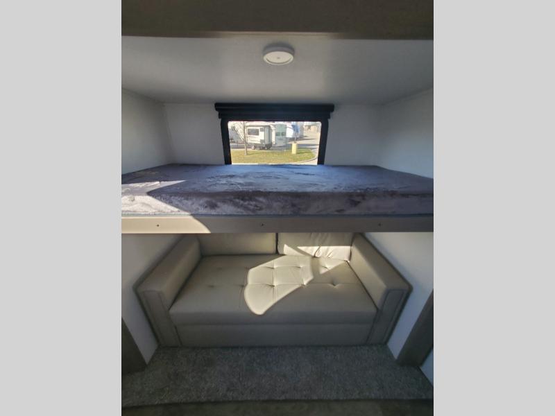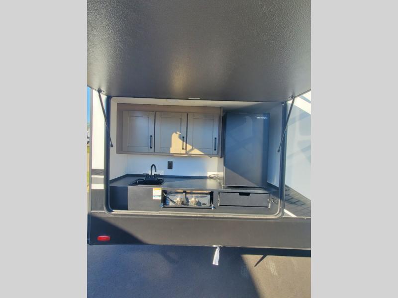 Finding the perfect trailer for a larger group is simple, take a look at this one for your next RV! The rear bunkhouse might be the first reason you fall in love because of the slide out with a flip bunk above a tri-fold sofa, the second bunk bed with a window on the opposite side and storage below, and the large rear window for great views. The outside kitchen might be another reason allowing you to enjoy the outdoors while providing meals for everyone, and/or the inside gourmet kitchen with a 16 cu. ft. refrigerator, an island, and two hutches. Everyone can gather together and relax on the theater seating with cupholders and the booth dinette or optional swivel dinette, or watch the 40" LED HDTV with fireplace below. The full bathroom includes a space savings sliding door and linen storage, and the bedroom gives you a front walk-around queen bed with storage for your clothes on each side, plus there is an additional wardrobe with drawers for your clothes!