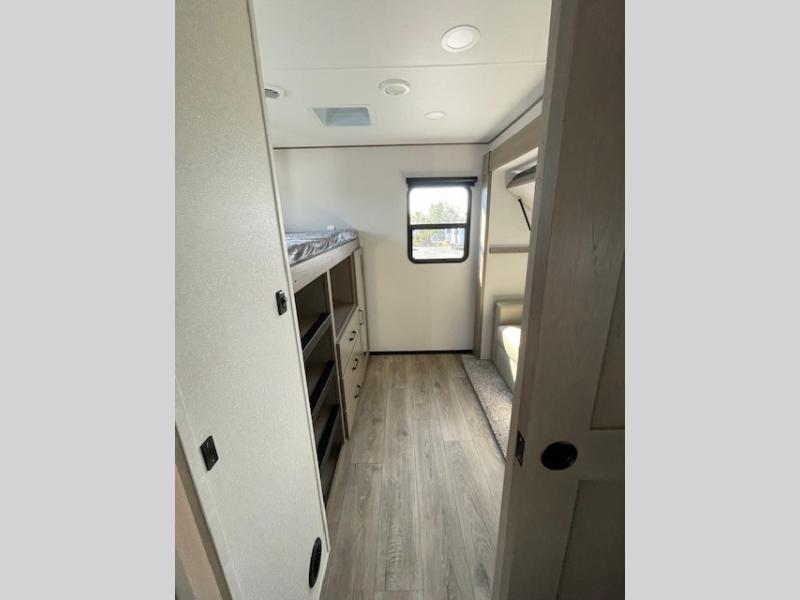 Finding the perfect trailer for a larger group is simple, take a look at this one for your next RV! The rear bunkhouse might be the first reason you fall in love because of the slide out with a flip bunk above a tri-fold sofa, the second bunk bed with a window on the opposite side and storage below, and the large rear window for great views. The outside kitchen might be another reason allowing you to enjoy the outdoors while providing meals for everyone, and/or the inside gourmet kitchen with a 16 cu. ft. refrigerator, an island, and two hutches. Everyone can gather together and relax on the theater seating with cupholders and the booth dinette or optional swivel dinette, or watch the 40" LED HDTV with fireplace below. The full bathroom includes a space savings sliding door and linen storage, and the bedroom gives you a front walk-around queen bed with storage for your clothes on each side, plus there is an additional wardrobe with drawers for your clothes!