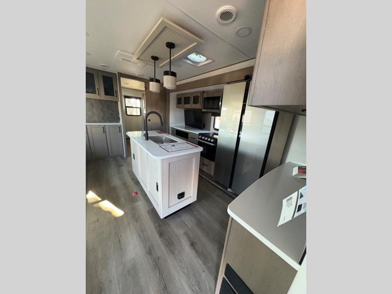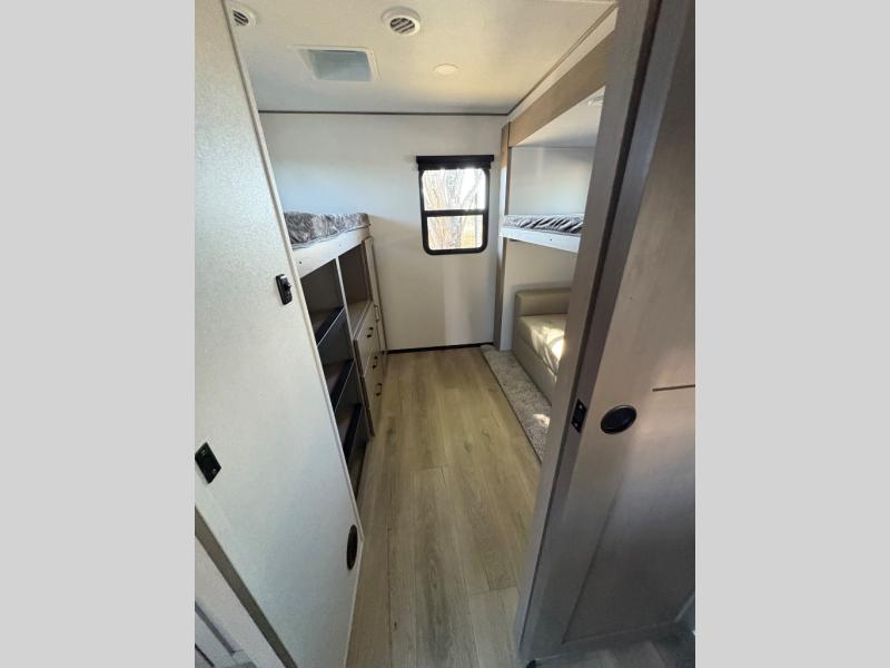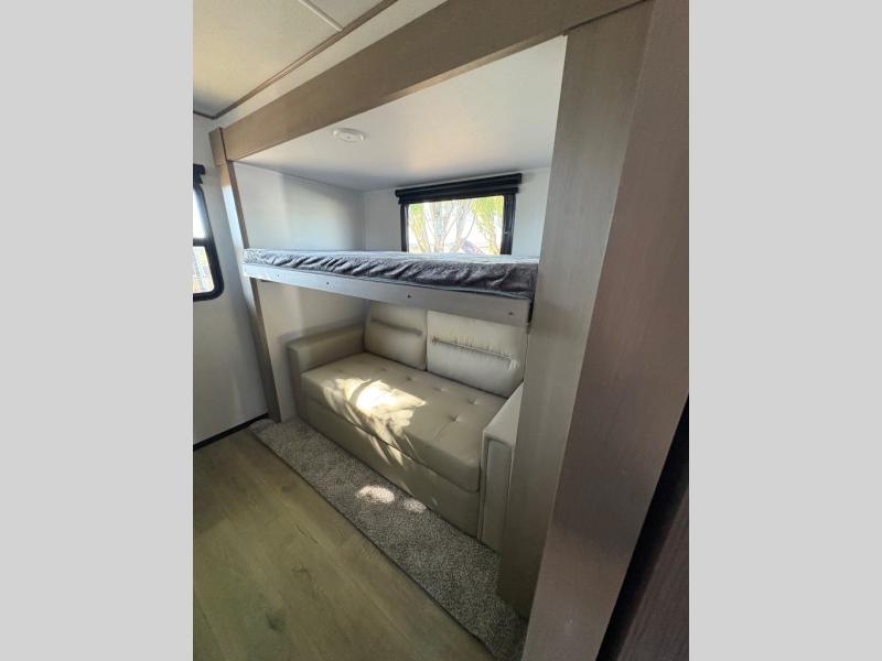 Finding the perfect trailer for a larger group is simple, take a look at this one for your next RV! The rear bunkhouse might be the first reason you fall in love because of the slide out with a flip bunk above a tri-fold sofa, the second bunk bed with a window on the opposite side and storage below, and the large rear window for great views. The outside kitchen might be another reason allowing you to enjoy the outdoors while providing meals for everyone, and/or the inside gourmet kitchen with a 16 cu. ft. refrigerator, an island, and two hutches. Everyone can gather together and relax on the theater seating with cupholders and the booth dinette or optional swivel dinette, or watch the 40" LED HDTV with fireplace below. The full bathroom includes a space savings sliding door and linen storage, and the bedroom gives you a front walk-around queen bed with storage for your clothes on each side, plus there is an additional wardrobe with drawers for your clothes!
