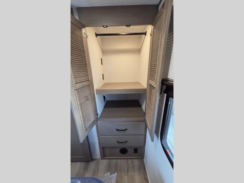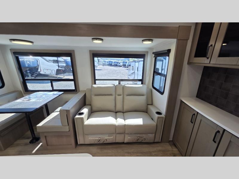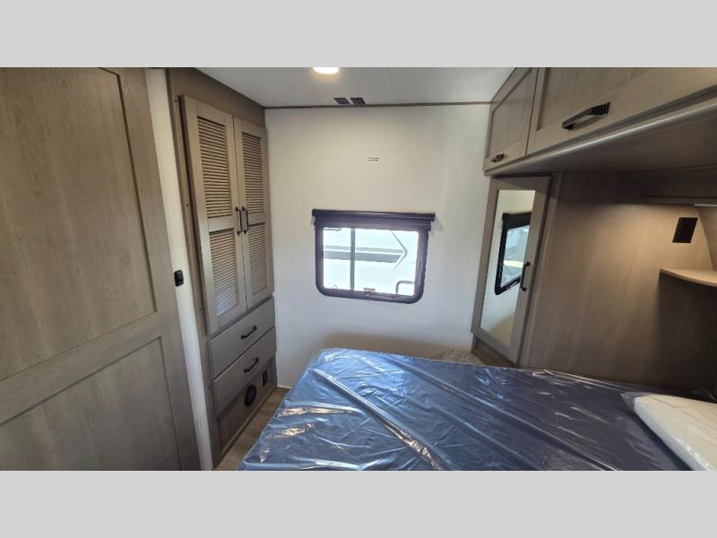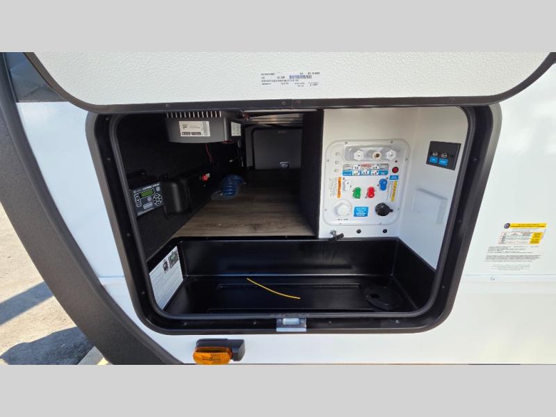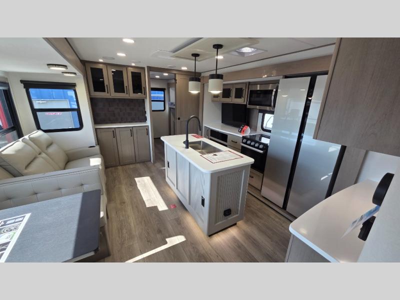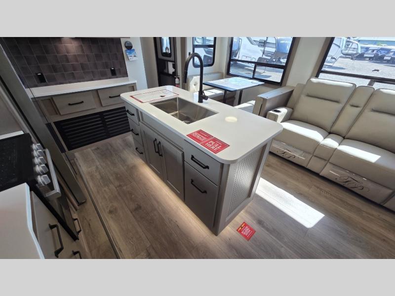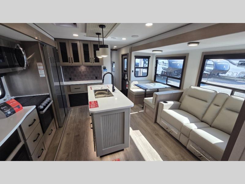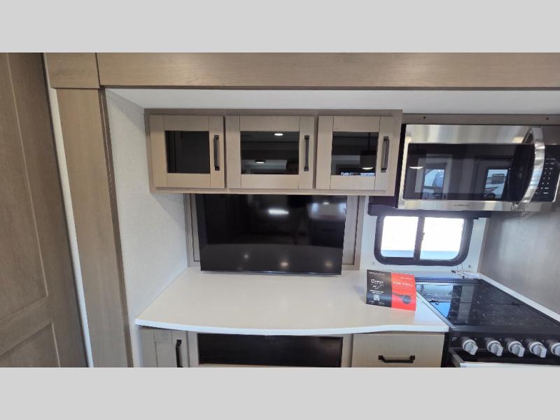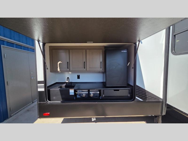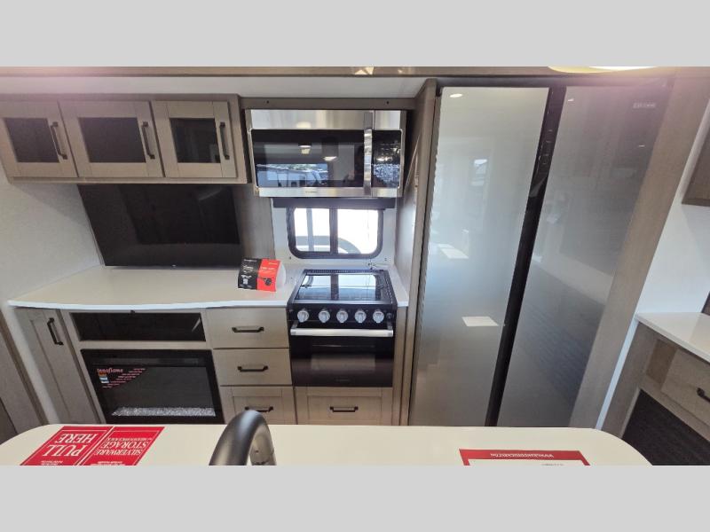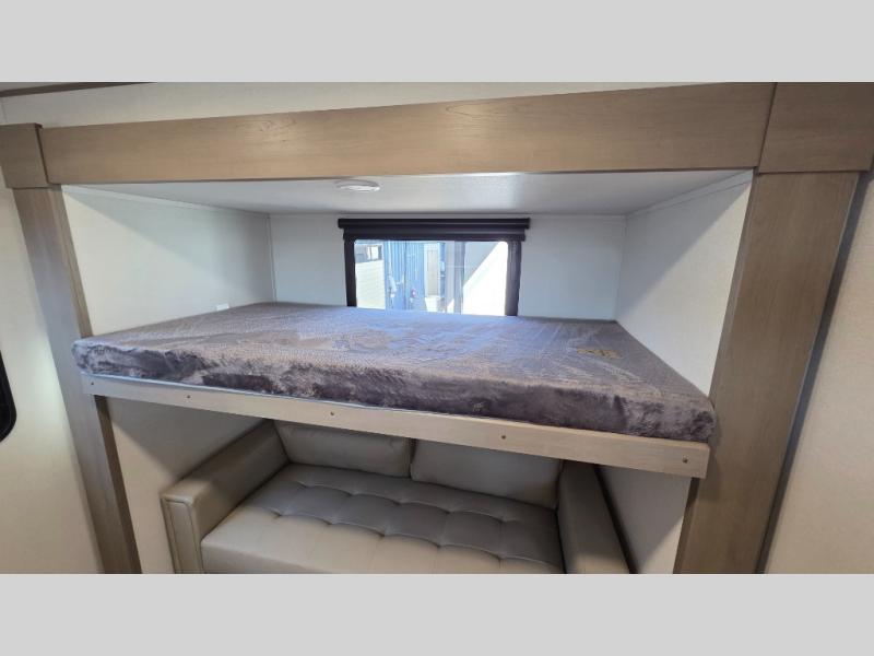 Finding the perfect trailer for a larger group is simple, take a look at this one for your next RV! The rear bunkhouse might be the first reason you fall in love because of the slide out with a flip bunk above a tri-fold sofa, the second bunk bed with a window on the opposite side and storage below, and the large rear window for great views. The outside kitchen might be another reason allowing you to enjoy the outdoors while providing meals for everyone, and/or the inside gourmet kitchen with a 16 cu. ft. refrigerator, an island, and two hutches. Everyone can gather together and relax on the theater seating with cupholders and the booth dinette or optional swivel dinette, or watch the 40" LED HDTV with fireplace below. The full bathroom includes a space savings sliding door and linen storage, and the bedroom gives you a front walk-around queen bed with storage for your clothes on each side, plus there is an additional wardrobe with drawers for your clothes!