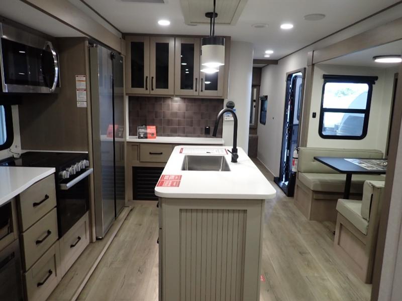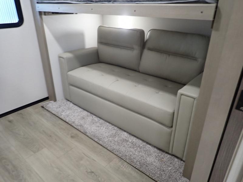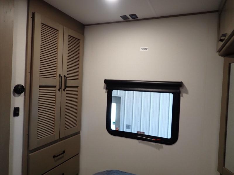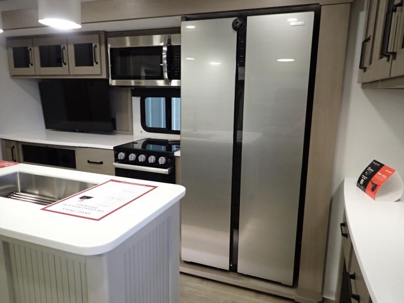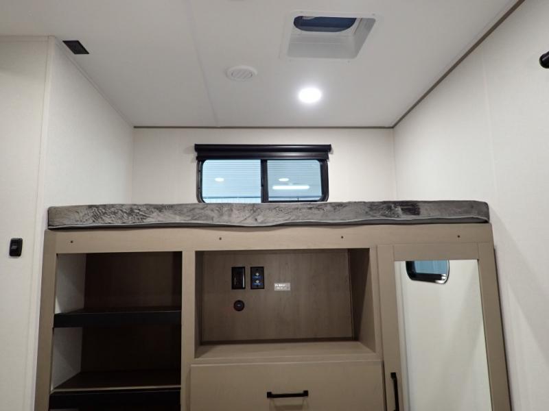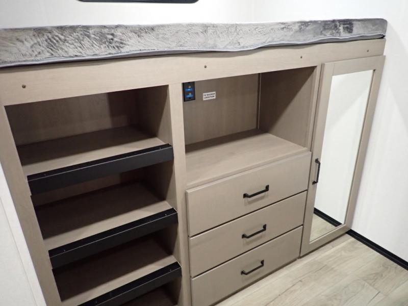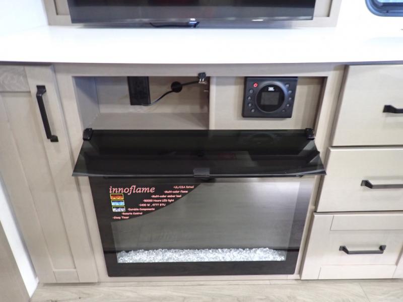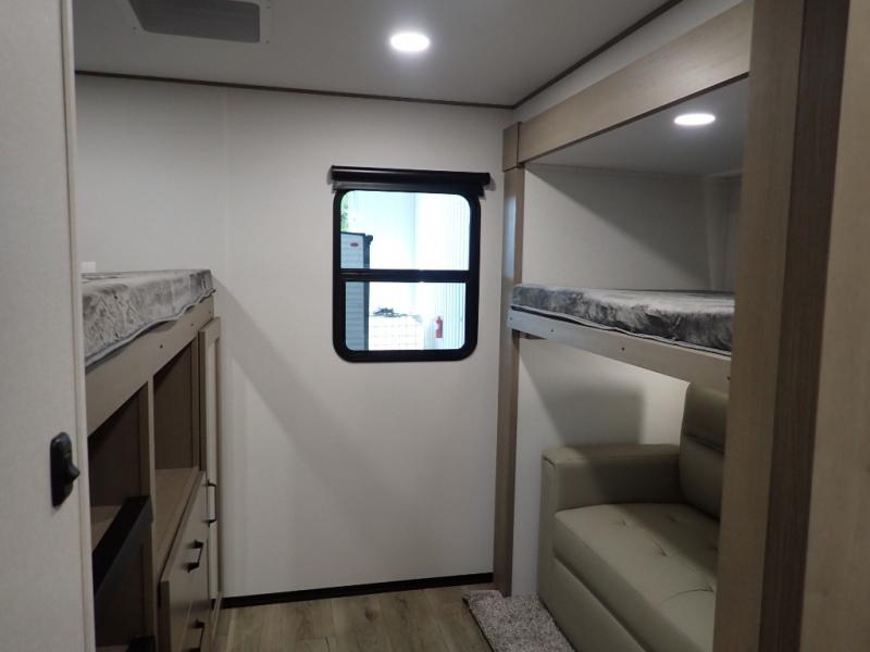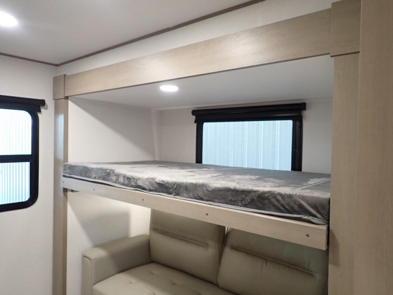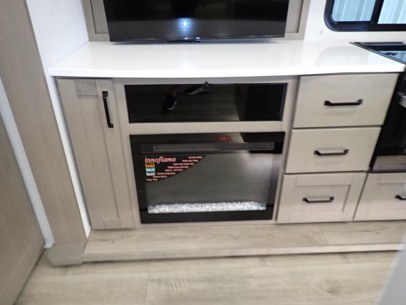 Finding the perfect trailer for a larger group is simple, take a look at this one for your next RV! The rear bunkhouse might be the first reason you fall in love because of the slide out with a flip bunk above a tri-fold sofa, the second bunk bed with a window on the opposite side and storage below, and the large rear window for great views. The outside kitchen might be another reason allowing you to enjoy the outdoors while providing meals for everyone, and/or the inside gourmet kitchen with a 16 cu. ft. refrigerator, an island, and two hutches. Everyone can gather together and relax on the theater seating with cupholders and the booth dinette or optional swivel dinette, or watch the 40" LED HDTV with fireplace below. The full bathroom includes a space savings sliding door and linen storage, and the bedroom gives you a front walk-around queen bed with storage for your clothes on each side, plus there is an additional wardrobe with drawers for your clothes!