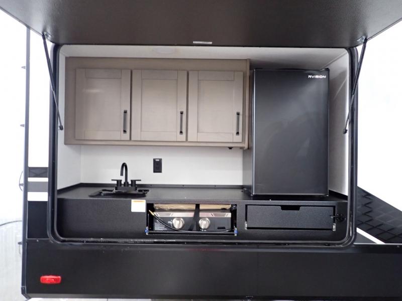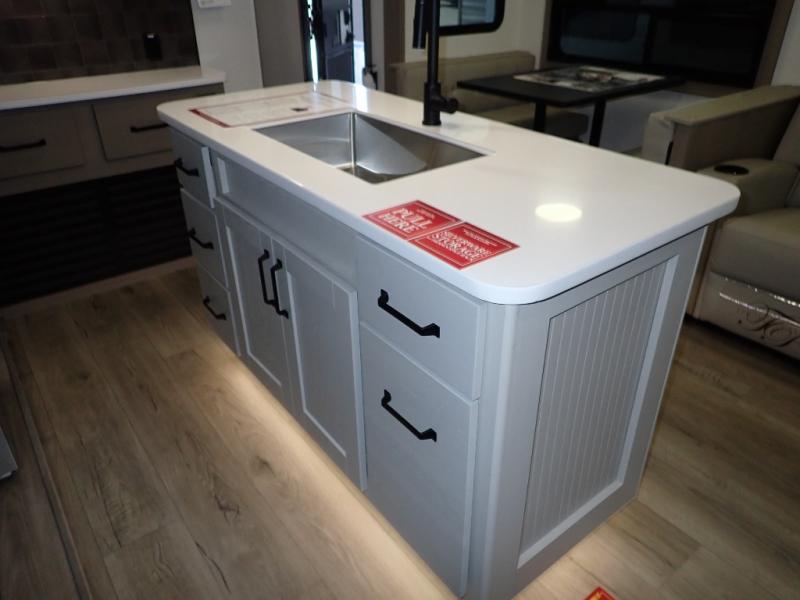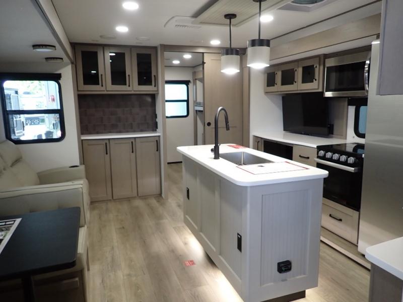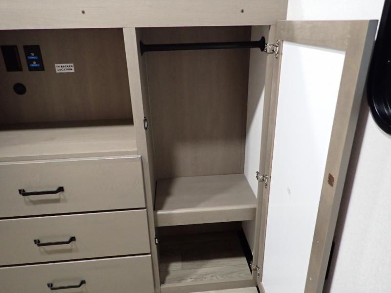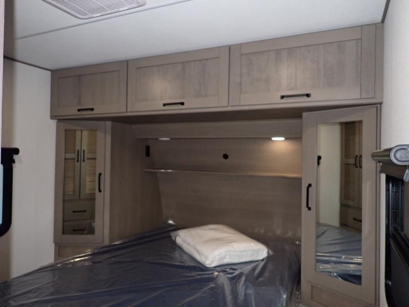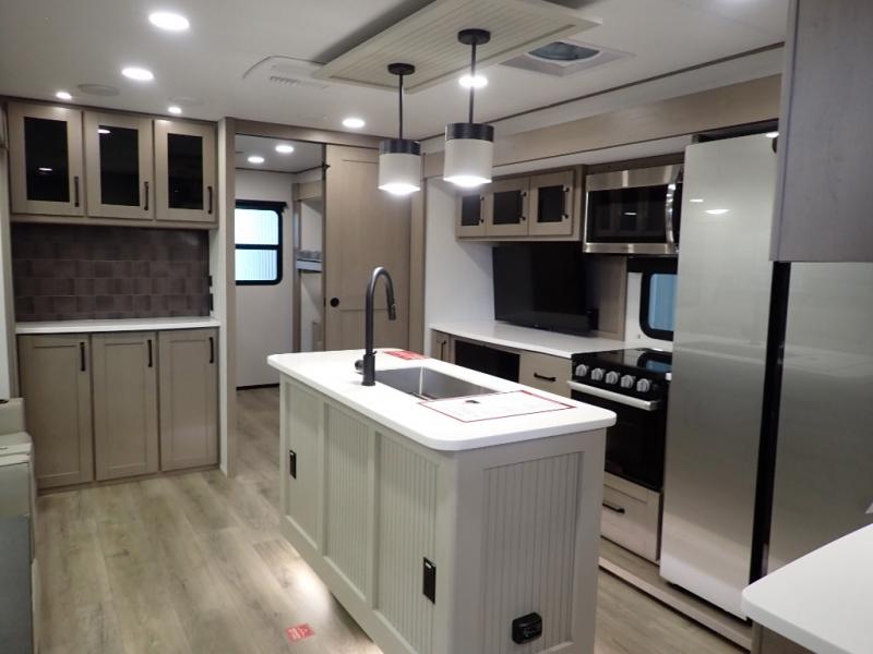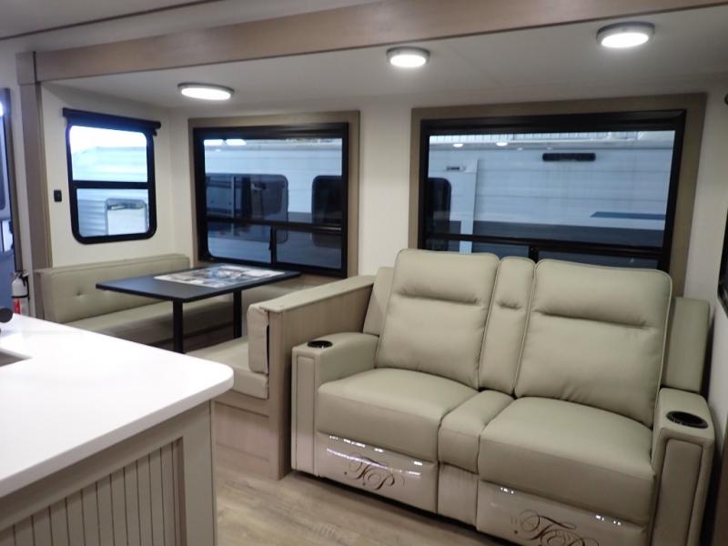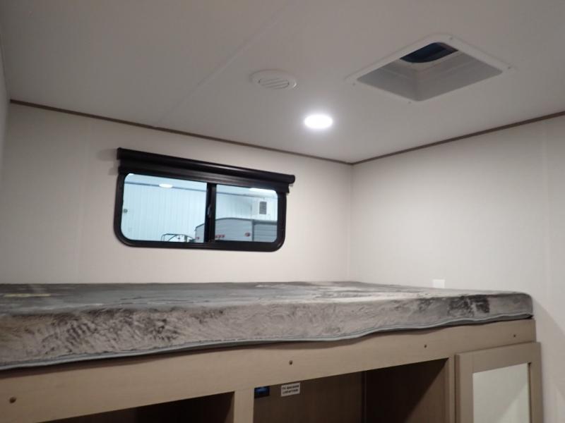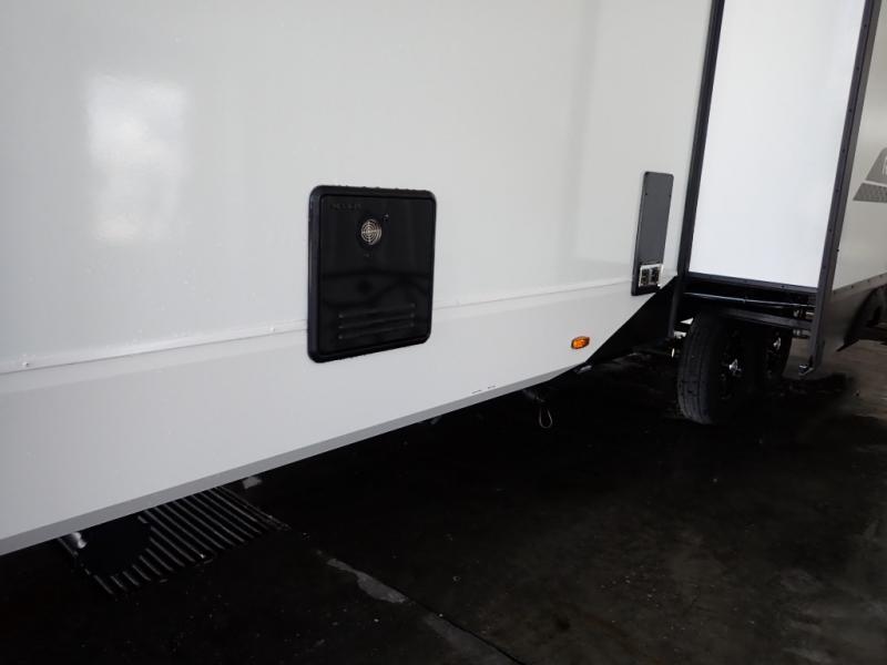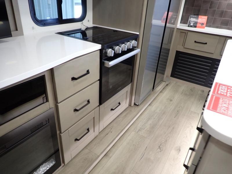 Finding the perfect trailer for a larger group is simple, take a look at this one for your next RV! The rear bunkhouse might be the first reason you fall in love because of the slide out with a flip bunk above a tri-fold sofa, the second bunk bed with a window on the opposite side and storage below, and the large rear window for great views. The outside kitchen might be another reason allowing you to enjoy the outdoors while providing meals for everyone, and/or the inside gourmet kitchen with a 16 cu. ft. refrigerator, an island, and two hutches. Everyone can gather together and relax on the theater seating with cupholders and the booth dinette or optional swivel dinette, or watch the 40" LED HDTV with fireplace below. The full bathroom includes a space savings sliding door and linen storage, and the bedroom gives you a front walk-around queen bed with storage for your clothes on each side, plus there is an additional wardrobe with drawers for your clothes!