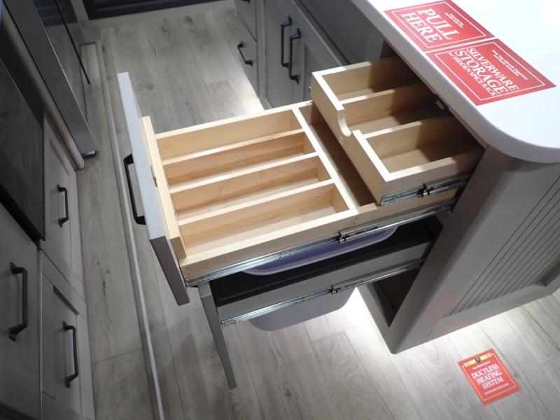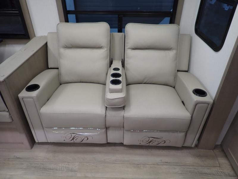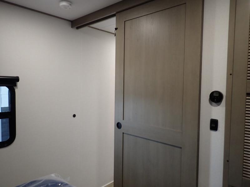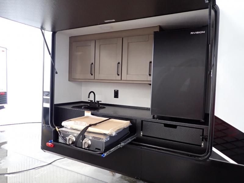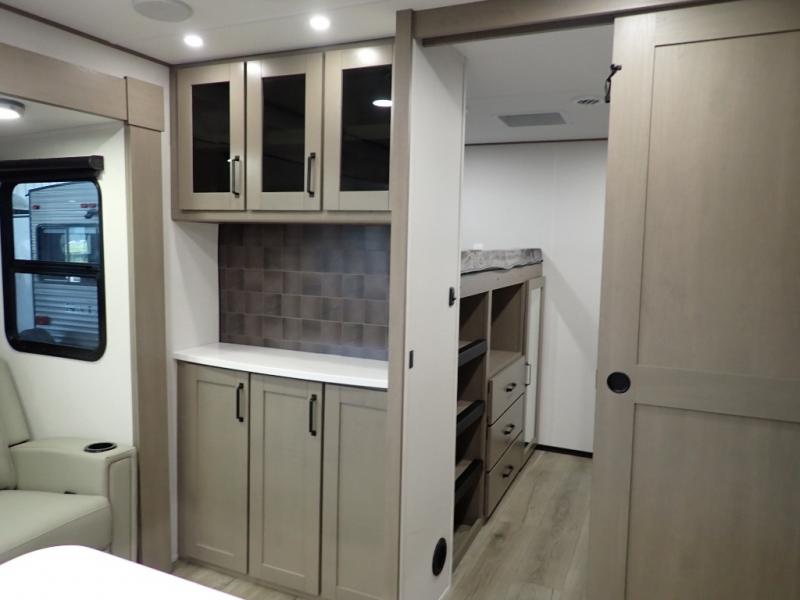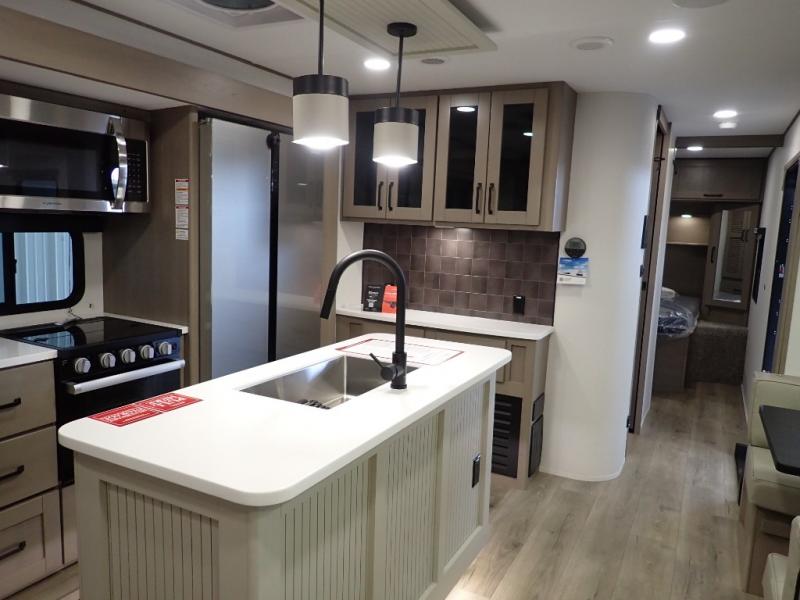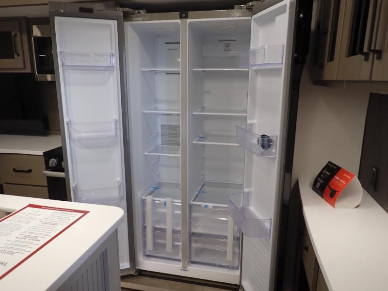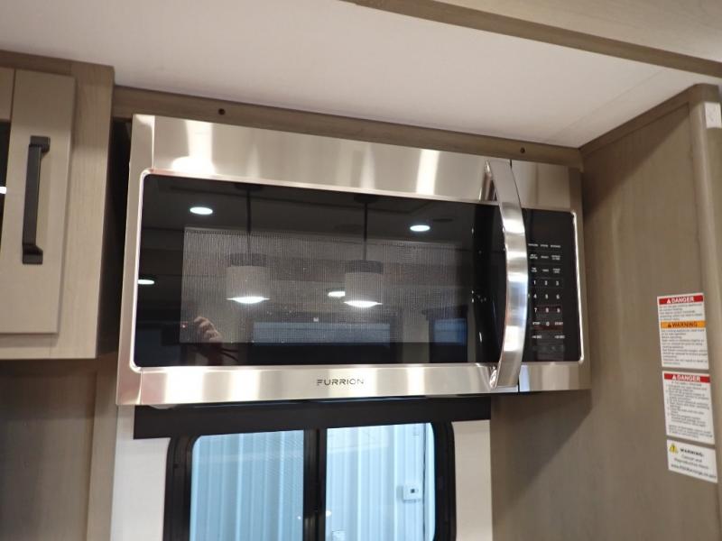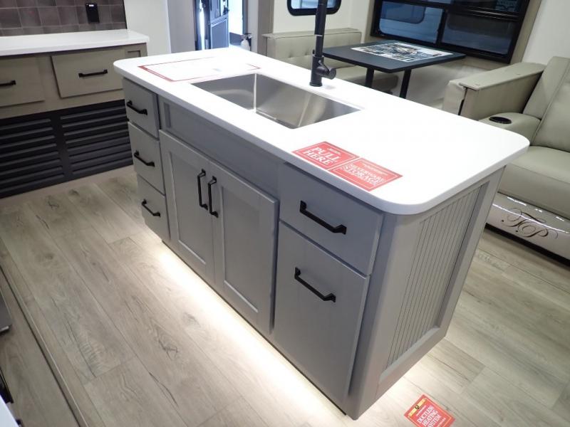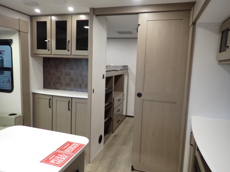 Finding the perfect trailer for a larger group is simple, take a look at this one for your next RV! The rear bunkhouse might be the first reason you fall in love because of the slide out with a flip bunk above a tri-fold sofa, the second bunk bed with a window on the opposite side and storage below, and the large rear window for great views. The outside kitchen might be another reason allowing you to enjoy the outdoors while providing meals for everyone, and/or the inside gourmet kitchen with a 16 cu. ft. refrigerator, an island, and two hutches. Everyone can gather together and relax on the theater seating with cupholders and the booth dinette or optional swivel dinette, or watch the 40" LED HDTV with fireplace below. The full bathroom includes a space savings sliding door and linen storage, and the bedroom gives you a front walk-around queen bed with storage for your clothes on each side, plus there is an additional wardrobe with drawers for your clothes!