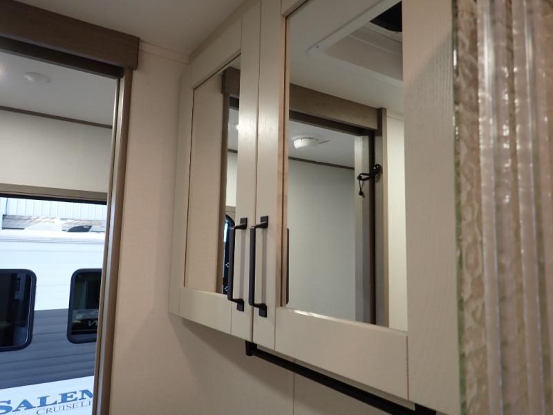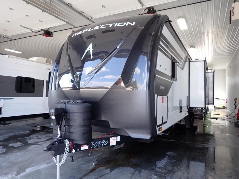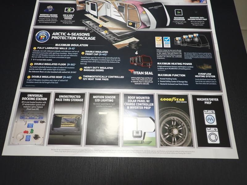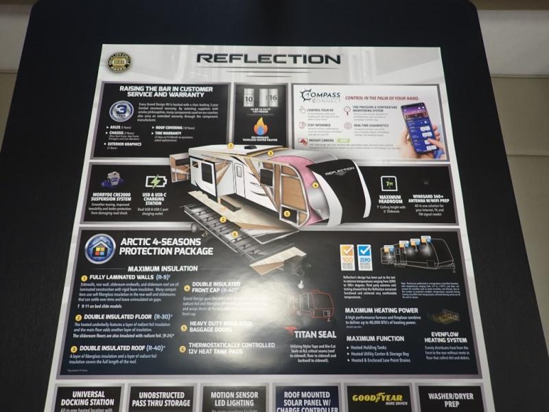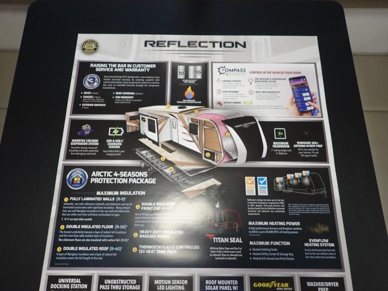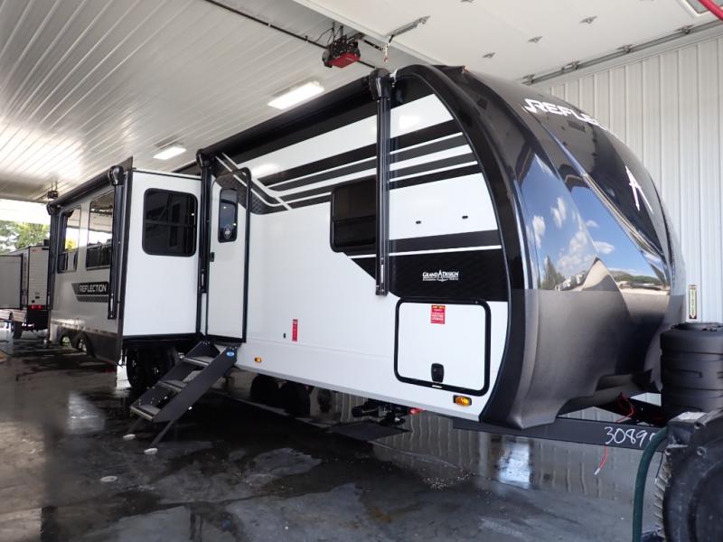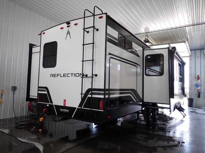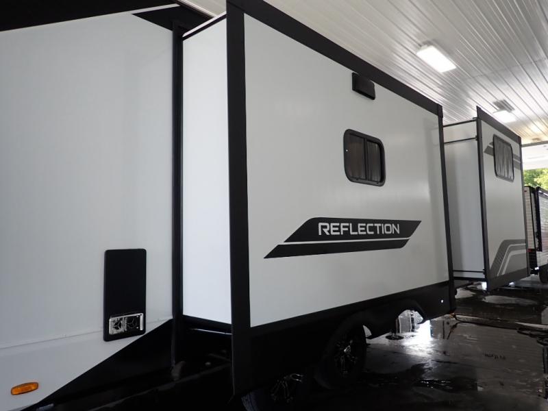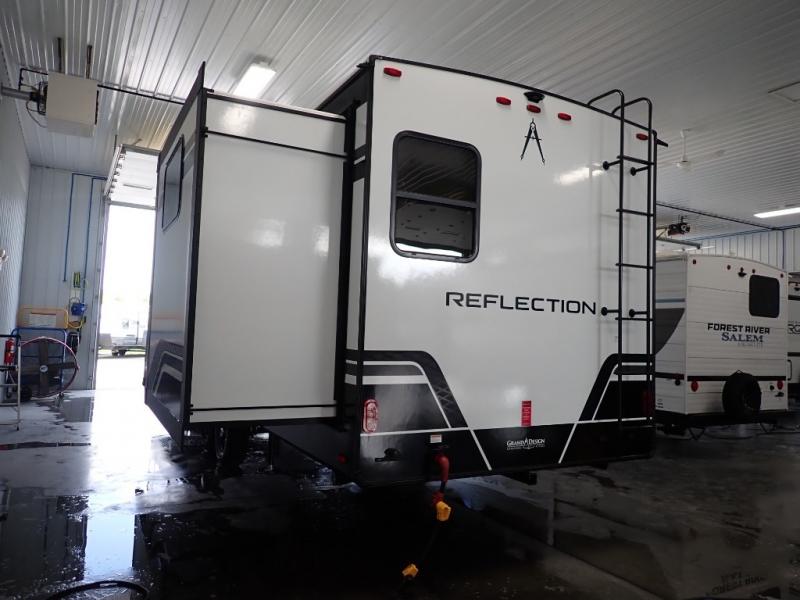 With any Reflection travel trailer by Grand Design, you will have a solar panel for off-grid camping and a 60 amp charge controller and inverter prep, a Universal All-In-One docking station, unobstructed pass-through storage, and Goodyear Endurance tires. Each is constructed of gel coat exterior sidewalls, residential 5" truss rafters, walk-on roof decking, a fiberglass and radiant foil roof and front cap insulation plus laminated aluminum framed side walls, roof and end walls in slide rooms. Head inside to enjoy residential hardwood cabinet doors, premium Congoleum flooring, a spacious shower with a glass door, and many more comforts!