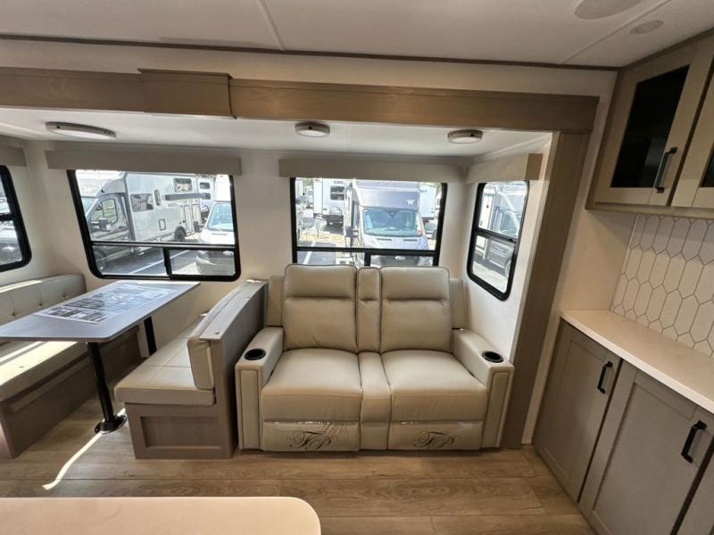Finding the perfect trailer for a larger group is simple, take a look at this one for your next RV! The rear bunkhouse might be the first reason you fall in love because of the slide out with a flip bunk above a tri-fold sofa, the second bunk bed with a window on the opposite side and storage below, and the large rear window for great views. The outside kitchen might be another reason allowing you to enjoy the outdoors while providing meals for everyone, and/or the inside gourmet kitchen with a 16 cu. ft. refrigerator, an island, and two hutches. Everyone can gather together and relax on the theater seating with cupholders and the booth dinette or optional swivel dinette, or watch the 40" LED HDTV with fireplace below. The full bathroom includes a space savings sliding door and linen storage, and the bedroom gives you a front walk-around queen bed with storage for your clothes on each side, plus there is an additional wardrobe with drawers for your clothes!