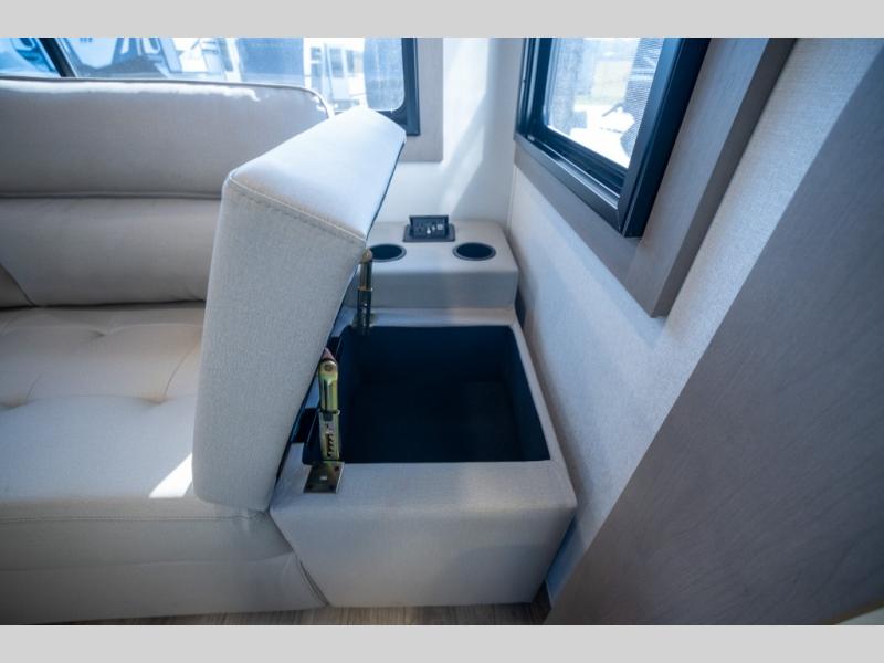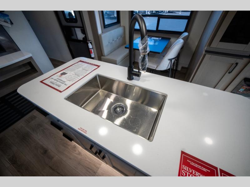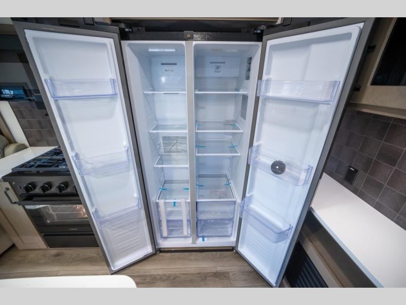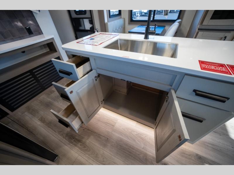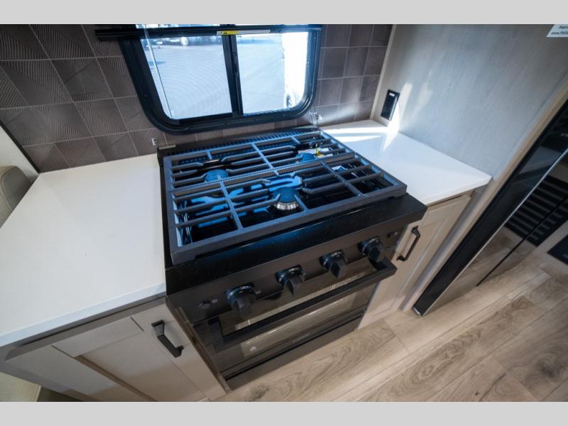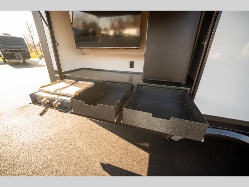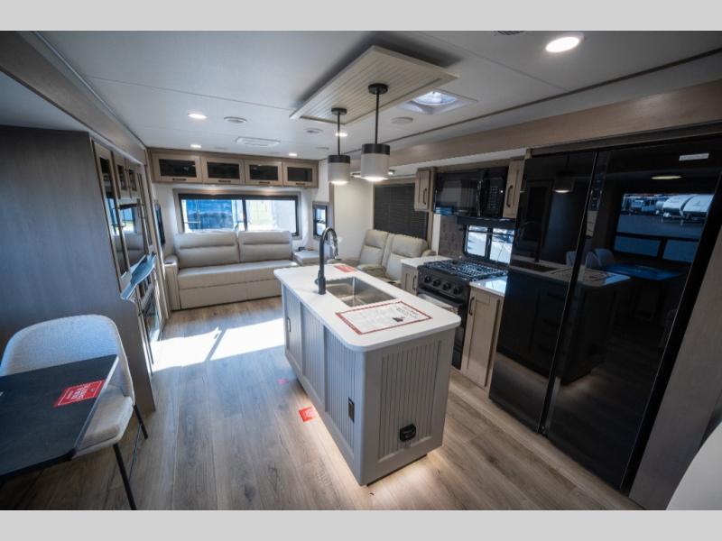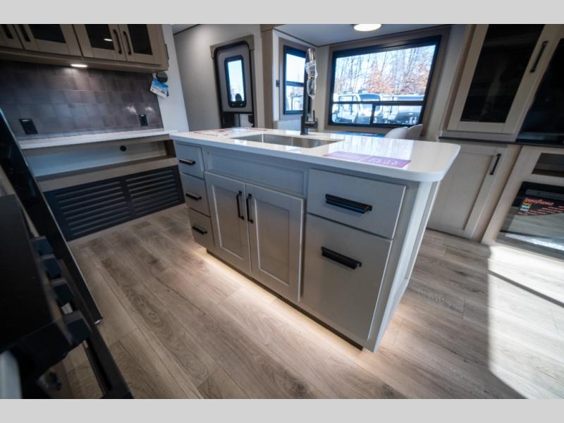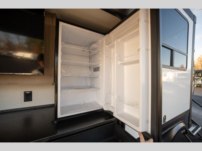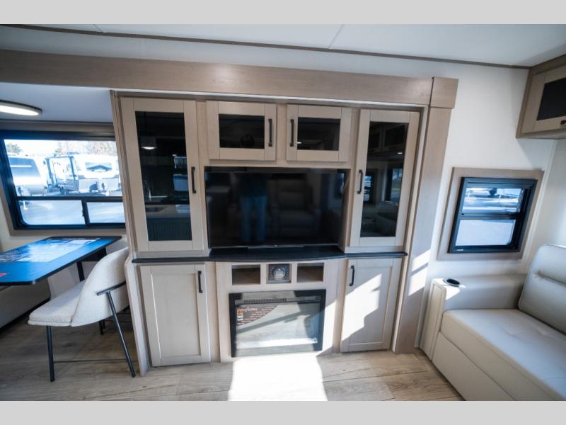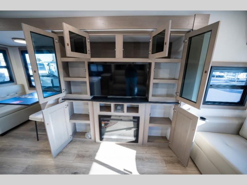 Whether you travel to explore or relax, this trailer will give you the choice depending where you park it! The kitchen amenities offer a gourmet kitchen including a 16 cu. ft. refrigerator, an island, and a hutch. You and your guests will find theater seating with cupholders, a booth dinette or optional swivel dinette, and a tri-fold sofa to sit on and visit while you watch the 40" LED HDTV with a fireplace below. The full bathroom includes a space saving sliding door and linen storage, and the bedroom gives you a front walk-around queen bed with storage for your clothes on each side. There is even washer and dryer prep here if you choose to go full-time. Outside, you'll find a 12' electric awning, an LP Quick Connect and Coax TV hookup, plus an exterior griddle, 4.1 cu. ft. refrigerator and outside spray port!