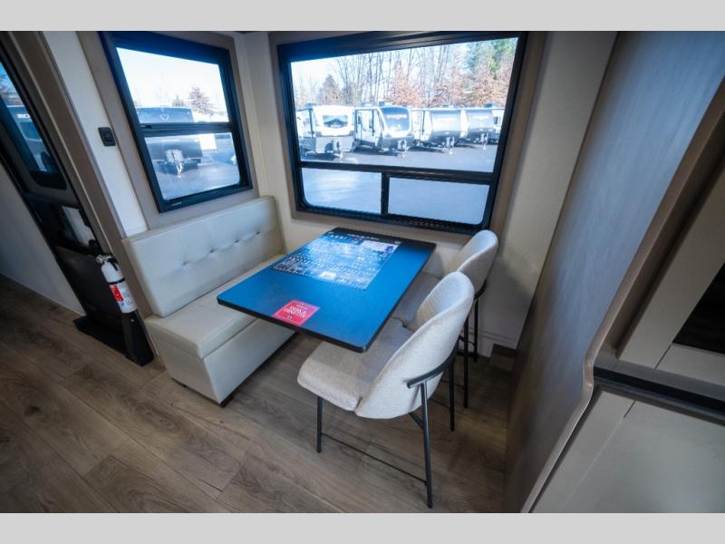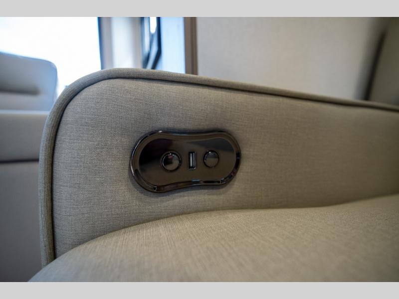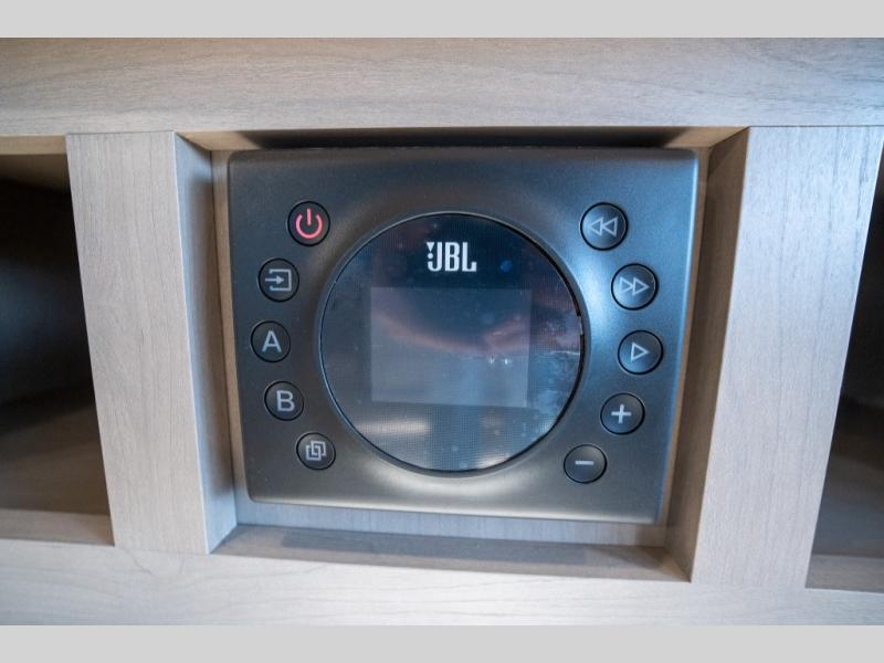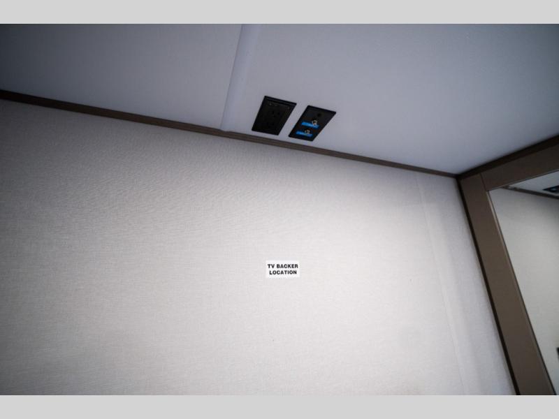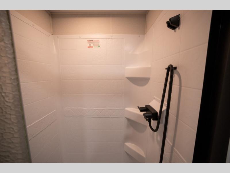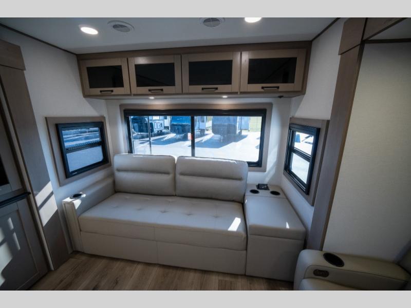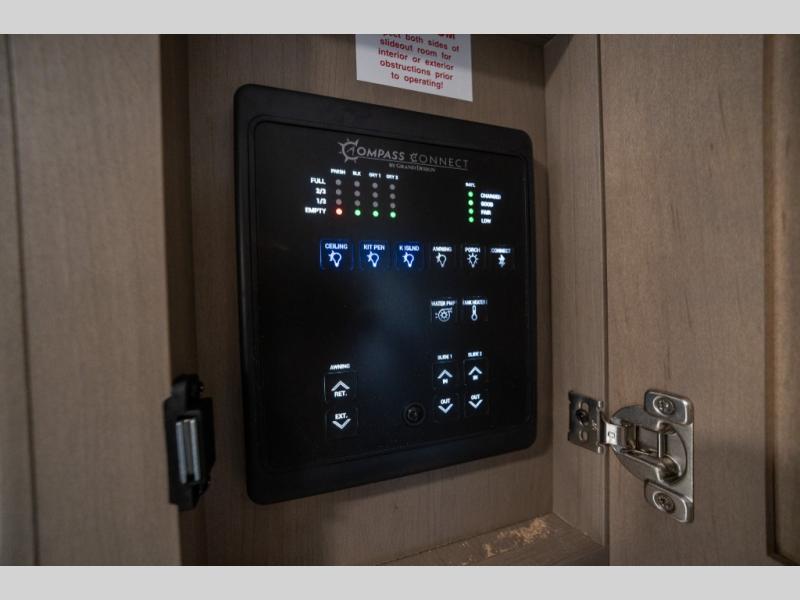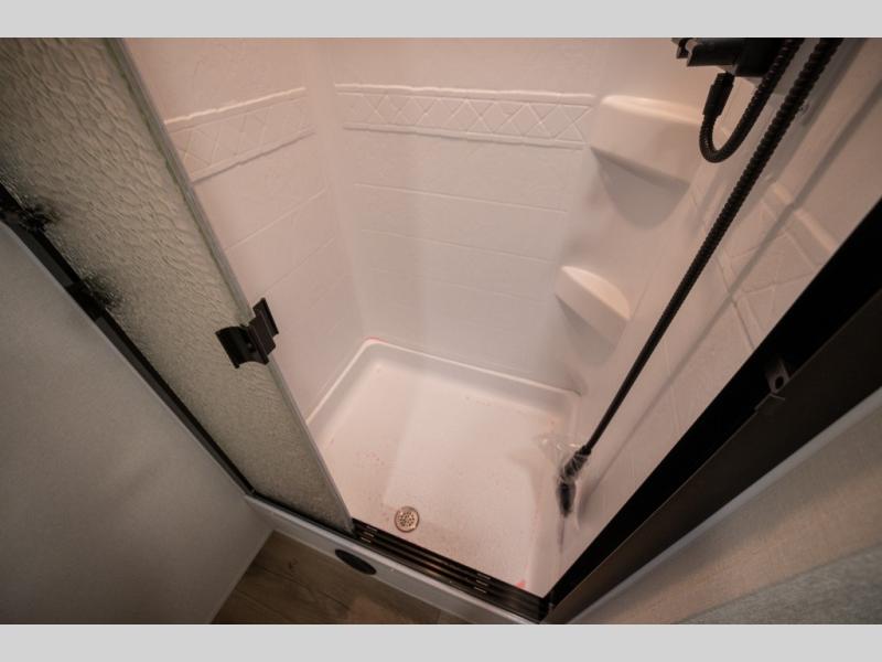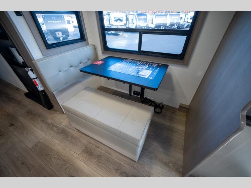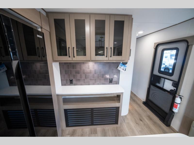 Whether you travel to explore or relax, this trailer will give you the choice depending where you park it! The kitchen amenities offer a gourmet kitchen including a 16 cu. ft. refrigerator, an island, and a hutch. You and your guests will find theater seating with cupholders, a booth dinette or optional swivel dinette, and a tri-fold sofa to sit on and visit while you watch the 40" LED HDTV with a fireplace below. The full bathroom includes a space saving sliding door and linen storage, and the bedroom gives you a front walk-around queen bed with storage for your clothes on each side. There is even washer and dryer prep here if you choose to go full-time. Outside, you'll find a 12' electric awning, an LP Quick Connect and Coax TV hookup, plus an exterior griddle, 4.1 cu. ft. refrigerator and outside spray port!