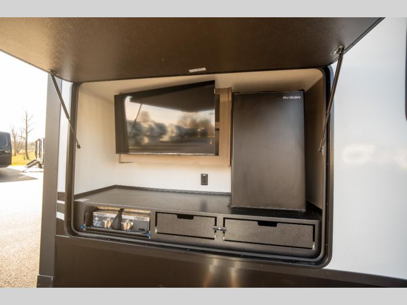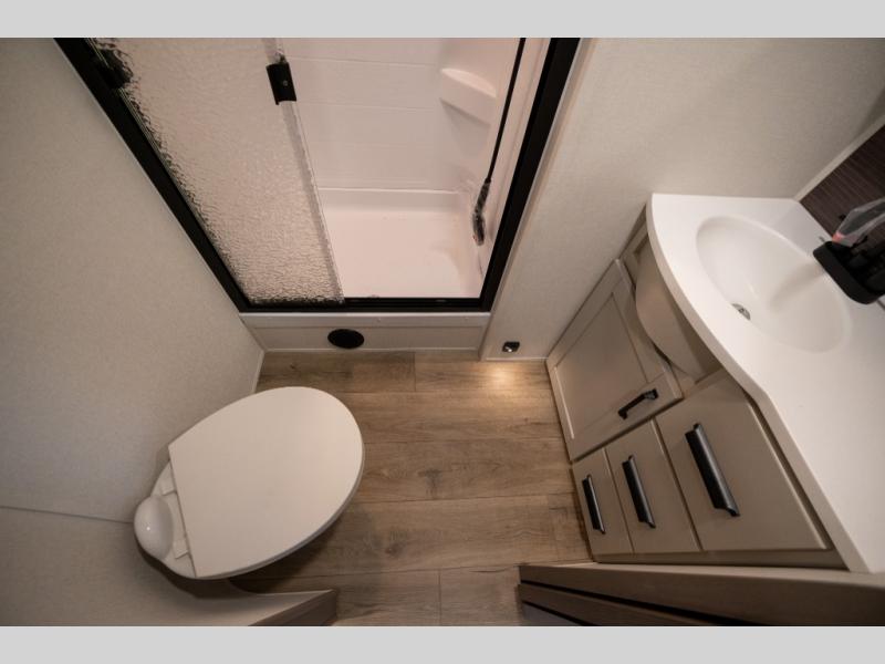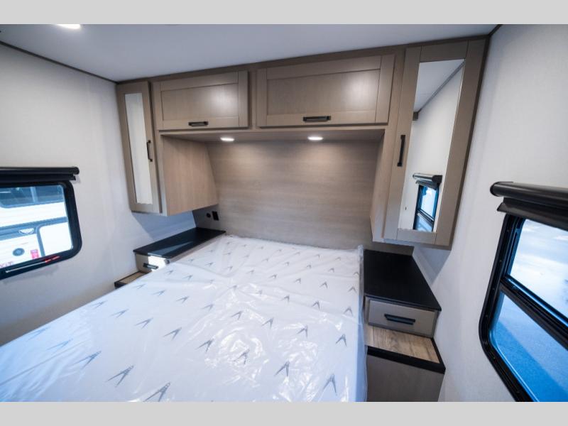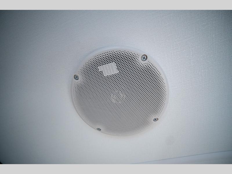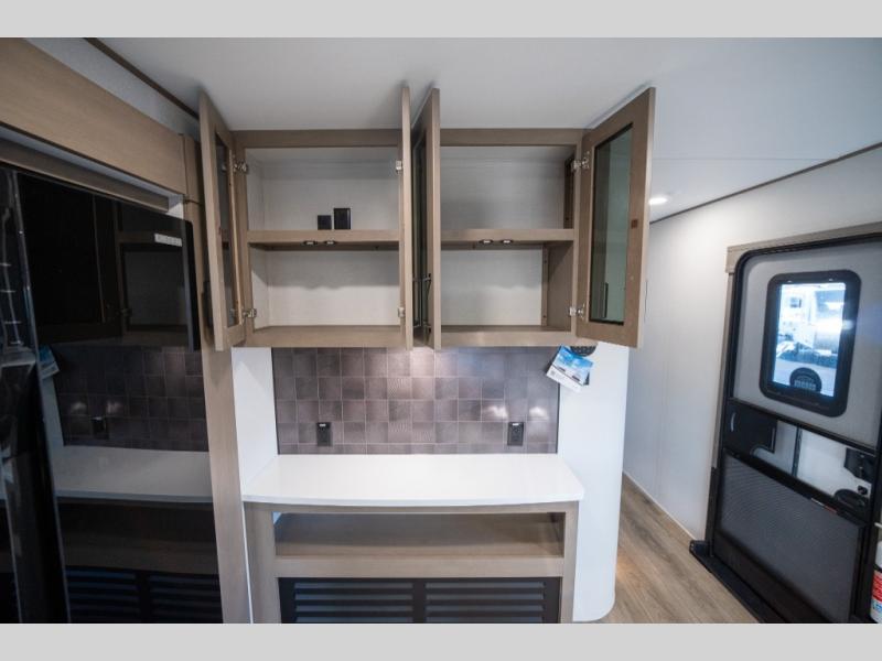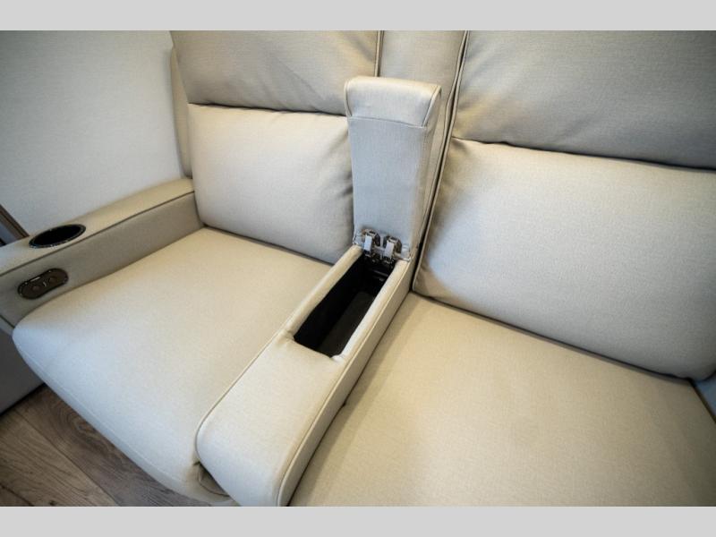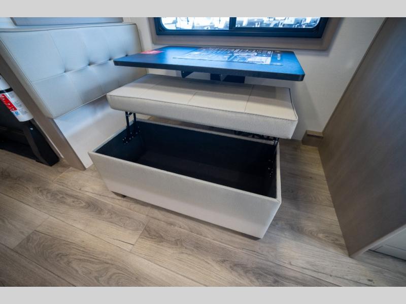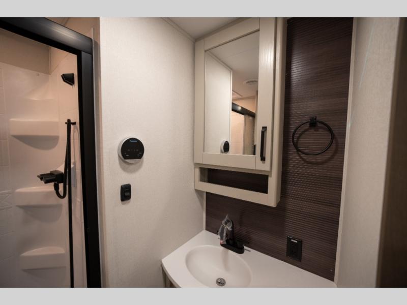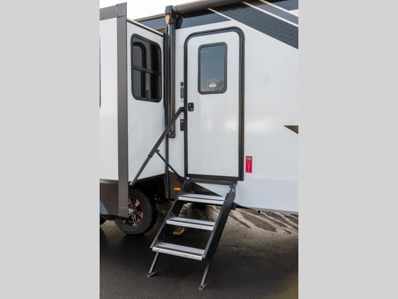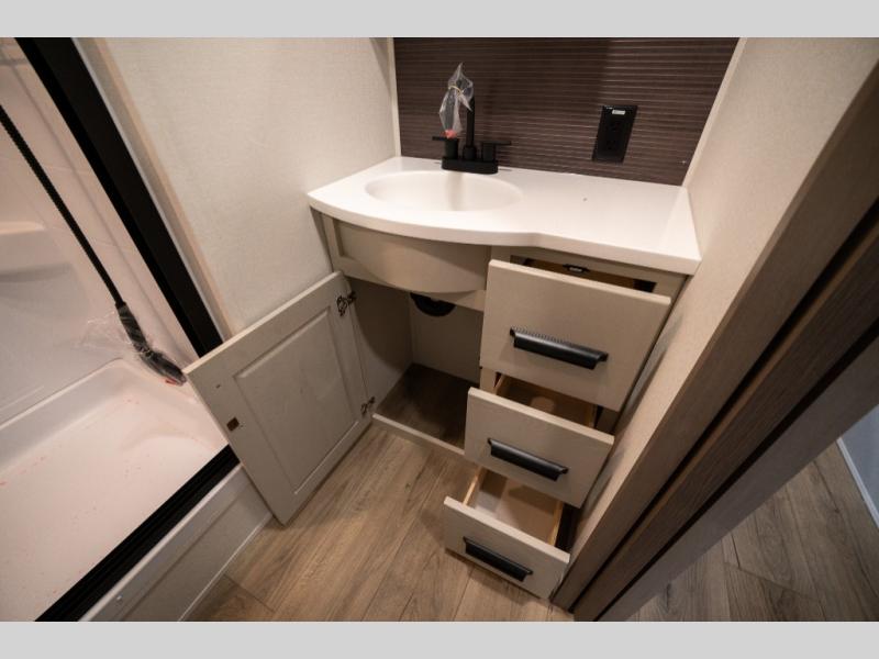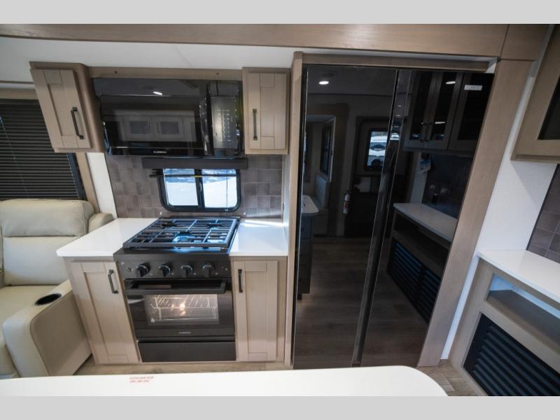 Whether you travel to explore or relax, this trailer will give you the choice depending where you park it! The kitchen amenities offer a gourmet kitchen including a 16 cu. ft. refrigerator, an island, and a hutch. You and your guests will find theater seating with cupholders, a booth dinette or optional swivel dinette, and a tri-fold sofa to sit on and visit while you watch the 40" LED HDTV with a fireplace below. The full bathroom includes a space saving sliding door and linen storage, and the bedroom gives you a front walk-around queen bed with storage for your clothes on each side. There is even washer and dryer prep here if you choose to go full-time. Outside, you'll find a 12' electric awning, an LP Quick Connect and Coax TV hookup, plus an exterior griddle, 4.1 cu. ft. refrigerator and outside spray port!