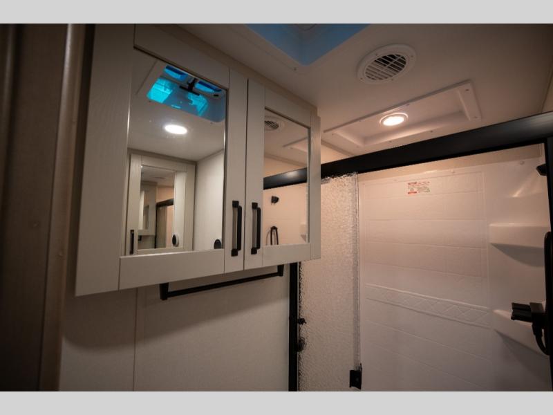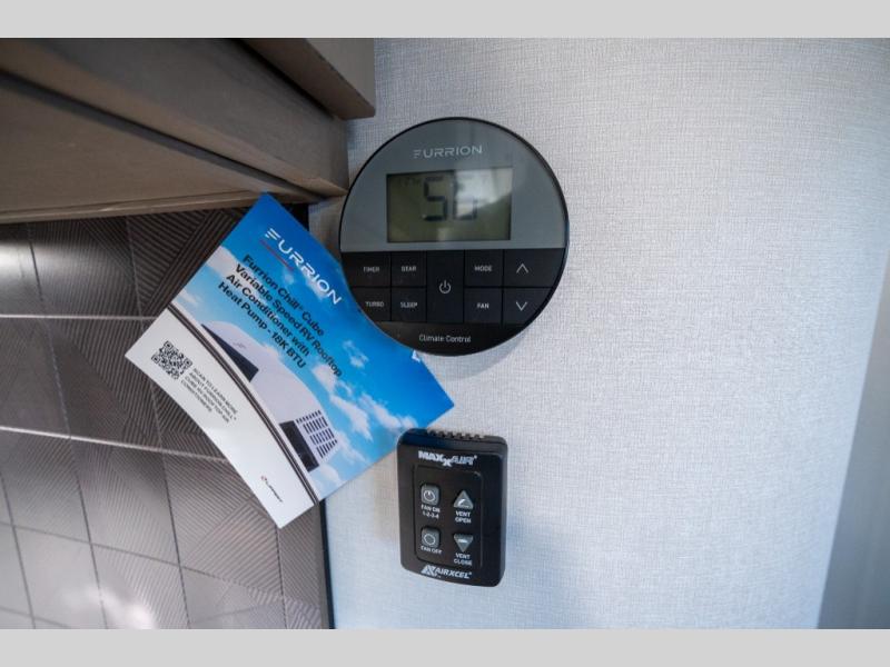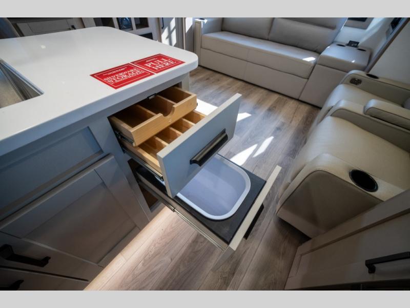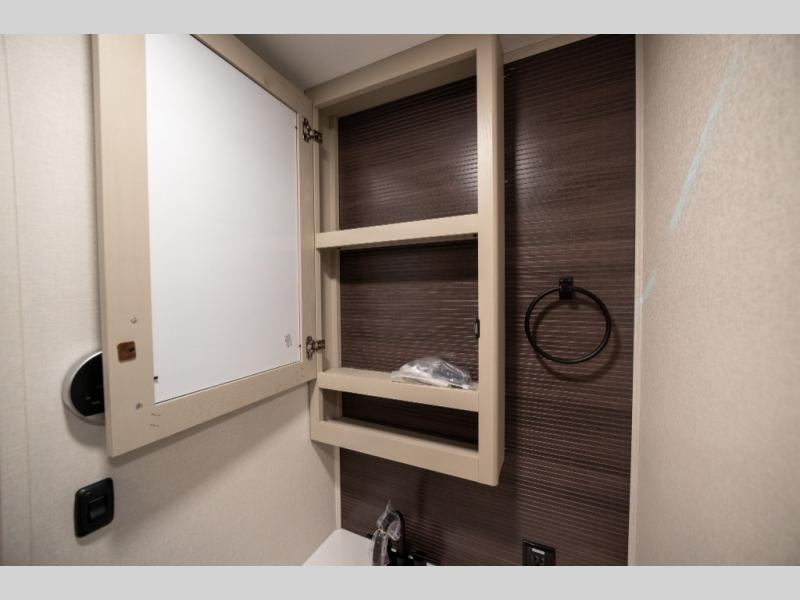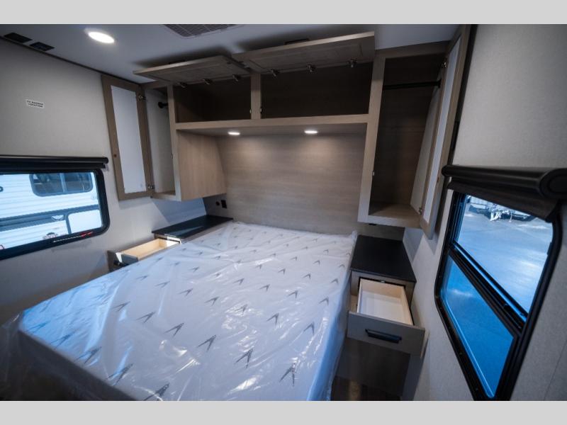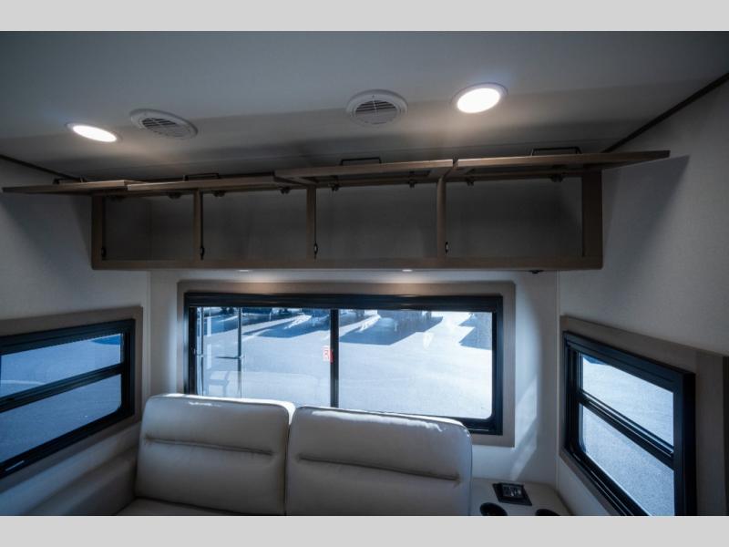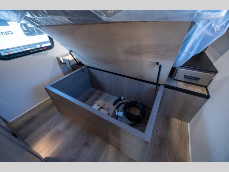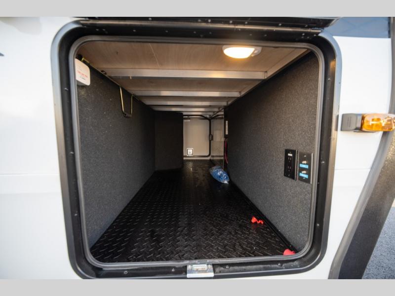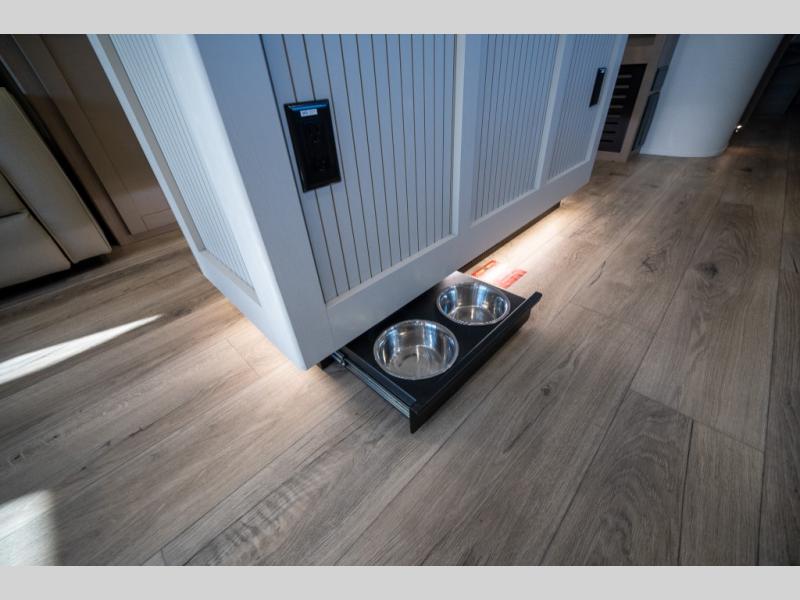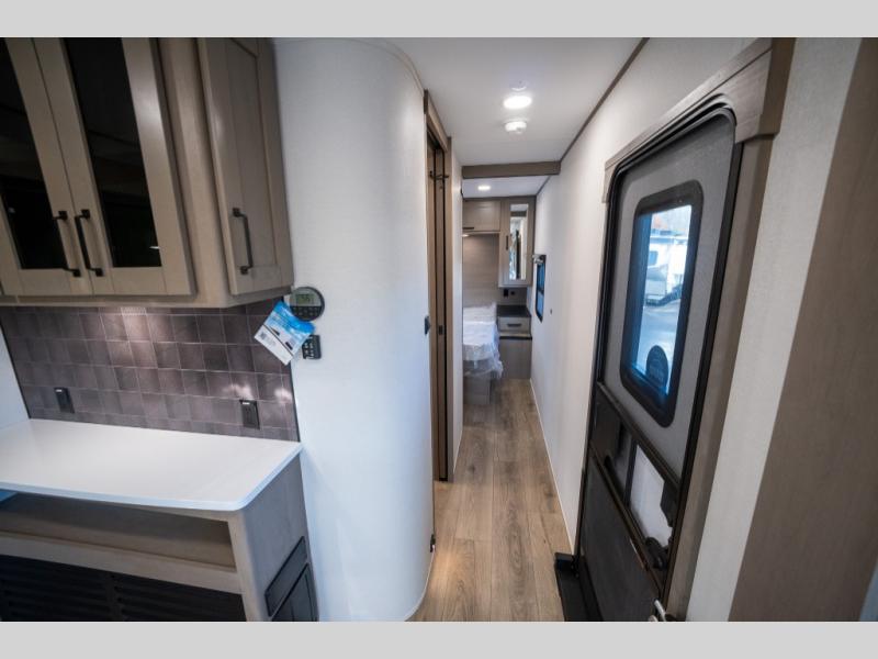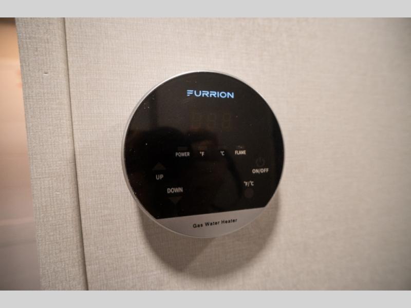 Whether you travel to explore or relax, this trailer will give you the choice depending where you park it! The kitchen amenities offer a gourmet kitchen including a 16 cu. ft. refrigerator, an island, and a hutch. You and your guests will find theater seating with cupholders, a booth dinette or optional swivel dinette, and a tri-fold sofa to sit on and visit while you watch the 40" LED HDTV with a fireplace below. The full bathroom includes a space saving sliding door and linen storage, and the bedroom gives you a front walk-around queen bed with storage for your clothes on each side. There is even washer and dryer prep here if you choose to go full-time. Outside, you'll find a 12' electric awning, an LP Quick Connect and Coax TV hookup, plus an exterior griddle, 4.1 cu. ft. refrigerator and outside spray port!