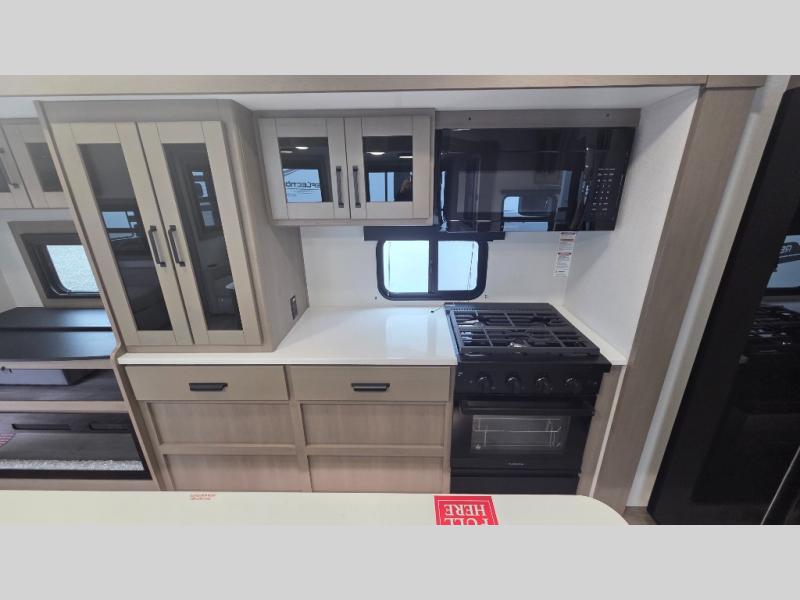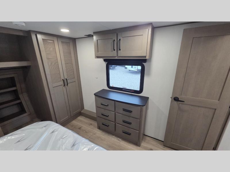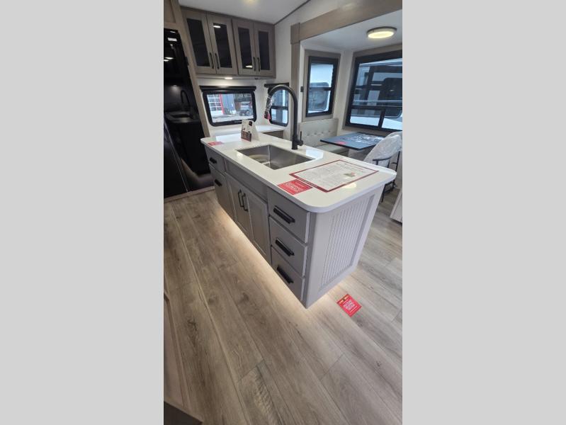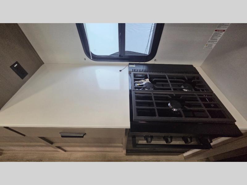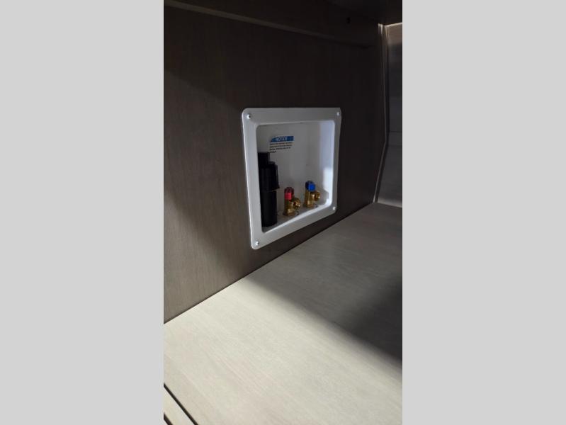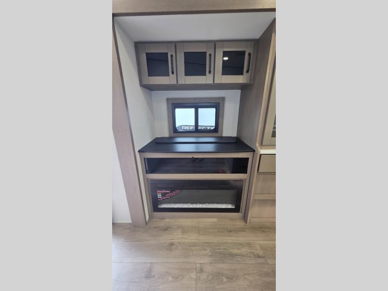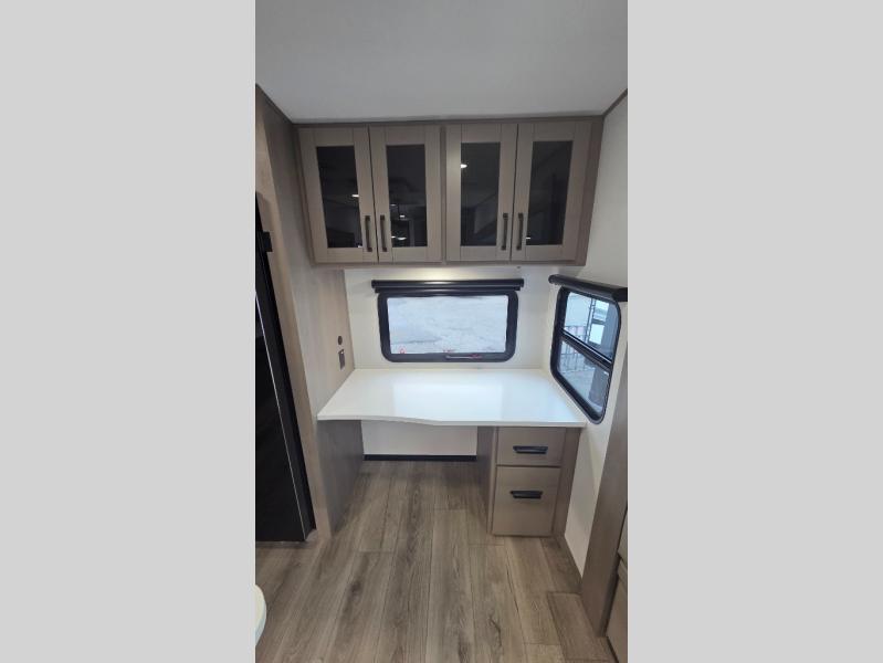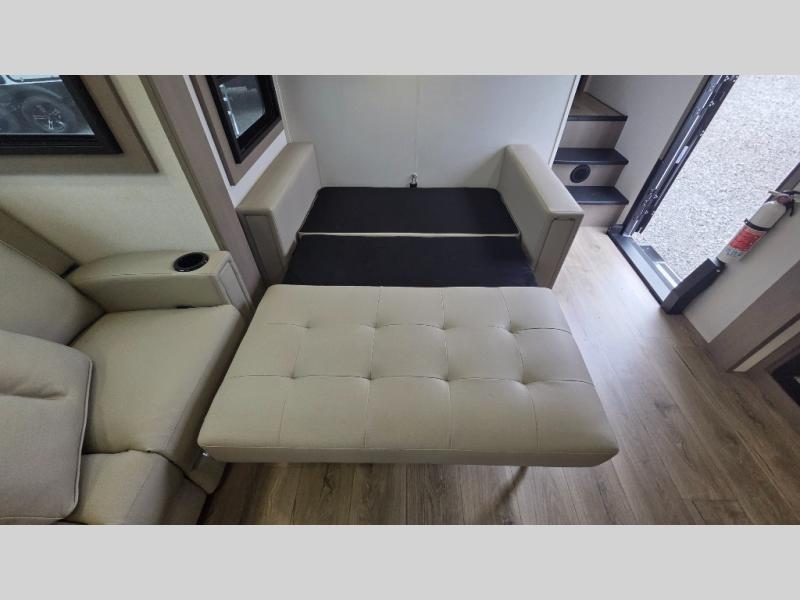 Comfortable accommodations are found throughout this fifth wheel so you can relax, unwind and enjoy your vacation be it for a weekend or a month and even when you have to work! Thanks to the rear desk with a chair and the bedroom with washer and dryer prep, you could stay in this RV as long as you like and keep all your clothes and linens clean. The front bedroom also provides a front wall wardrobe, a slide out queen bed and a dresser. The spacious shower has a glass door and there is linen storage in the full bathroom. The spacious main living and kitchen area has two slide outs with full kitchen amenities and seating with theater seats including cupholders, a booth dinette, and a tri-fold sofa. And the exterior offers an outside kitchen with a griddle, a 1.6 cu ft. refrigerator, and two power awnings!