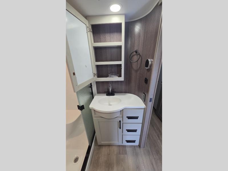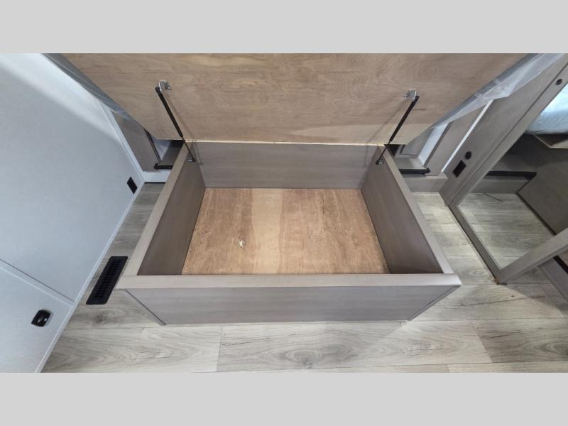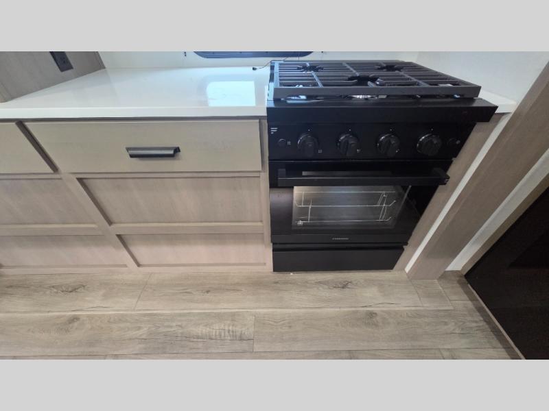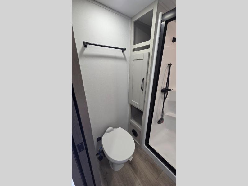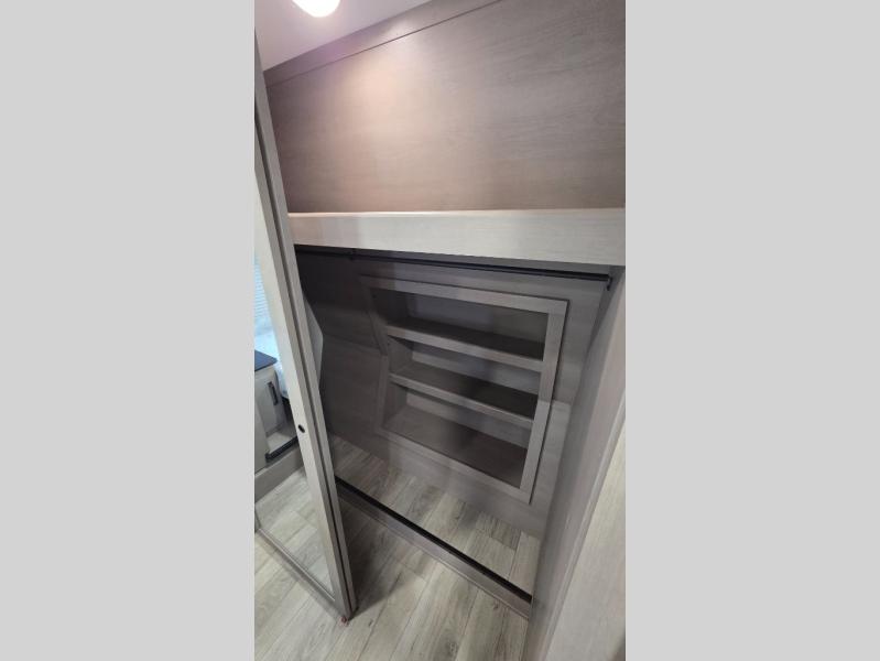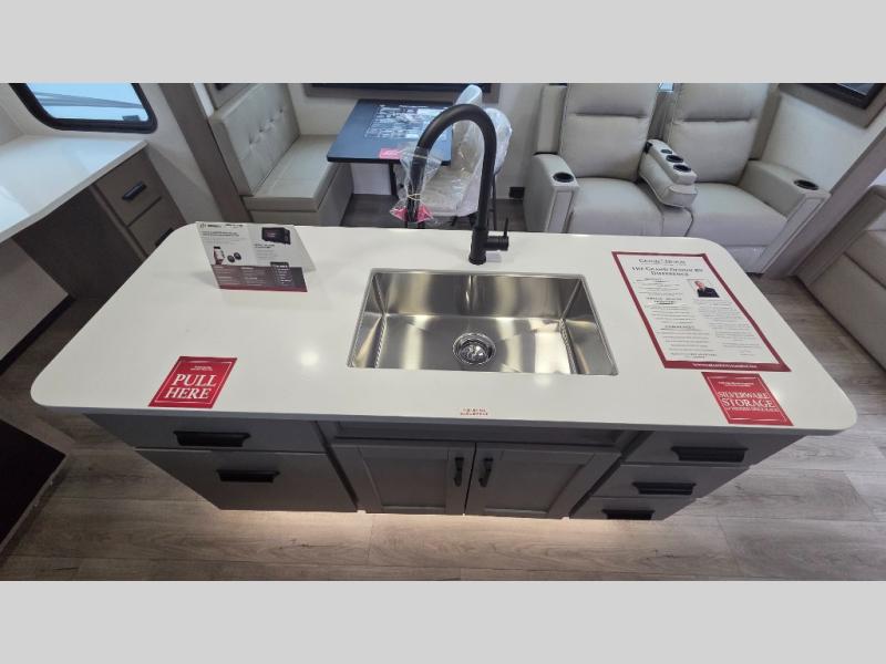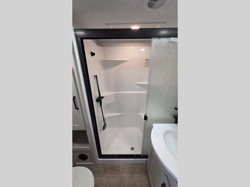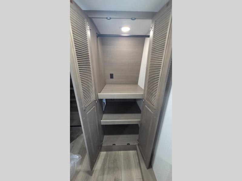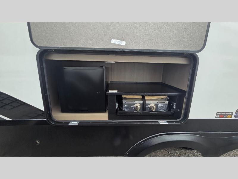 Comfortable accommodations are found throughout this fifth wheel so you can relax, unwind and enjoy your vacation be it for a weekend or a month and even when you have to work! Thanks to the rear desk with a chair and the bedroom with washer and dryer prep, you could stay in this RV as long as you like and keep all your clothes and linens clean. The front bedroom also provides a front wall wardrobe, a slide out queen bed and a dresser. The spacious shower has a glass door and there is linen storage in the full bathroom. The spacious main living and kitchen area has two slide outs with full kitchen amenities and seating with theater seats including cupholders, a booth dinette, and a tri-fold sofa. And the exterior offers an outside kitchen with a griddle, a 1.6 cu ft. refrigerator, and two power awnings!