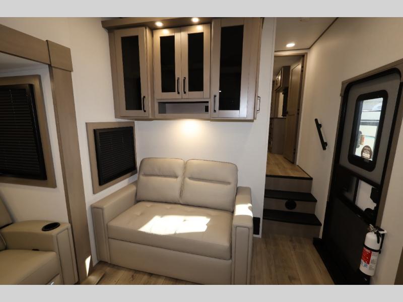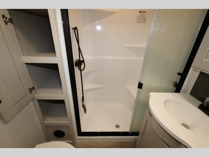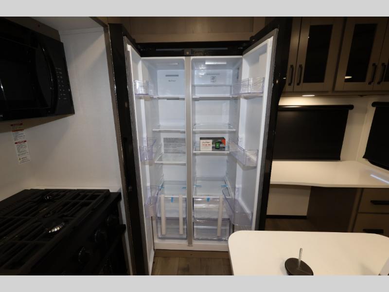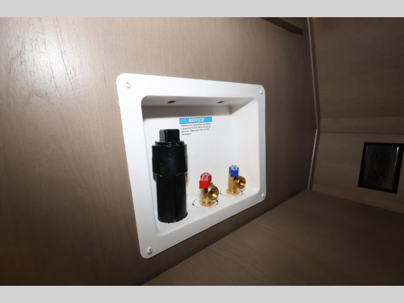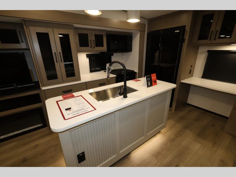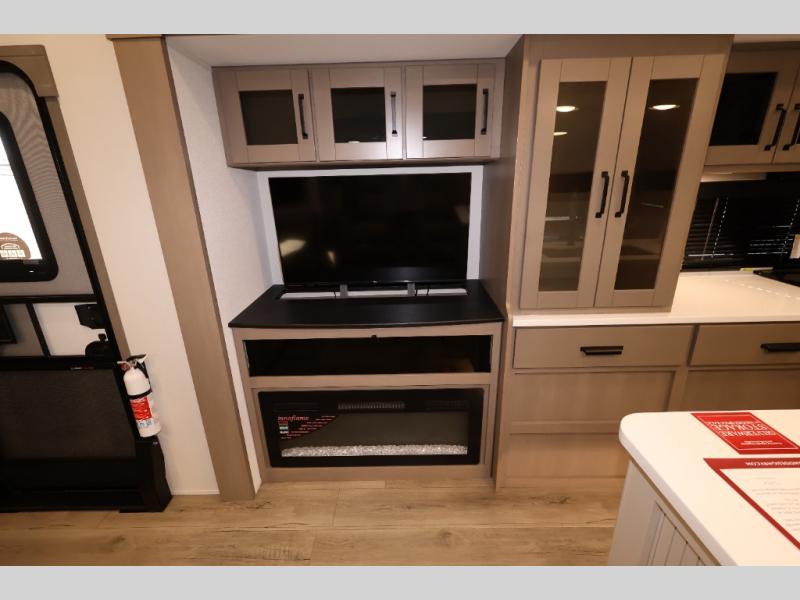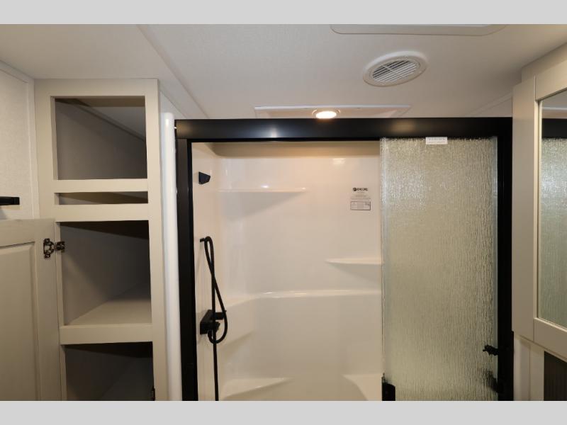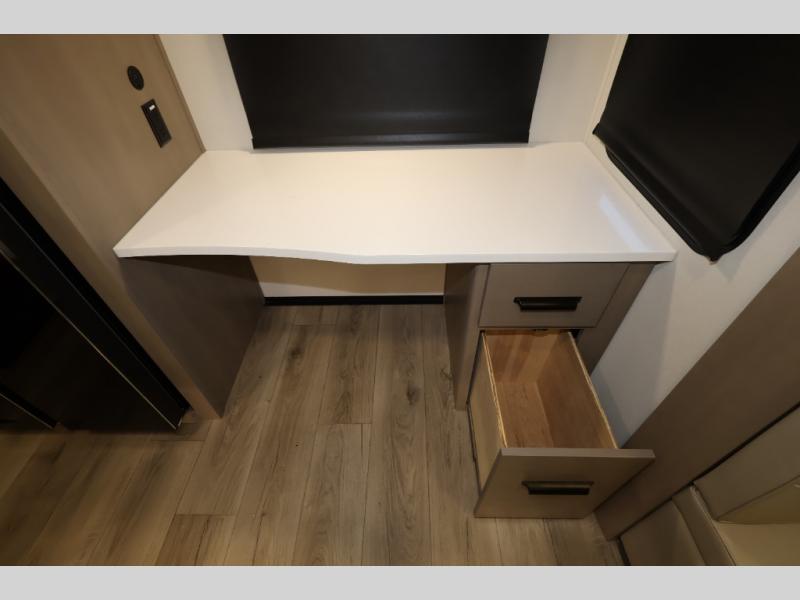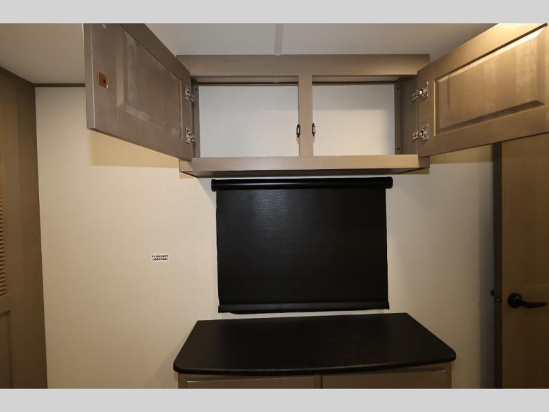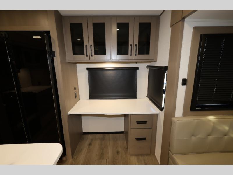 Comfortable accommodations are found throughout this fifth wheel so you can relax, unwind and enjoy your vacation be it for a weekend or a month and even when you have to work! Thanks to the rear desk with a chair and the bedroom with washer and dryer prep, you could stay in this RV as long as you like and keep all your clothes and linens clean. The front bedroom also provides a front wall wardrobe, a slide out queen bed and a dresser. The spacious shower has a glass door and there is linen storage in the full bathroom. The spacious main living and kitchen area has two slide outs with full kitchen amenities and seating with theater seats including cupholders, a booth dinette, and a tri-fold sofa. And the exterior offers an outside kitchen with a griddle, a 1.6 cu ft. refrigerator, and two power awnings!