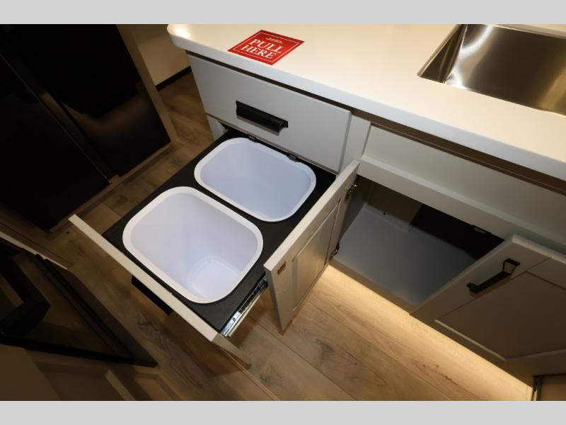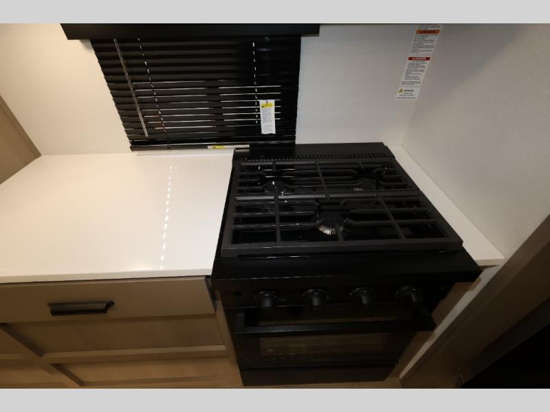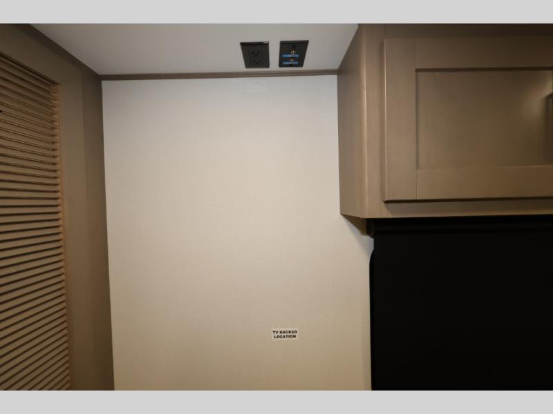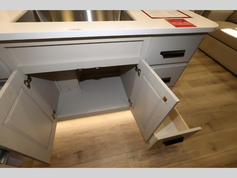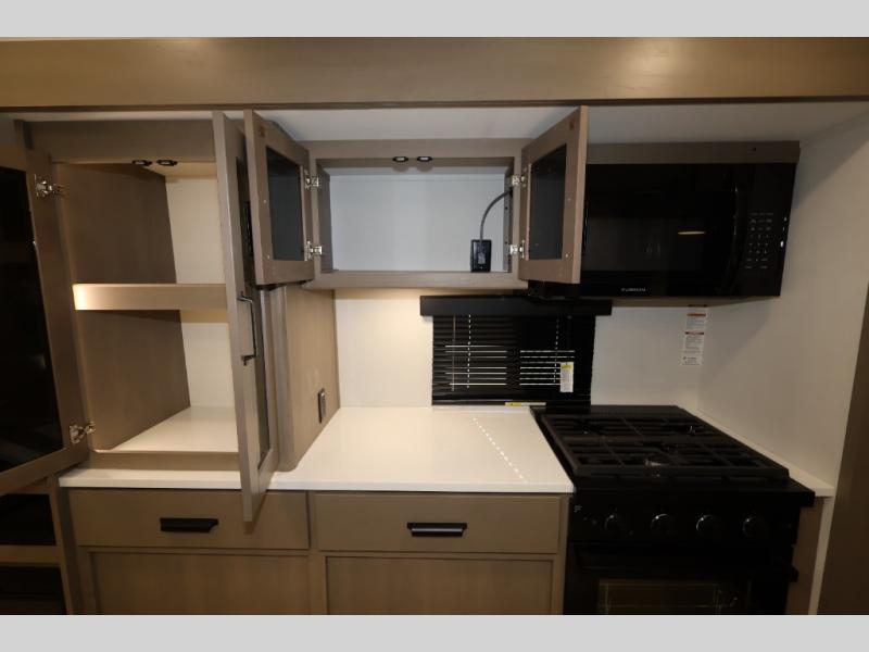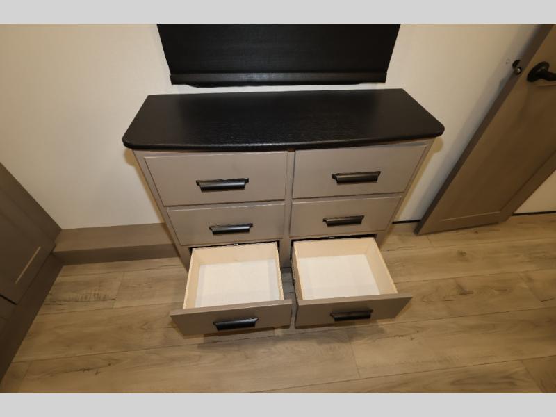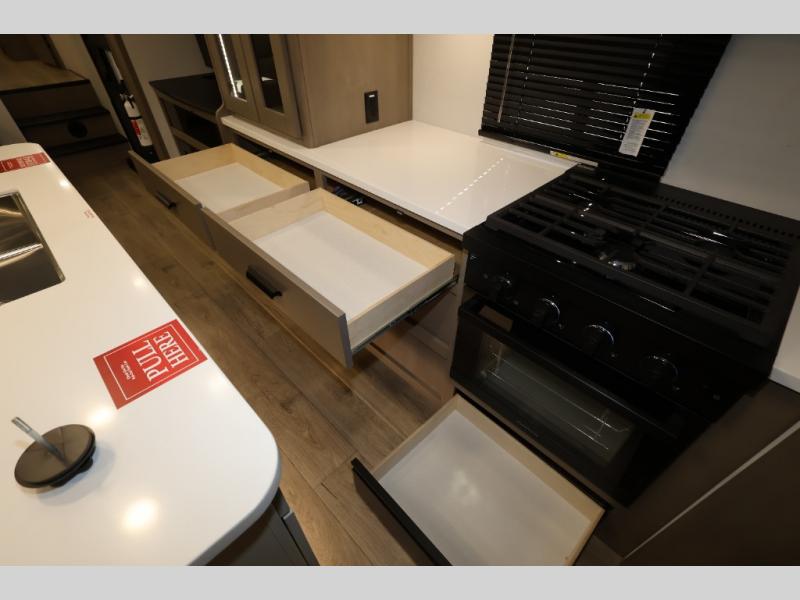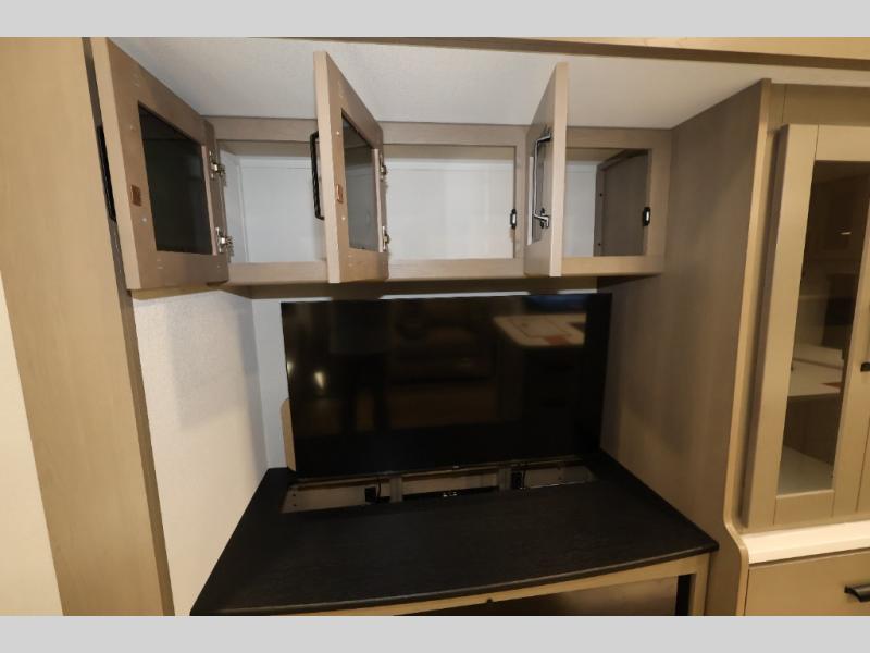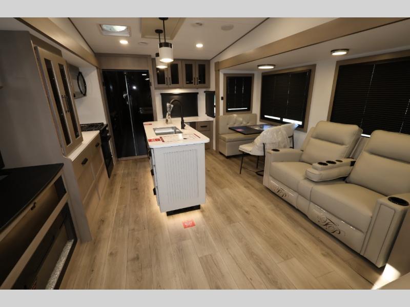 Comfortable accommodations are found throughout this fifth wheel so you can relax, unwind and enjoy your vacation be it for a weekend or a month and even when you have to work! Thanks to the rear desk with a chair and the bedroom with washer and dryer prep, you could stay in this RV as long as you like and keep all your clothes and linens clean. The front bedroom also provides a front wall wardrobe, a slide out queen bed and a dresser. The spacious shower has a glass door and there is linen storage in the full bathroom. The spacious main living and kitchen area has two slide outs with full kitchen amenities and seating with theater seats including cupholders, a booth dinette, and a tri-fold sofa. And the exterior offers an outside kitchen with a griddle, a 1.6 cu ft. refrigerator, and two power awnings!