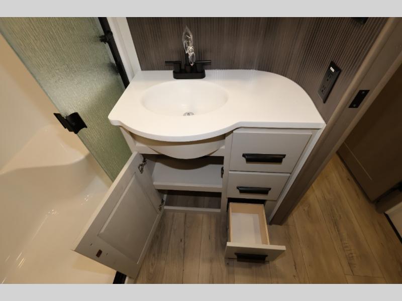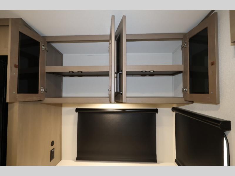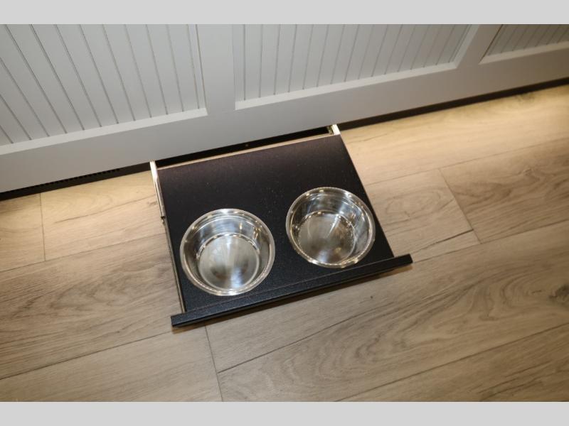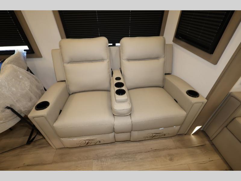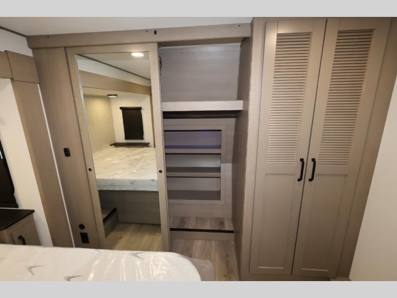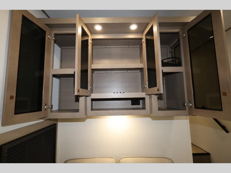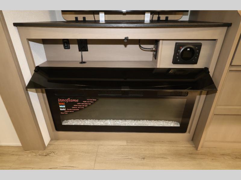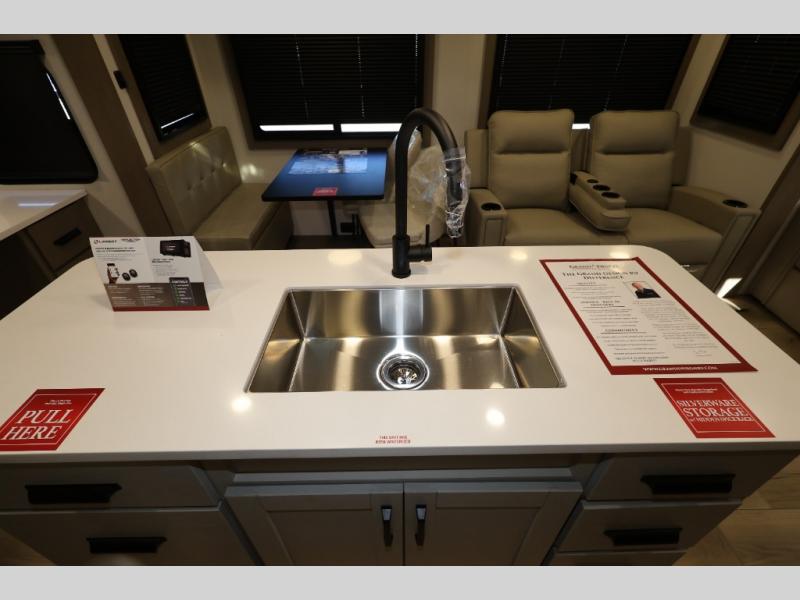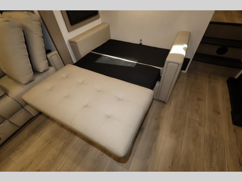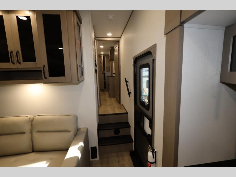 Comfortable accommodations are found throughout this fifth wheel so you can relax, unwind and enjoy your vacation be it for a weekend or a month and even when you have to work! Thanks to the rear desk with a chair and the bedroom with washer and dryer prep, you could stay in this RV as long as you like and keep all your clothes and linens clean. The front bedroom also provides a front wall wardrobe, a slide out queen bed and a dresser. The spacious shower has a glass door and there is linen storage in the full bathroom. The spacious main living and kitchen area has two slide outs with full kitchen amenities and seating with theater seats including cupholders, a booth dinette, and a tri-fold sofa. And the exterior offers an outside kitchen with a griddle, a 1.6 cu ft. refrigerator, and two power awnings!