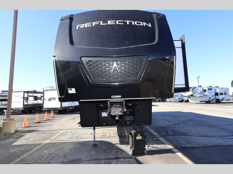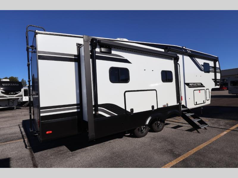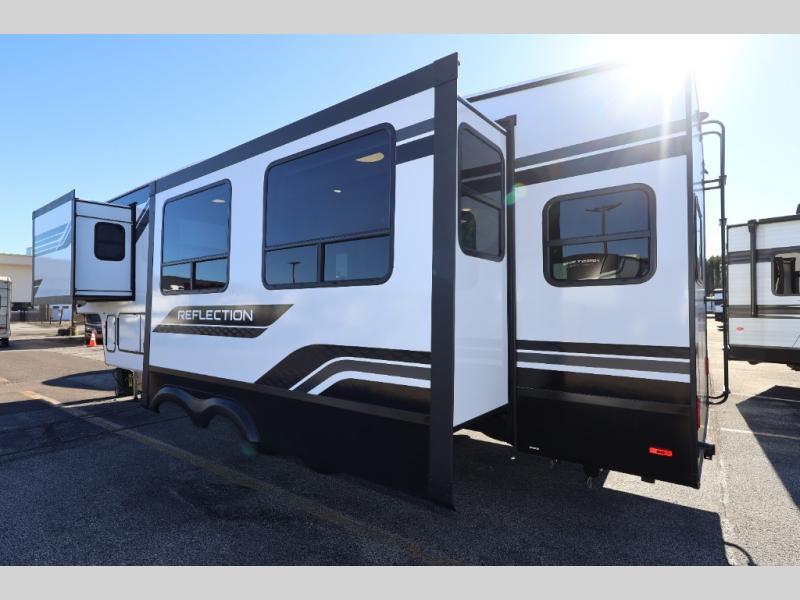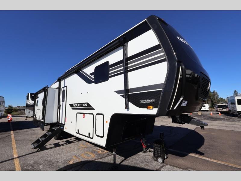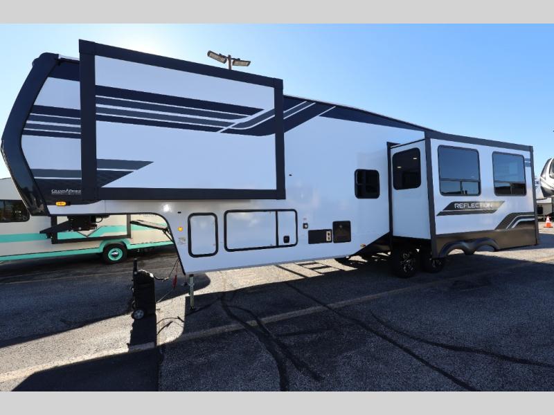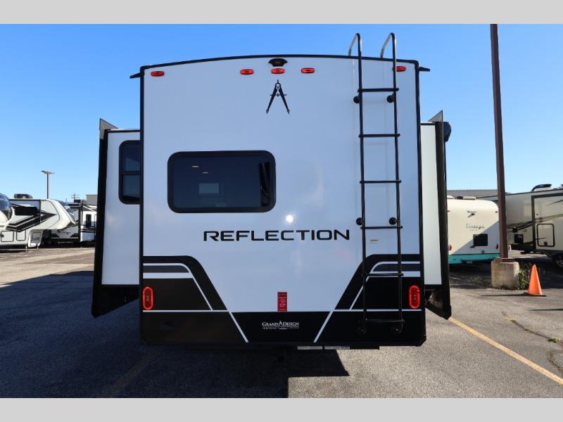 With any Reflection fifth wheel by Grand Design, you will have a solar panel for off-grid camping and a 60 amp charge controller and inverter prep, a Universal All-In-One docking station, unobstructed pass-through storage, and Goodyear Endurance tires. Each is constructed of gel coat exterior sidewalls, residential 5" truss rafters, walk-on roof decking, a fiberglass and radiant foil roof and front cap insulation plus laminated aluminum framed side walls, roof and end walls in slide rooms. Head inside to enjoy residential hardwood cabinet doors, premium Congoleum flooring, a spacious shower with a glass door, and many more comforts!