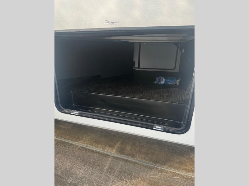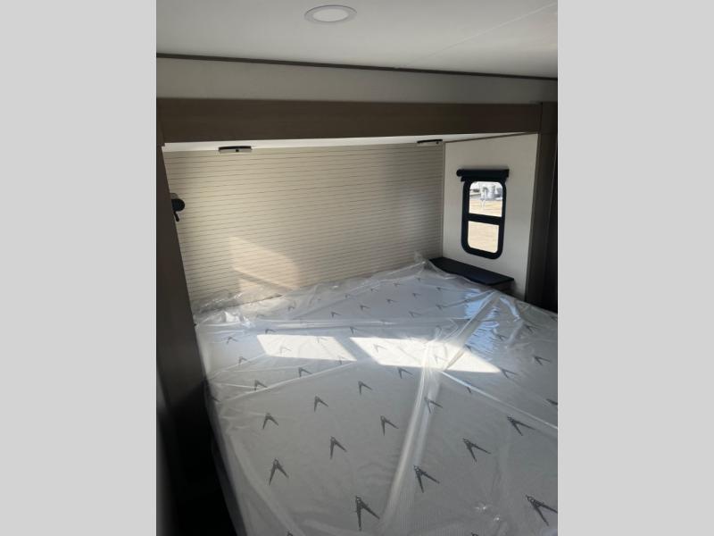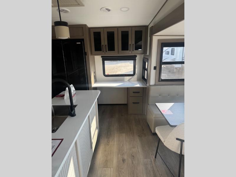 Comfortable accommodations are found throughout this fifth wheel so you can relax, unwind and enjoy your vacation be it for a weekend or a month and even when you have to work! Thanks to the rear desk with a chair and the bedroom with washer and dryer prep, you could stay in this RV as long as you like and keep all your clothes and linens clean. The front bedroom also provides a front wall wardrobe, a slide out queen bed and a dresser. The spacious shower has a glass door and there is linen storage in the full bathroom. The spacious main living and kitchen area has two slide outs with full kitchen amenities and seating with theater seats including cupholders, a booth dinette, and a tri-fold sofa. And the exterior offers an outside kitchen with a griddle, a 1.6 cu ft. refrigerator, and two power awnings!