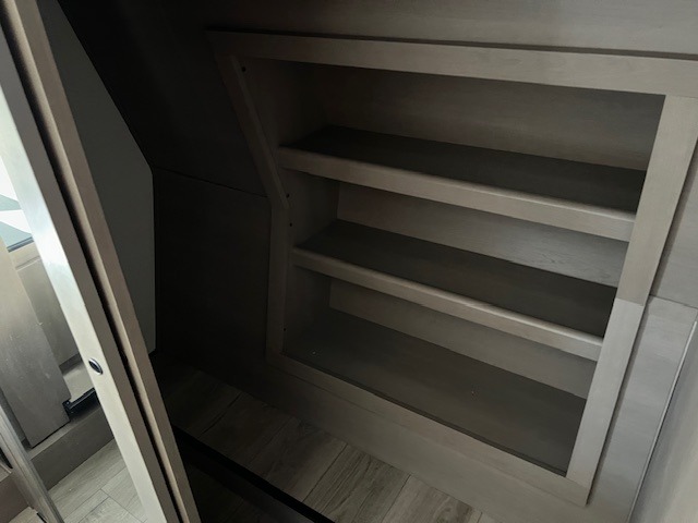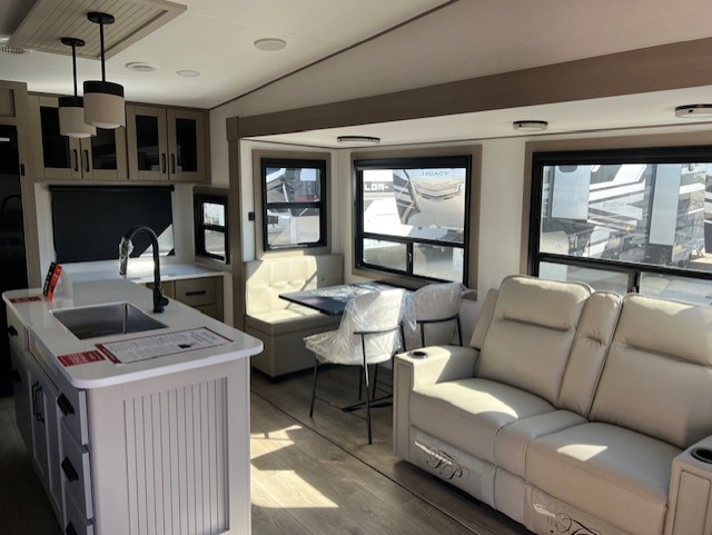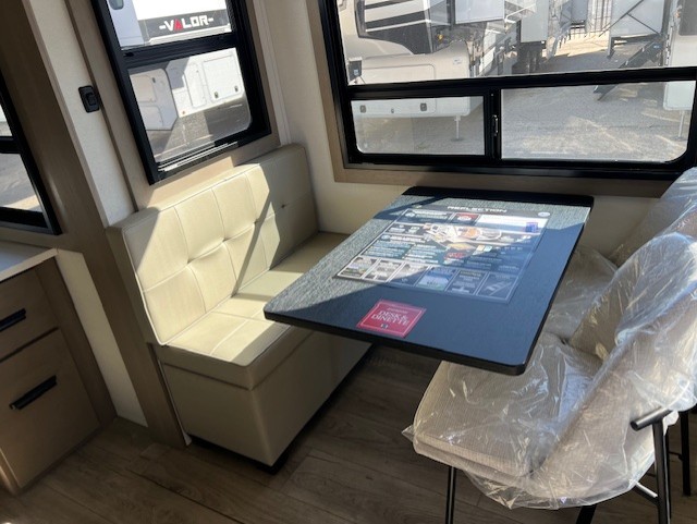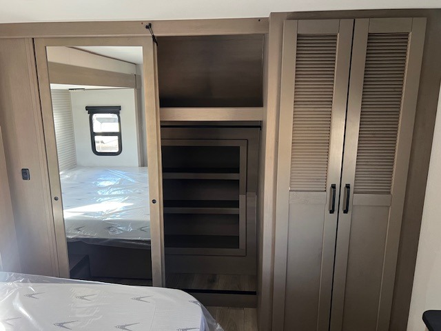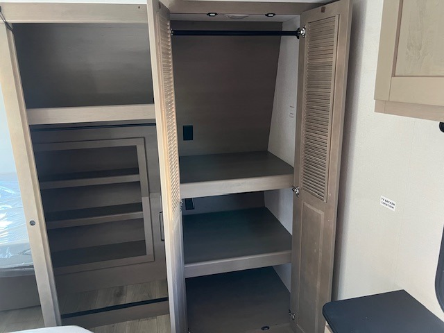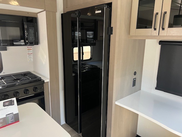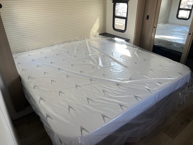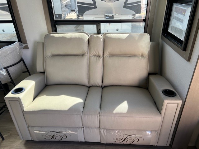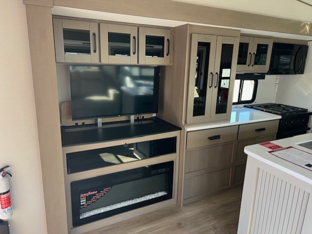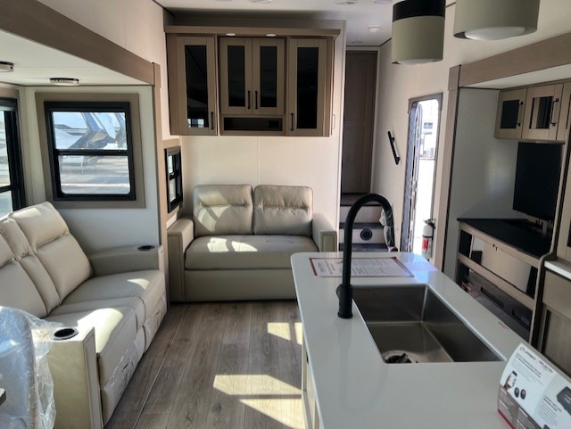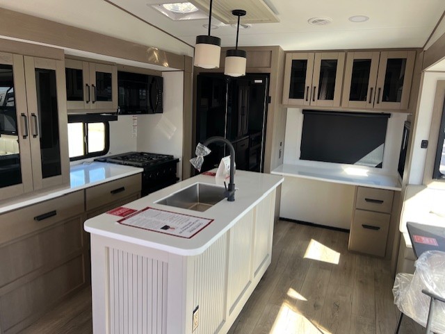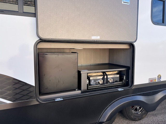Comfortable accommodations are found throughout this fifth wheel so you can relax, unwind and enjoy your vacation be it for a weekend or a month and even when you have to work! Thanks to the rear desk with a chair and the bedroom with washer and dryer prep, you could stay in this RV as long as you like and keep all your clothes and linens clean. The front bedroom also provides a front wall wardrobe, a slide out queen bed and a dresser. The spacious shower has a glass door and there is linen storage in the full bathroom. The spacious main living and kitchen area has two slide outs with full kitchen amenities and seating with theater seats including cupholders, a booth dinette, and a tri-fold sofa. And the exterior offers an outside kitchen with a griddle, a 1.6 cu ft. refrigerator, and two power awnings!
