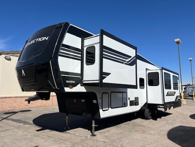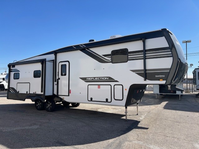 With any Reflection fifth wheel by Grand Design, you will have a solar panel for off-grid camping and a 60 amp charge controller and inverter prep, a Universal All-In-One docking station, unobstructed pass-through storage, and Goodyear Endurance tires. Each is constructed of gel coat exterior sidewalls, residential 5" truss rafters, walk-on roof decking, a fiberglass and radiant foil roof and front cap insulation plus laminated aluminum framed side walls, roof and end walls in slide rooms. Head inside to enjoy residential hardwood cabinet doors, premium Congoleum flooring, a spacious shower with a glass door, and many more comforts!