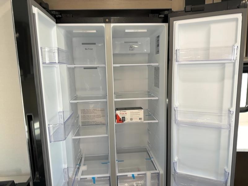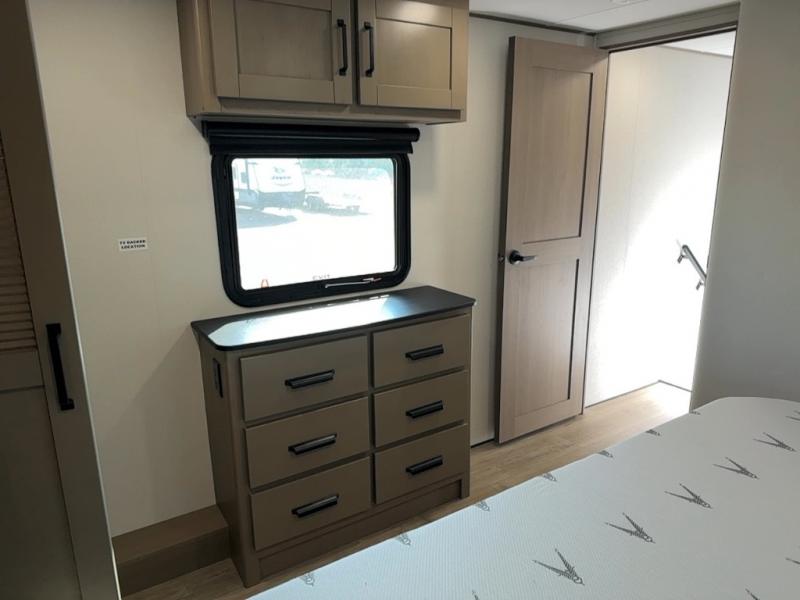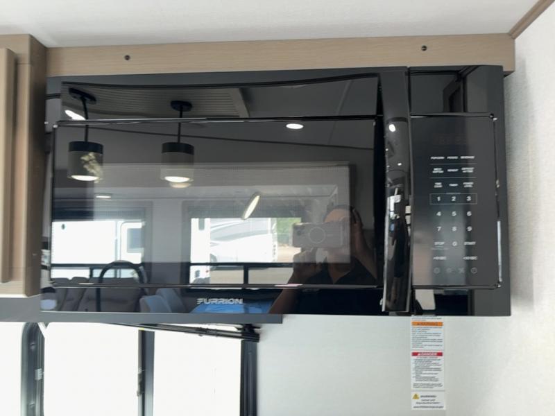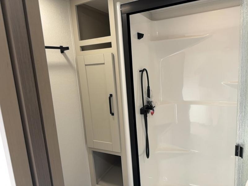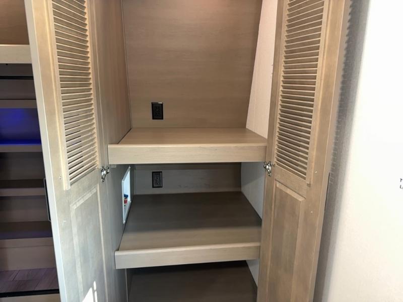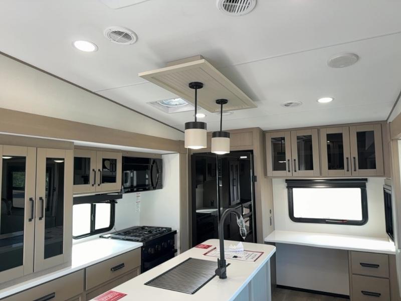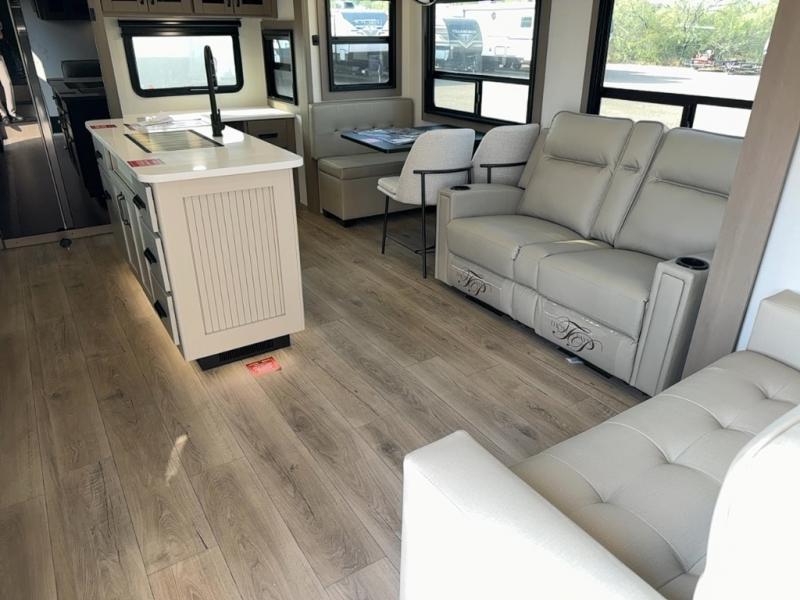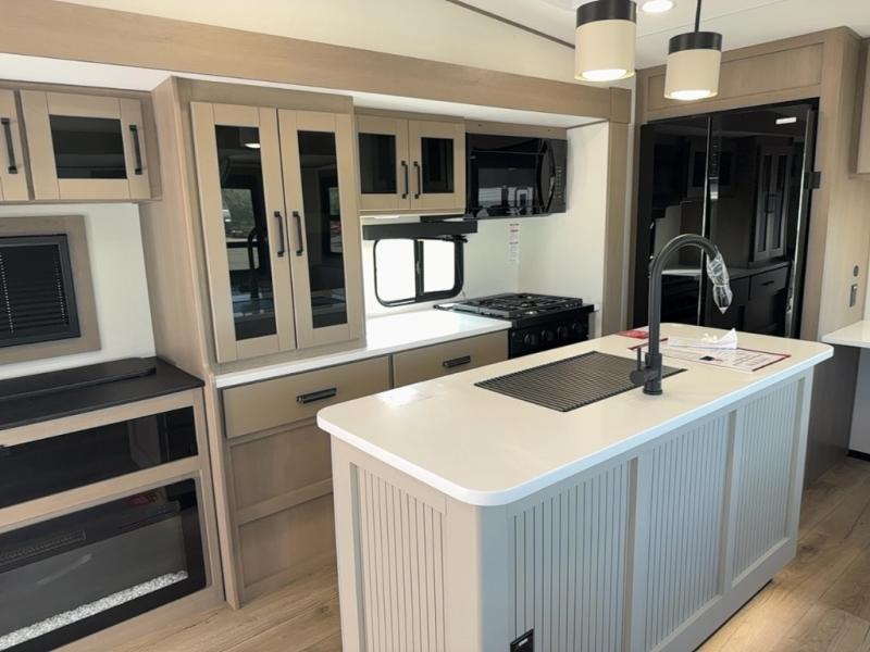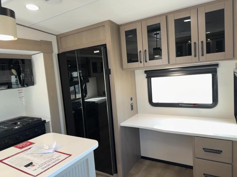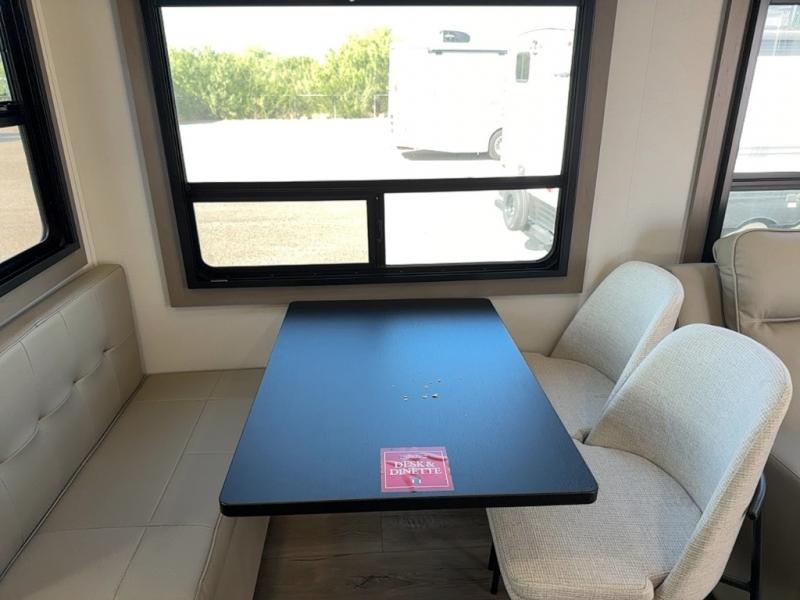 Comfortable accommodations are found throughout this fifth wheel so you can relax, unwind and enjoy your vacation be it for a weekend or a month and even when you have to work! Thanks to the rear desk with a chair and the bedroom with washer and dryer prep, you could stay in this RV as long as you like and keep all your clothes and linens clean. The front bedroom also provides a front wall wardrobe, a slide out queen bed and a dresser. The spacious shower has a glass door and there is linen storage in the full bathroom. The spacious main living and kitchen area has two slide outs with full kitchen amenities and seating with theater seats including cupholders, a booth dinette, and a tri-fold sofa. And the exterior offers an outside kitchen with a griddle, a 1.6 cu ft. refrigerator, and two power awnings!