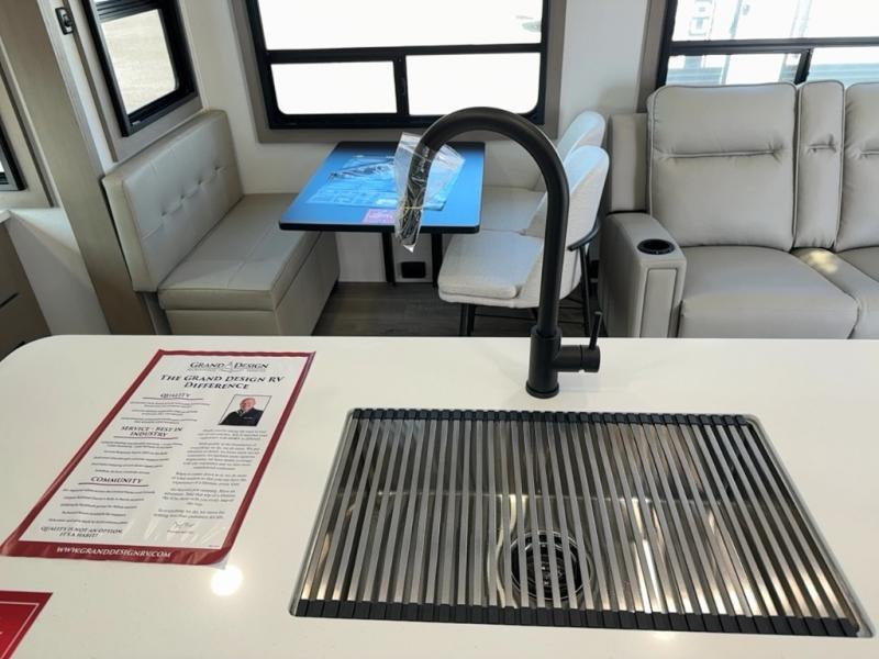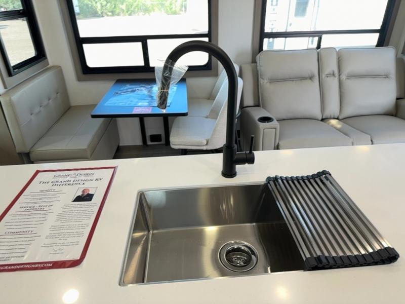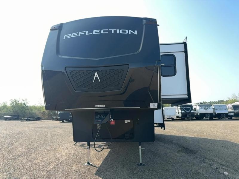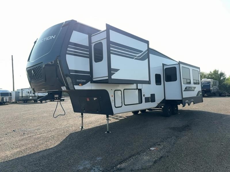 With any Reflection fifth wheel by Grand Design, you will have a solar panel for off-grid camping and a 60 amp charge controller and inverter prep, a Universal All-In-One docking station, unobstructed pass-through storage, and Goodyear Endurance tires. Each is constructed of gel coat exterior sidewalls, residential 5" truss rafters, walk-on roof decking, a fiberglass and radiant foil roof and front cap insulation plus laminated aluminum framed side walls, roof and end walls in slide rooms. Head inside to enjoy residential hardwood cabinet doors, premium Congoleum flooring, a spacious shower with a glass door, and many more comforts!