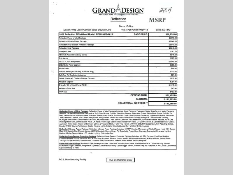 New 2026 Grand Design Reflection 320MKS Fifth Wheel