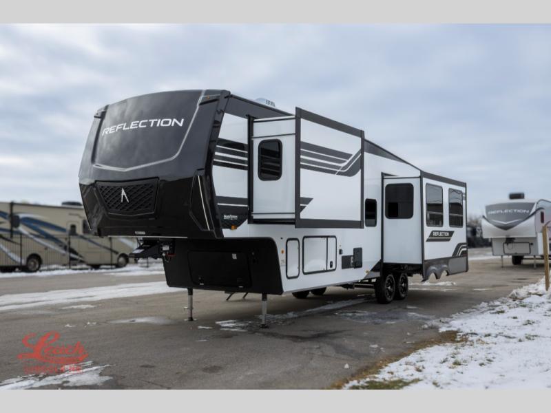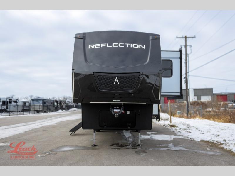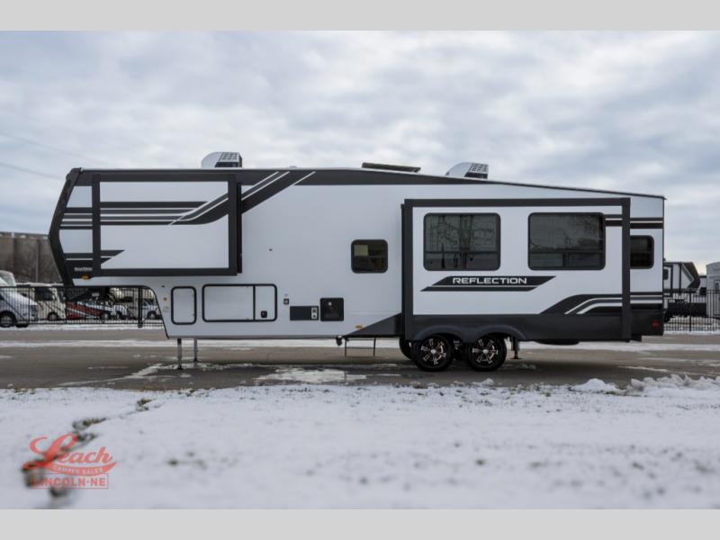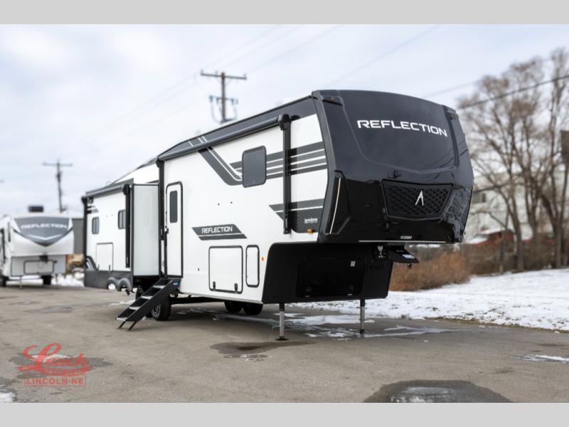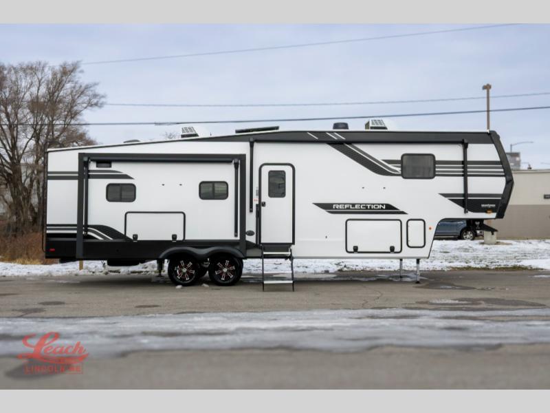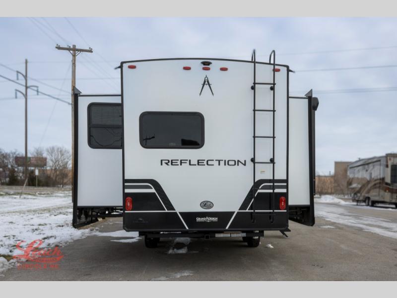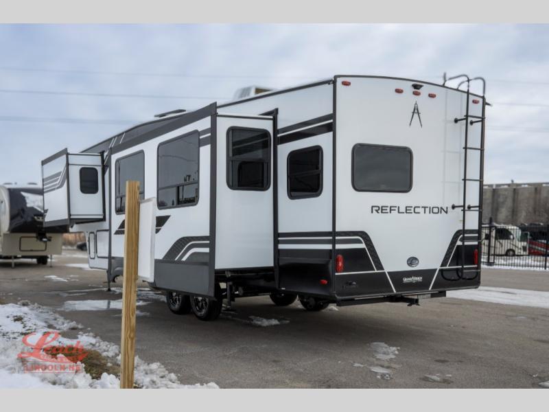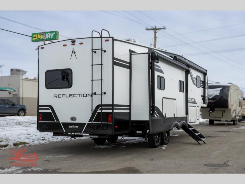 With any Reflection fifth wheel by Grand Design, you will have a solar panel for off-grid camping and a 60 amp charge controller and inverter prep, a Universal All-In-One docking station, unobstructed pass-through storage, and Goodyear Endurance tires. Each is constructed of gel coat exterior sidewalls, residential 5" truss rafters, walk-on roof decking, a fiberglass and radiant foil roof and front cap insulation plus laminated aluminum framed side walls, roof and end walls in slide rooms. Head inside to enjoy residential hardwood cabinet doors, premium Congoleum flooring, a spacious shower with a glass door, and many more comforts!